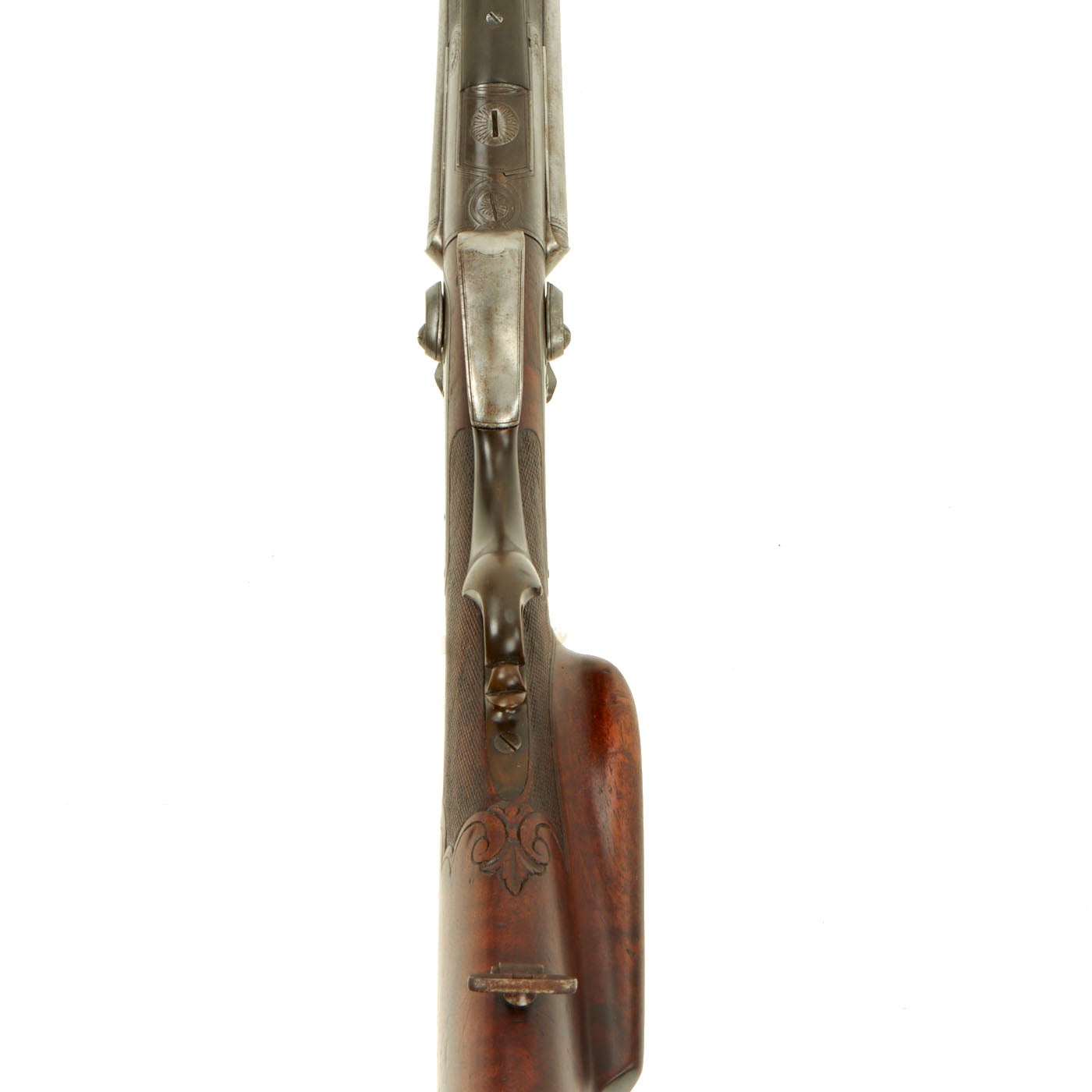 The stock has a lovely cheek piece on the left side, with checkering on the wrist bordered by foliate engraving. It looks to be made from beautiful fully figured walnut, and is of exceptional quality. There is also a checkered fore stock above the horn breech lever.