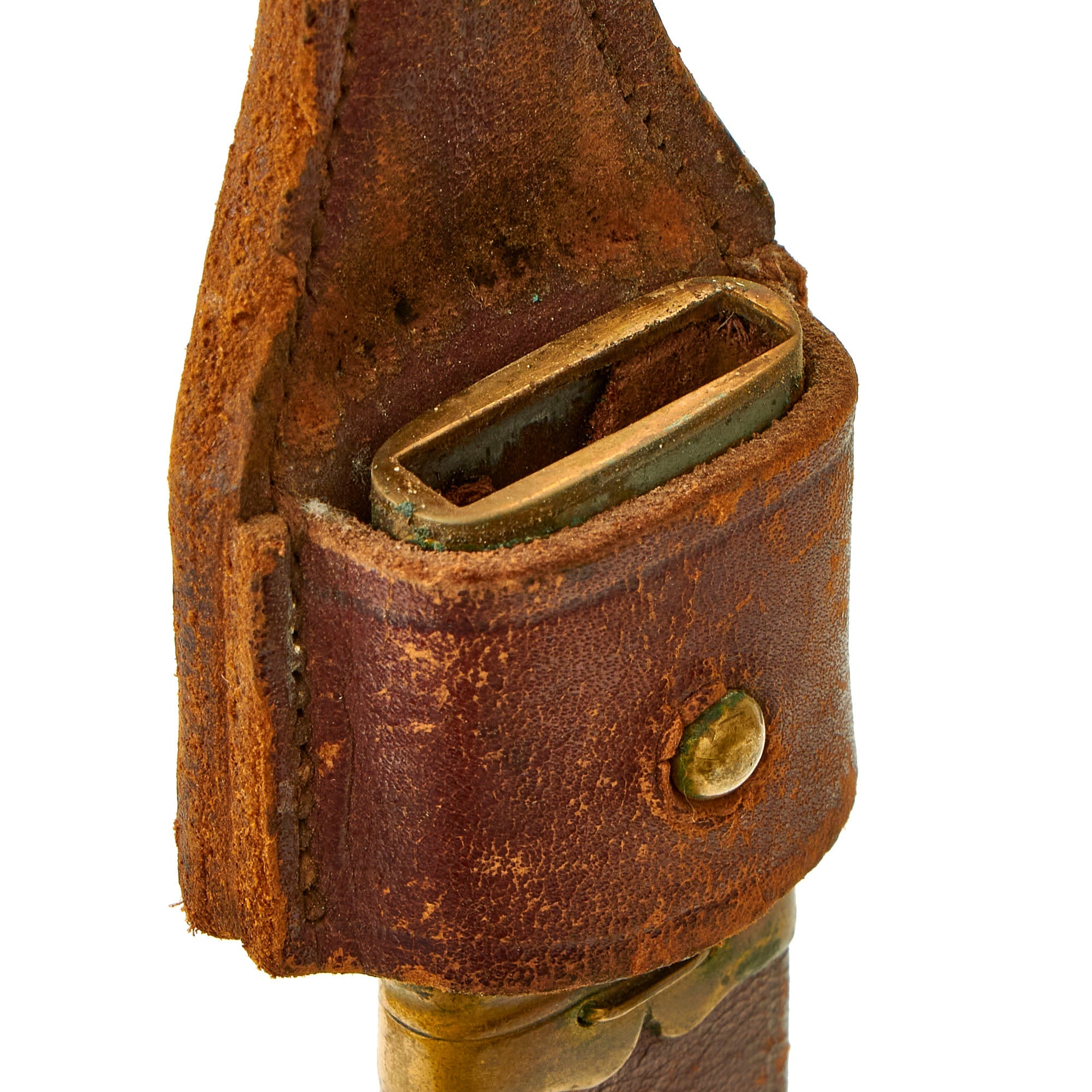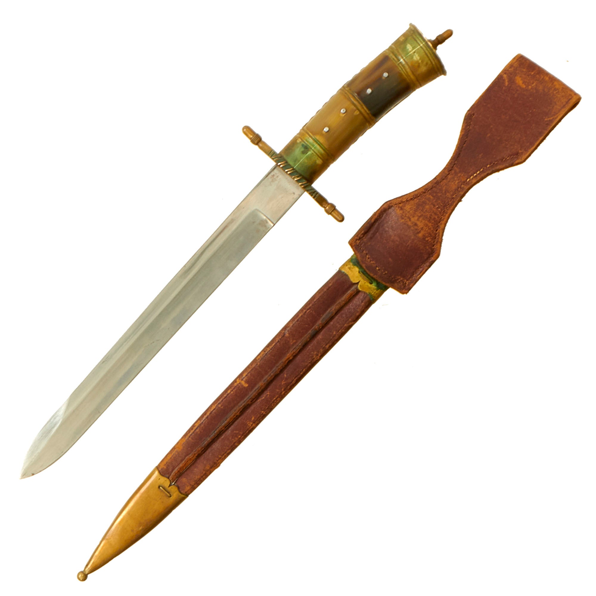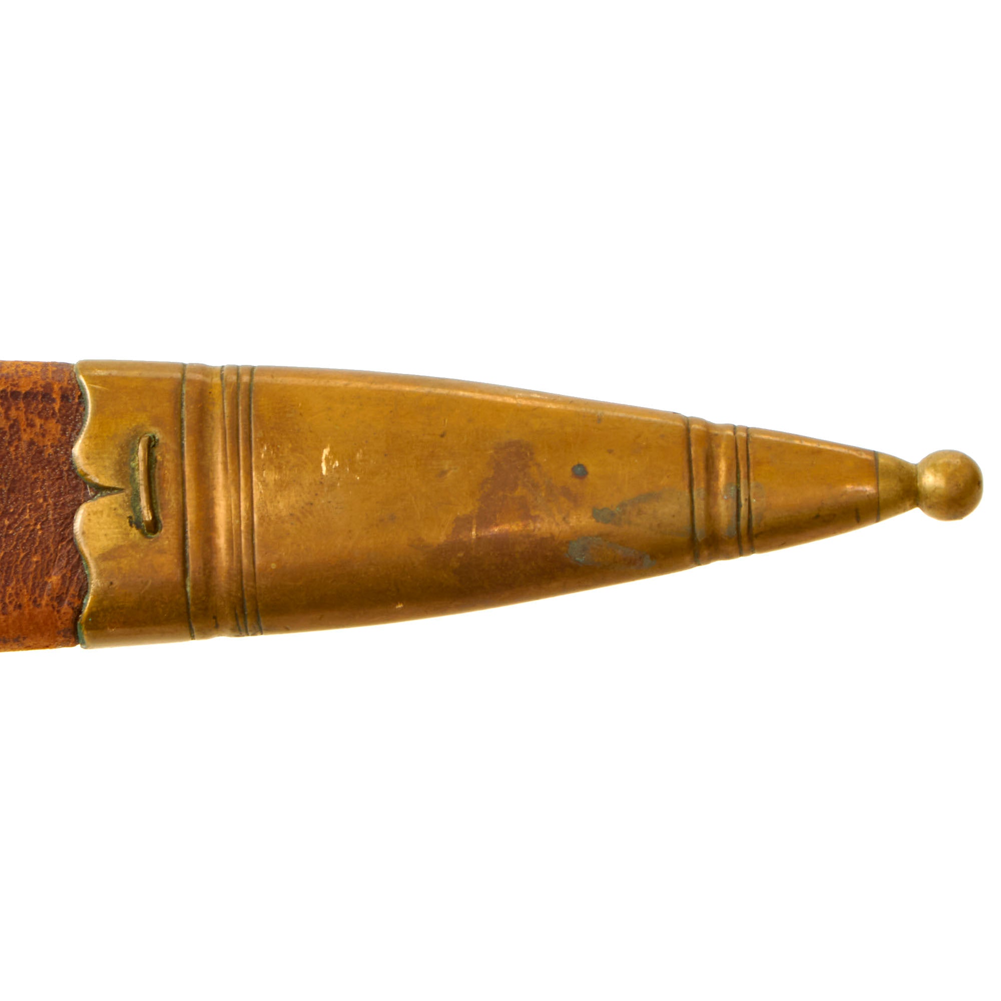 The scabbard is of the typical German style, brown leather fit with brass, with a very nice brown leather frog. It fits the knife perfect, and has a matching lightly oxidized patina on the brass.