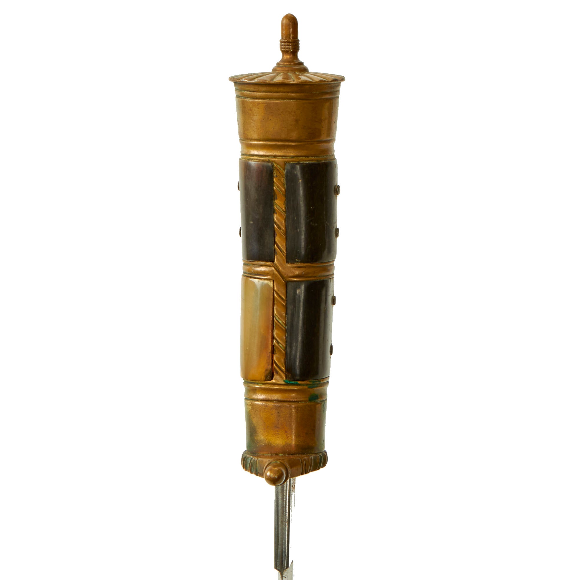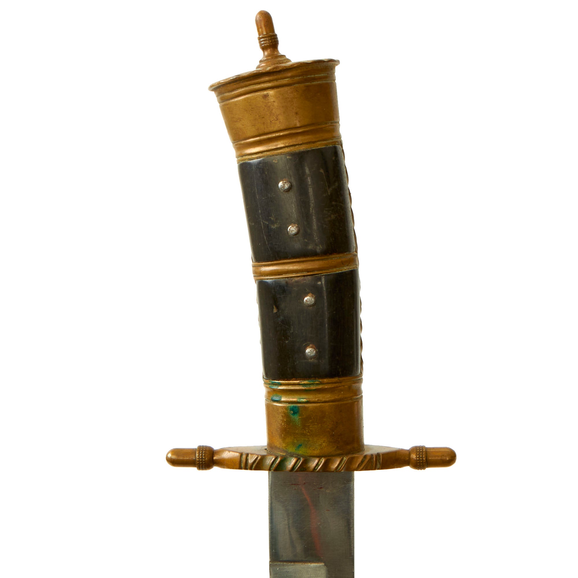 This is very nice German Interwar Era hunting knife, with design features that really hearken back to the Hirschfänger style, though definitely in a simplified form. It has art deco style acorn finials on the straight crossguard, and on the end of the slightly curved handle, which has horn grip panels. The knife's fittings are all brass, and show the typical German ornamented style, especially on the bottom of the pommel. It comes with a lovely brass fit leather scabbard in a German style belt frog.