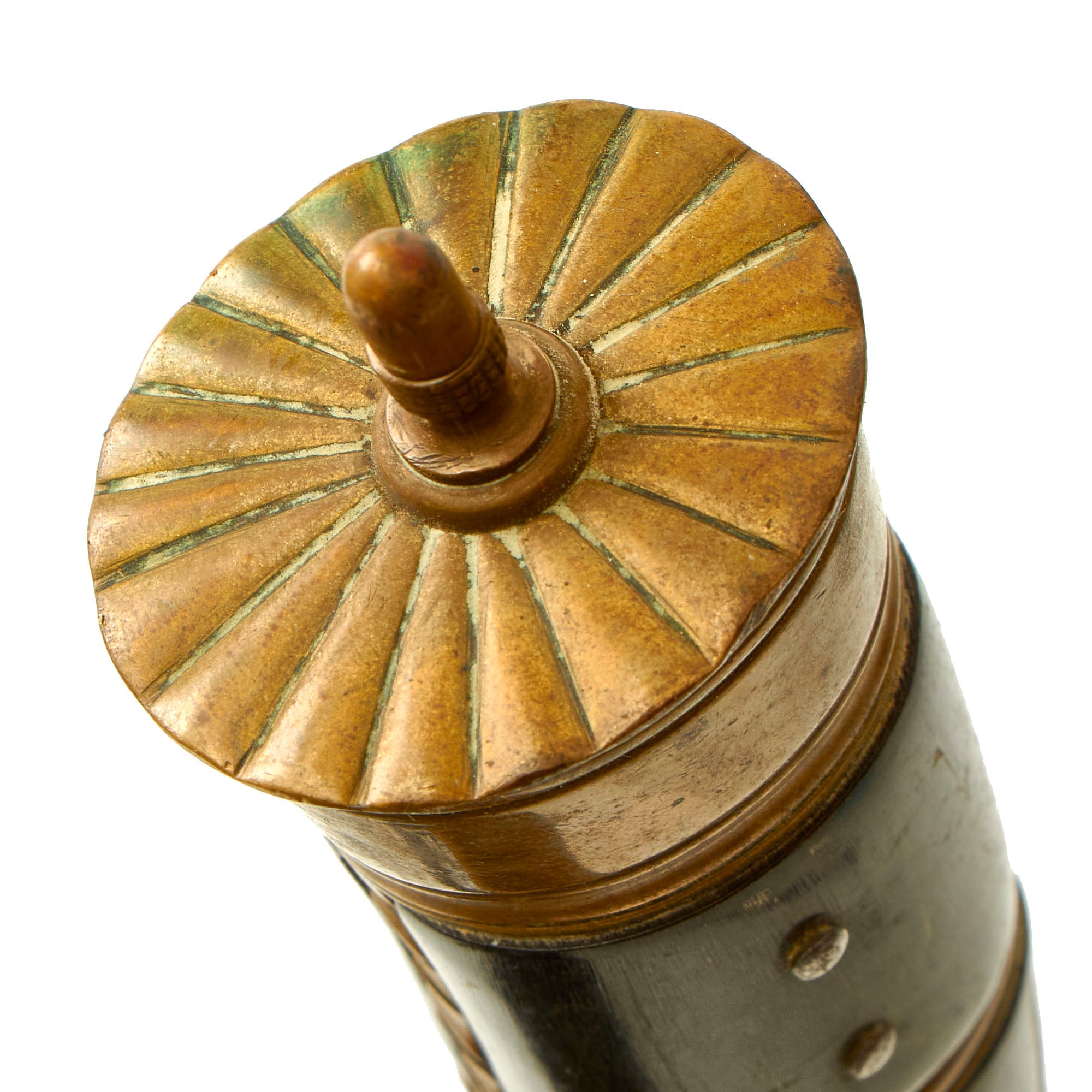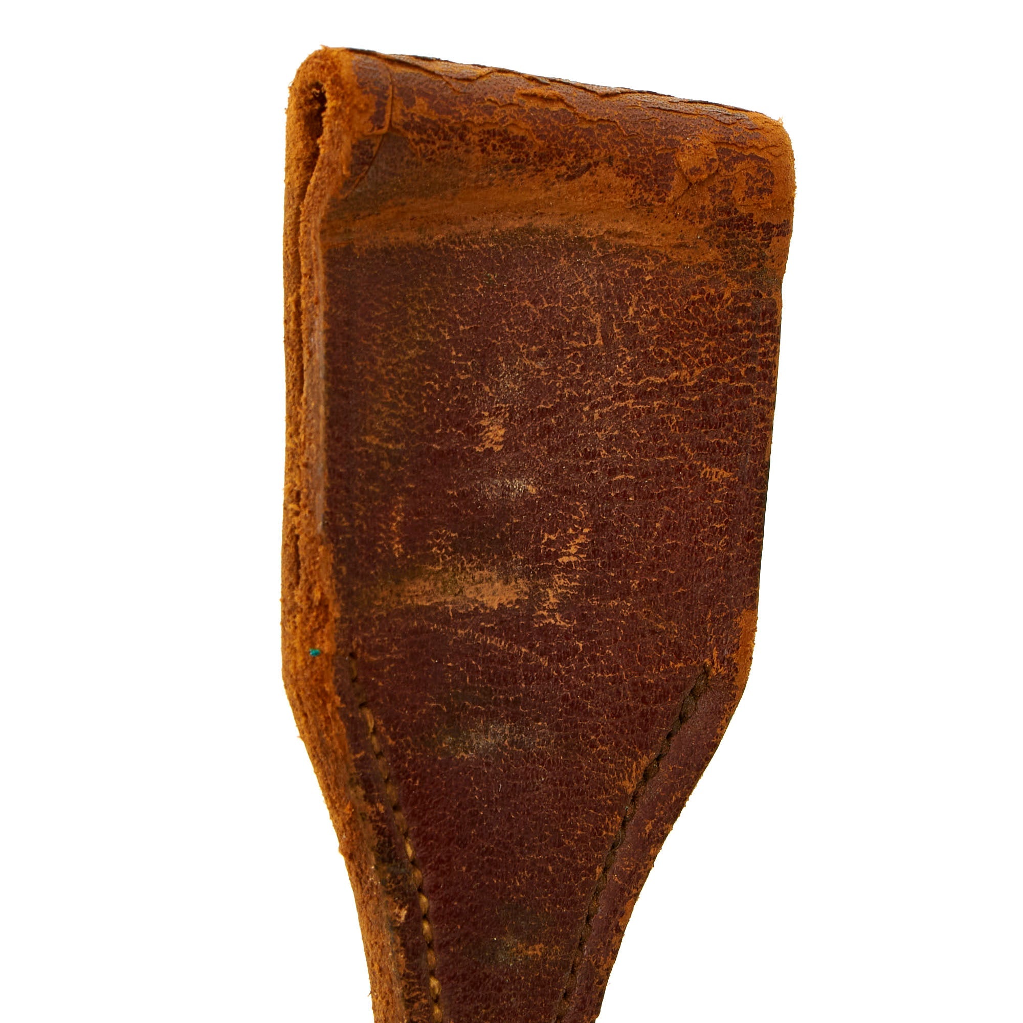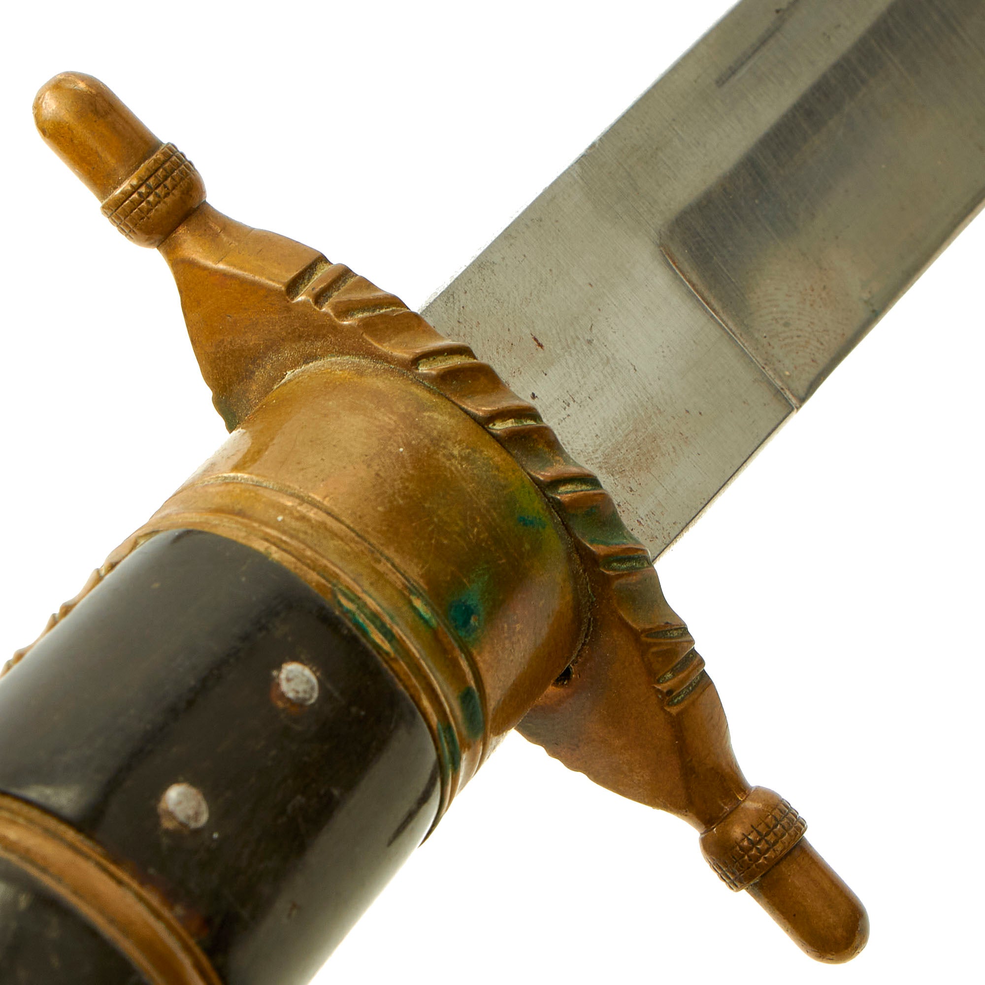 The blade is a standard straight spear-point example, single edged with a false edge on the spine side. It is quite sturdy, measuring 4.6mm thick at the ricasso, and features a hollow ground cutting edge. This would have been suitable for use against both game and we suspect also enemy combatants. It is in very good condition, still showing the original factory final polish grind on almost the entire blade, with little sign of sharpening. There is just a it of oxidation in areas.