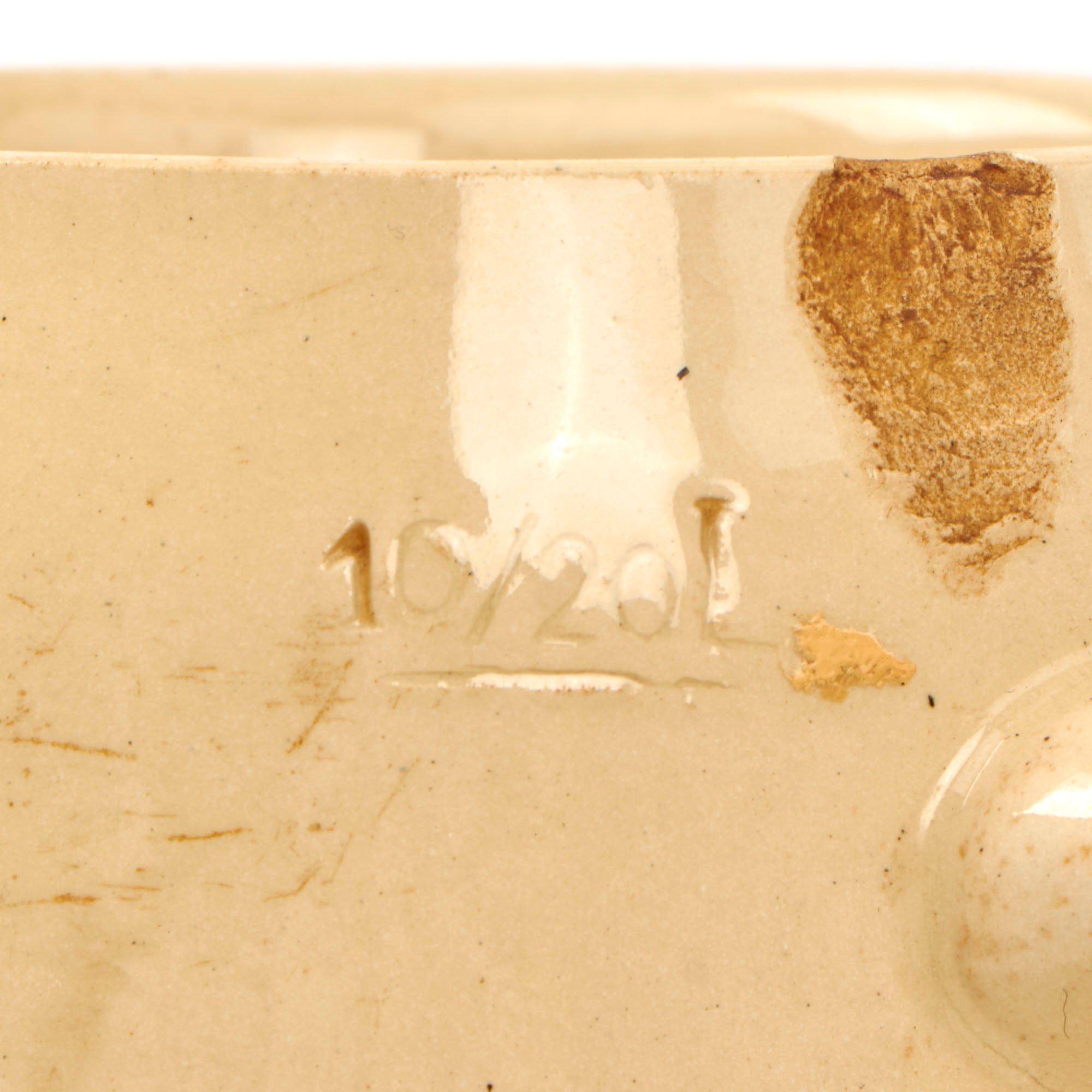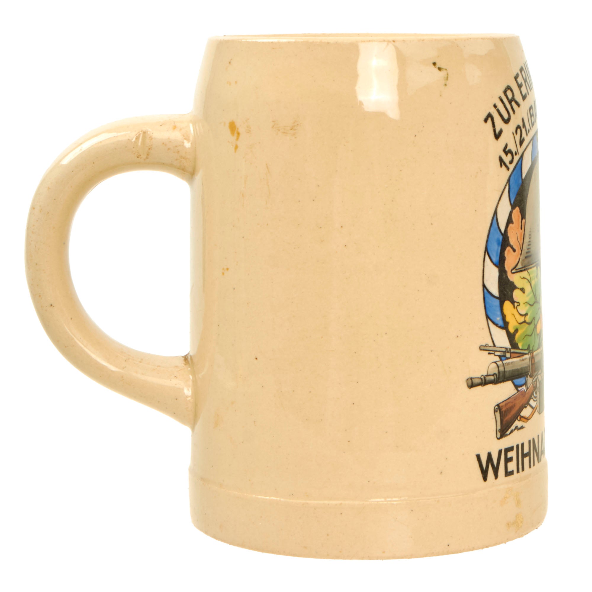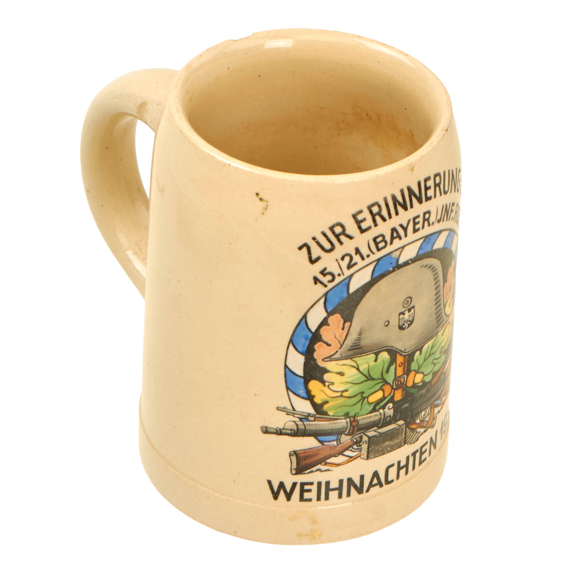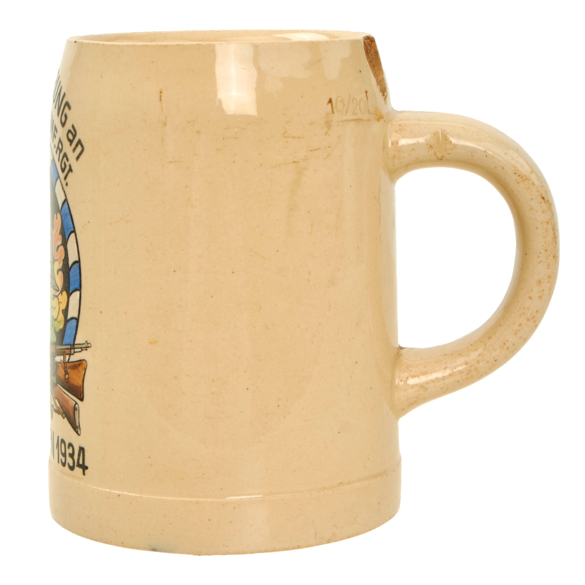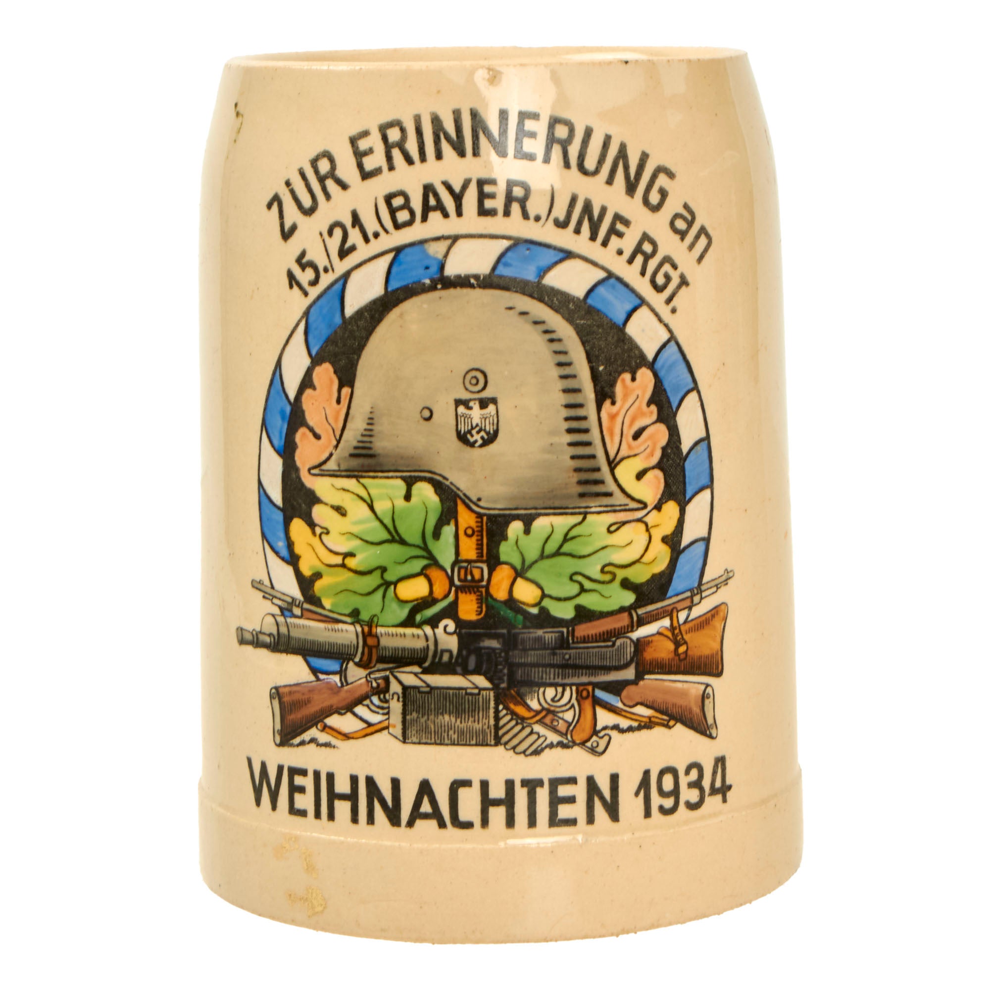 The Design of the emblem shows a typical German Stahlhelm (Steel helmet) with the Bavarian State colors decal, over a Maxim 08/15 and Mauser GEW98. There are oak leaves and acorns in the background, along with a lovely blue and white border, again the Bavarian State colors. It should be noted however that the helmet bears the NSDAP Heer shield, as this was made during the transitional period before the creation of the Wehrmacht in 1935. The side of the Stein is stamped 10/20L, for a half liter, and measures 5 inches tall and 3 3/4 inches wide.