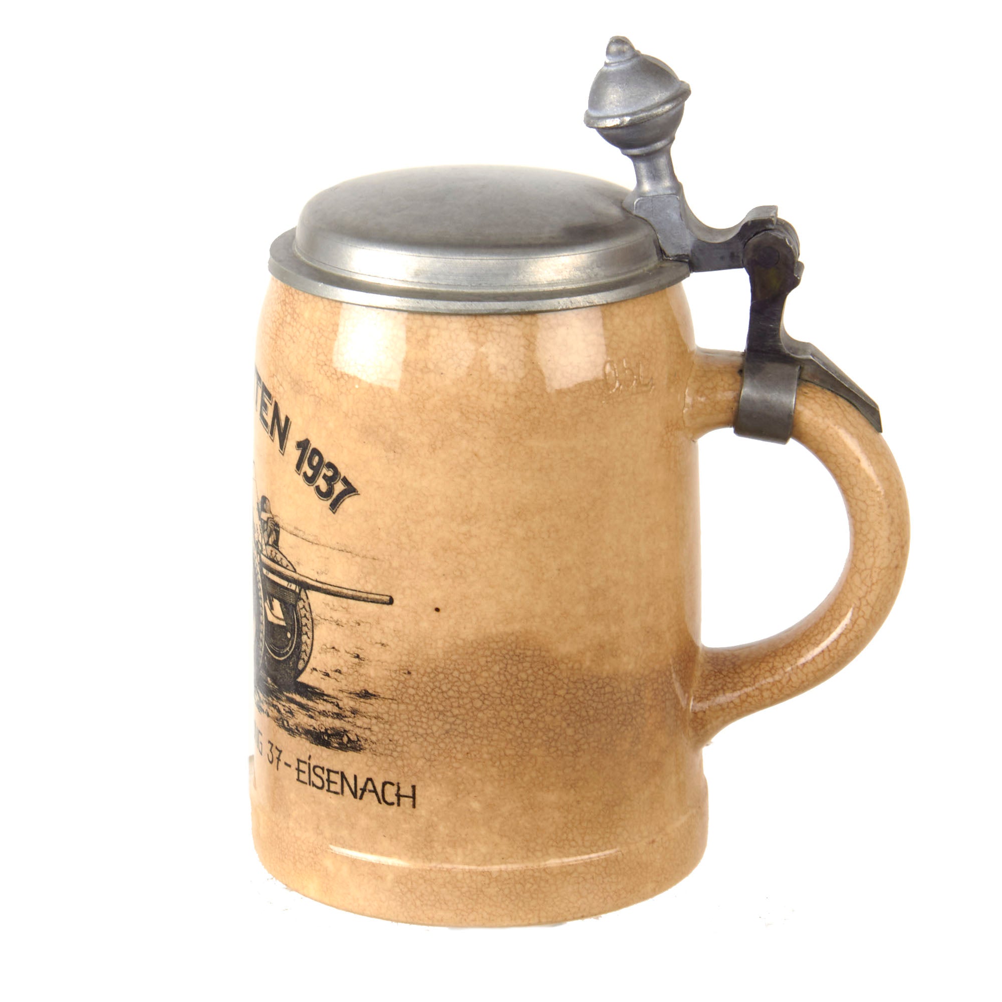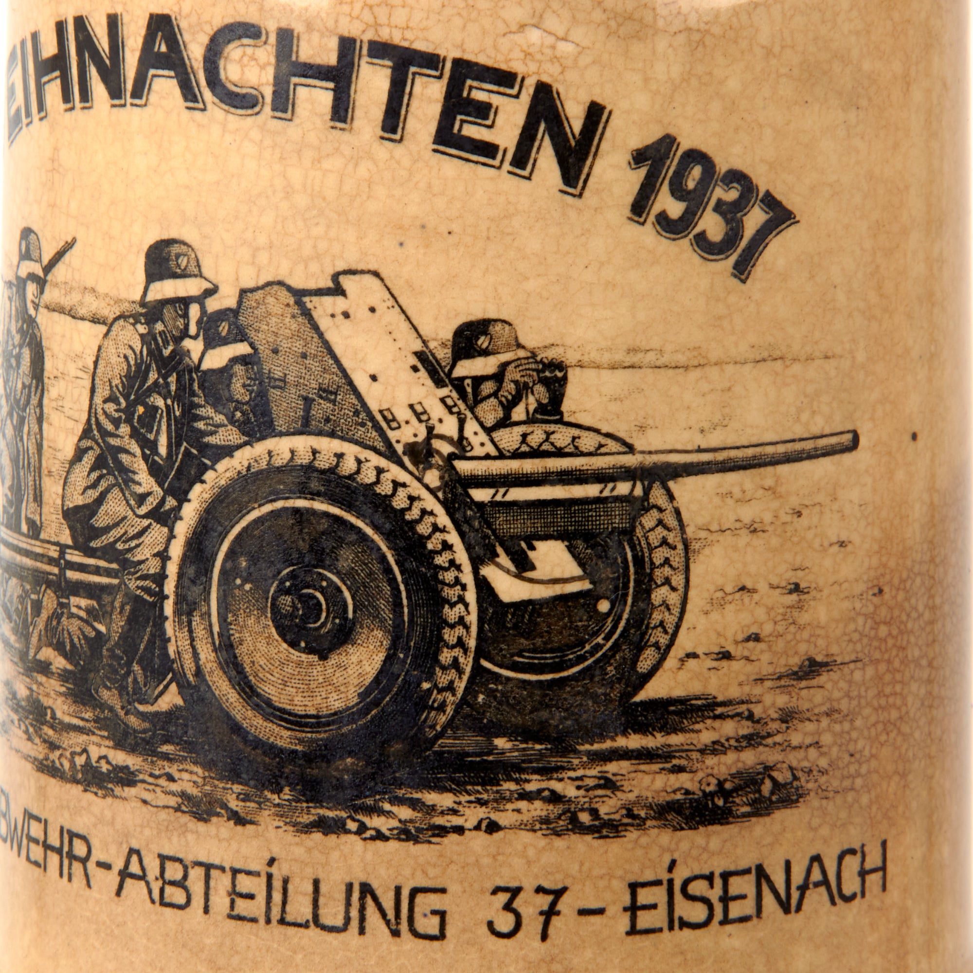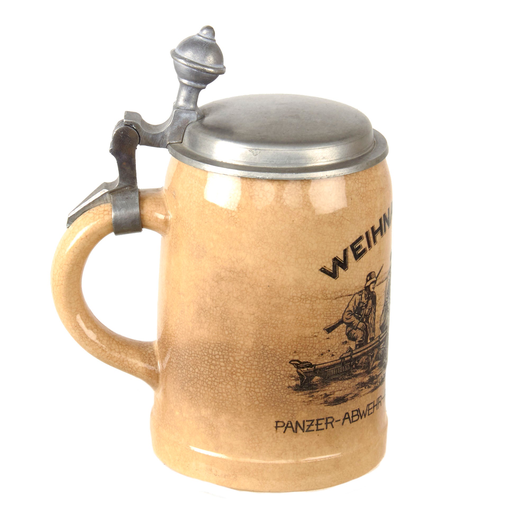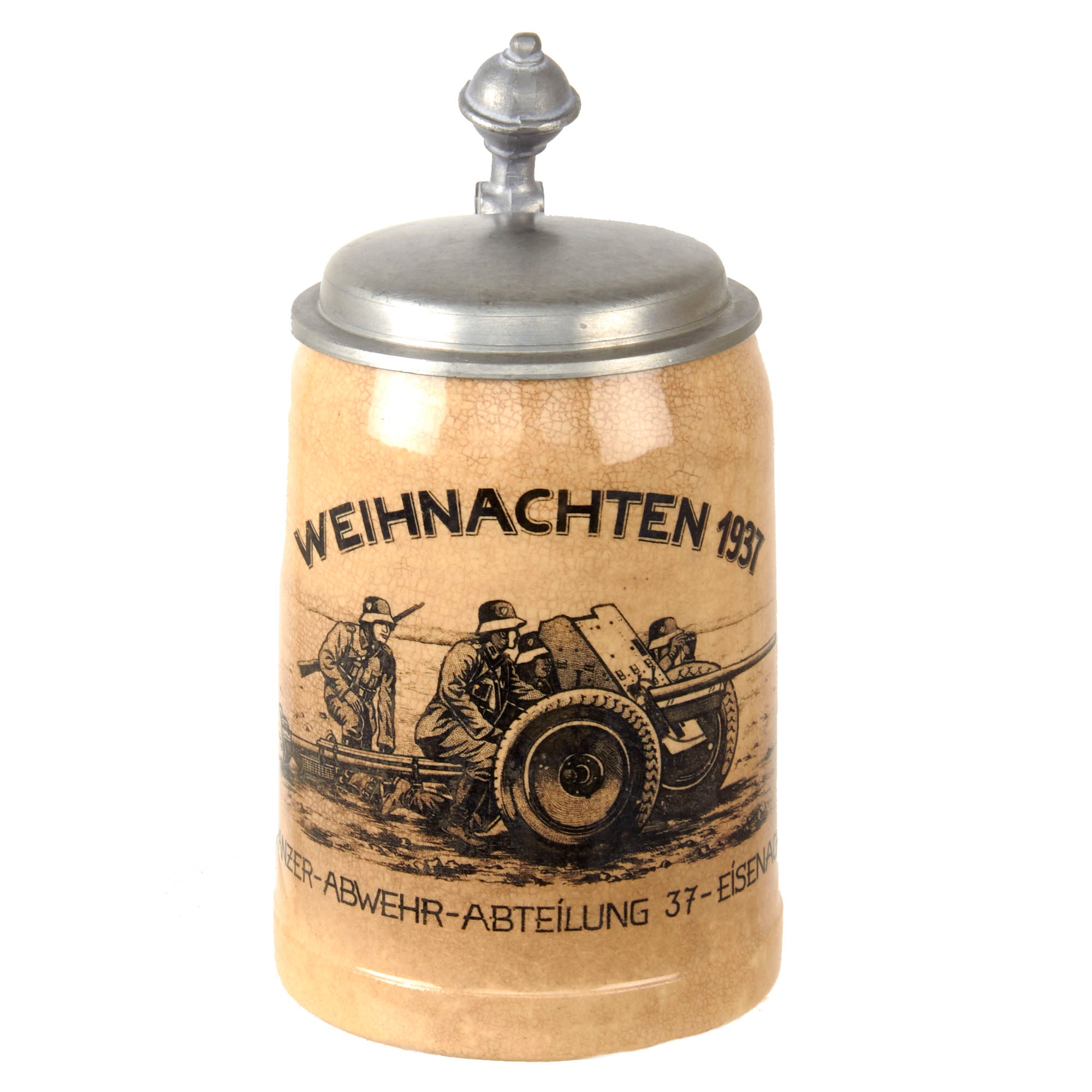 This is a very high quality original stein, named on the side to the Panzer-Abwehr-Abteilung 37-Eisenach, or the Anti-Tank Battalion 37. It is marked with Weihnachten 1937, and there is a depiction of an anti-tank gun crew. This stein also has a lovely pewter lid, with a ball on the end. It is in good shape, though there is a crack at where it is attached to the top part of the handle.