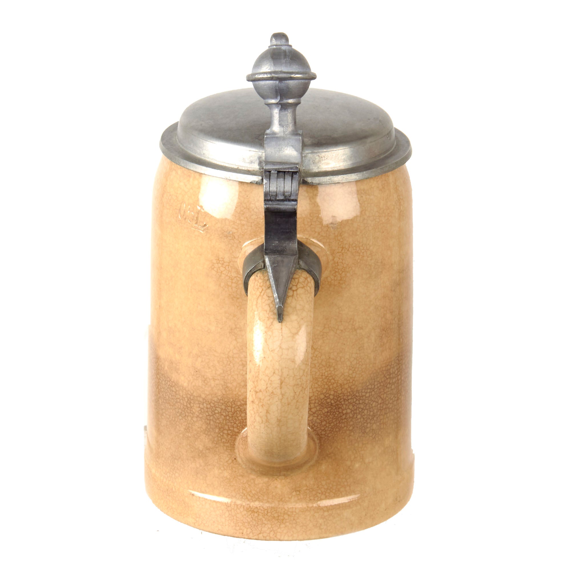 The stein is stamped 0,5 L for half of a liter, and measures 6 1/2 inches tall and 3 3/4 inches wide. The stein really is quite lovely, and also in great shape, with lovely checking in the clear glaze, and a great lid.
