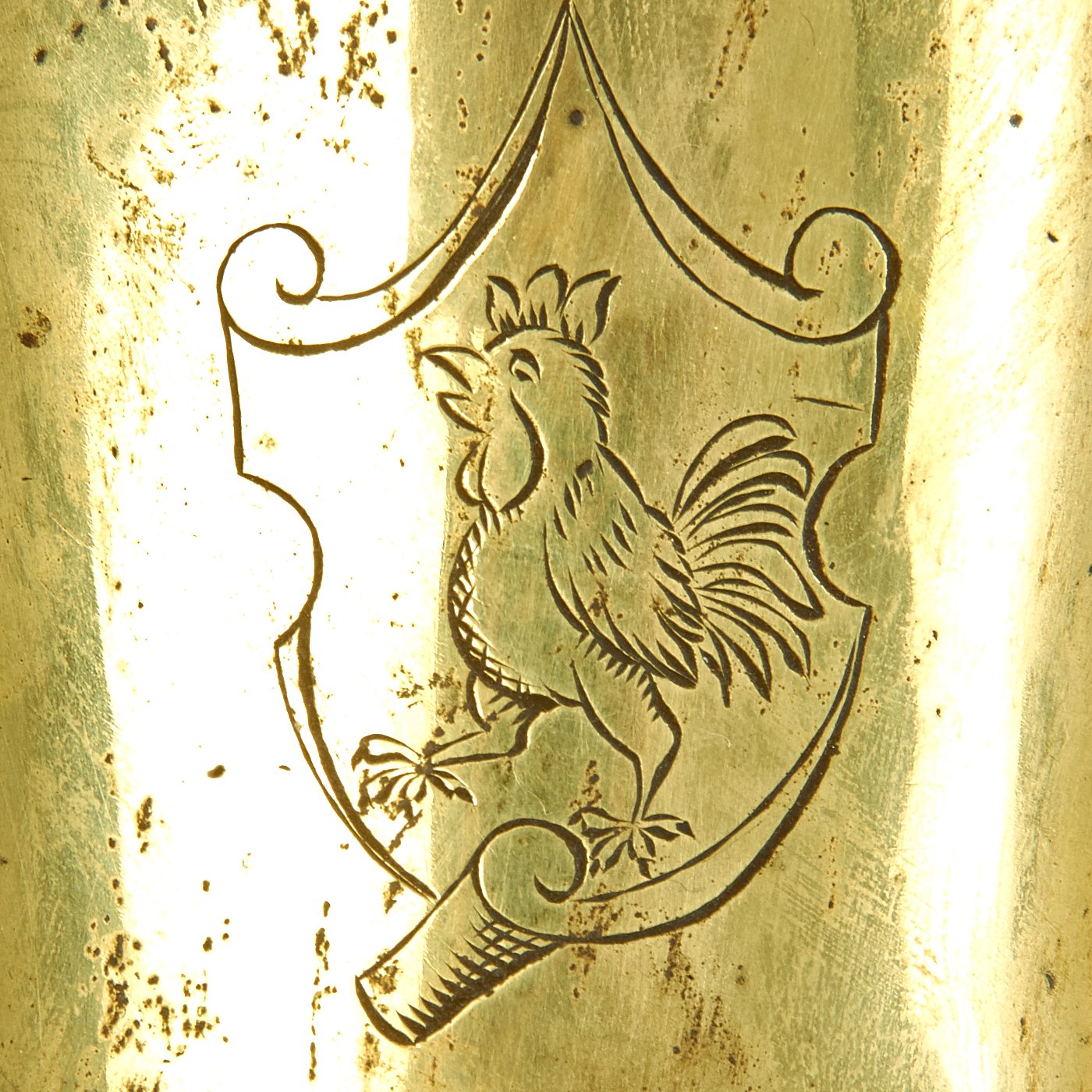 Original Items: One of a Kind Pair. These look as if they were worn by ALLADIN but we are assured that is NOT the case. These, often known as CONQUISTADOR STIRRUPS, date to the late 17th century and are known to have been in the HAHN family of Pomerania and Mecklenburg in that they displays the family Coat of arms. This takes the form of a ROOSTER, which in German is a “HAHN”.