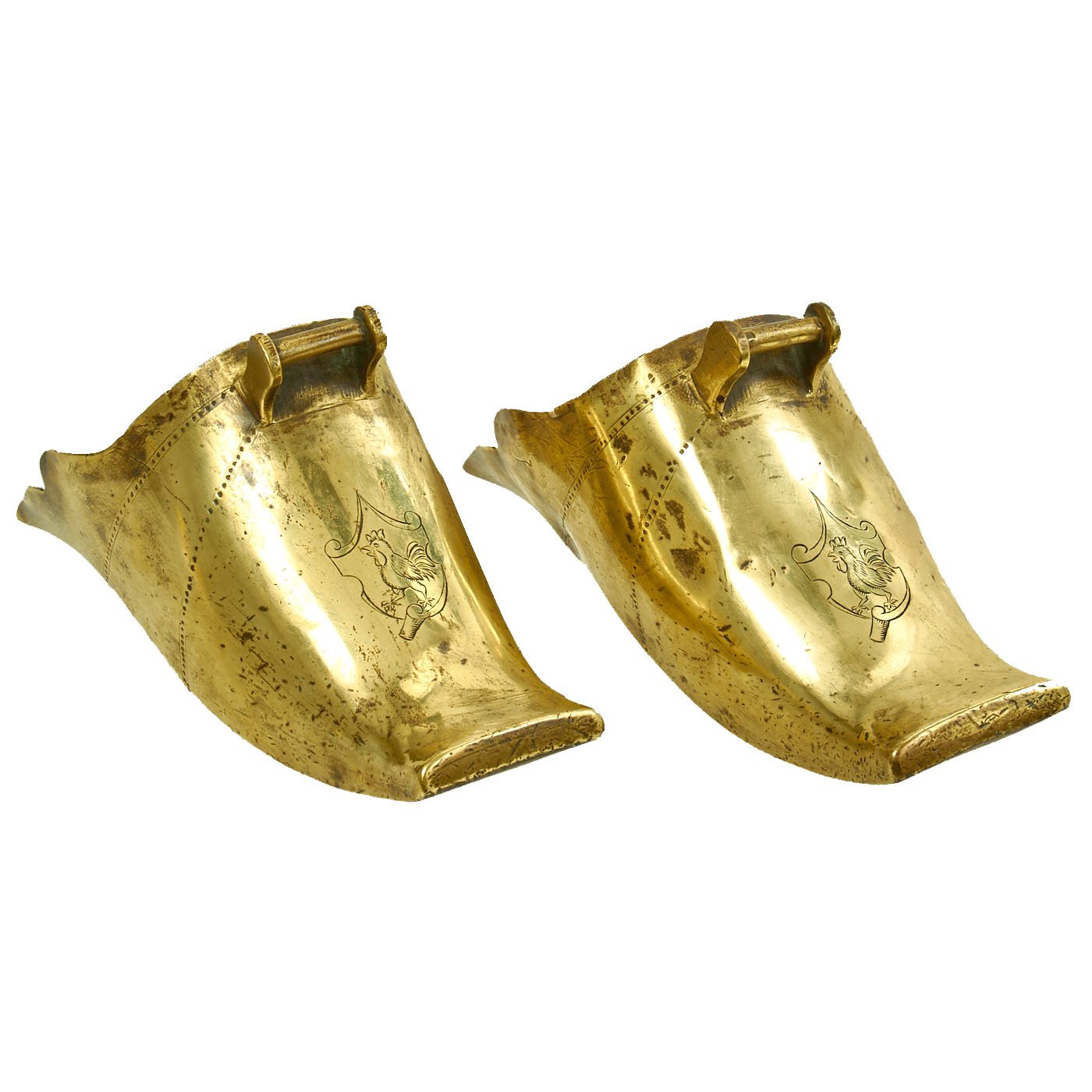 Made of heavy brass, we suspect these were full shoe accommodating stirrups and were no doubt comfortable but ungainly. In nice condition, regularly polished on the exterior but totally tarnished to the interior. Original and 300 years of age in our view. Ready to display!