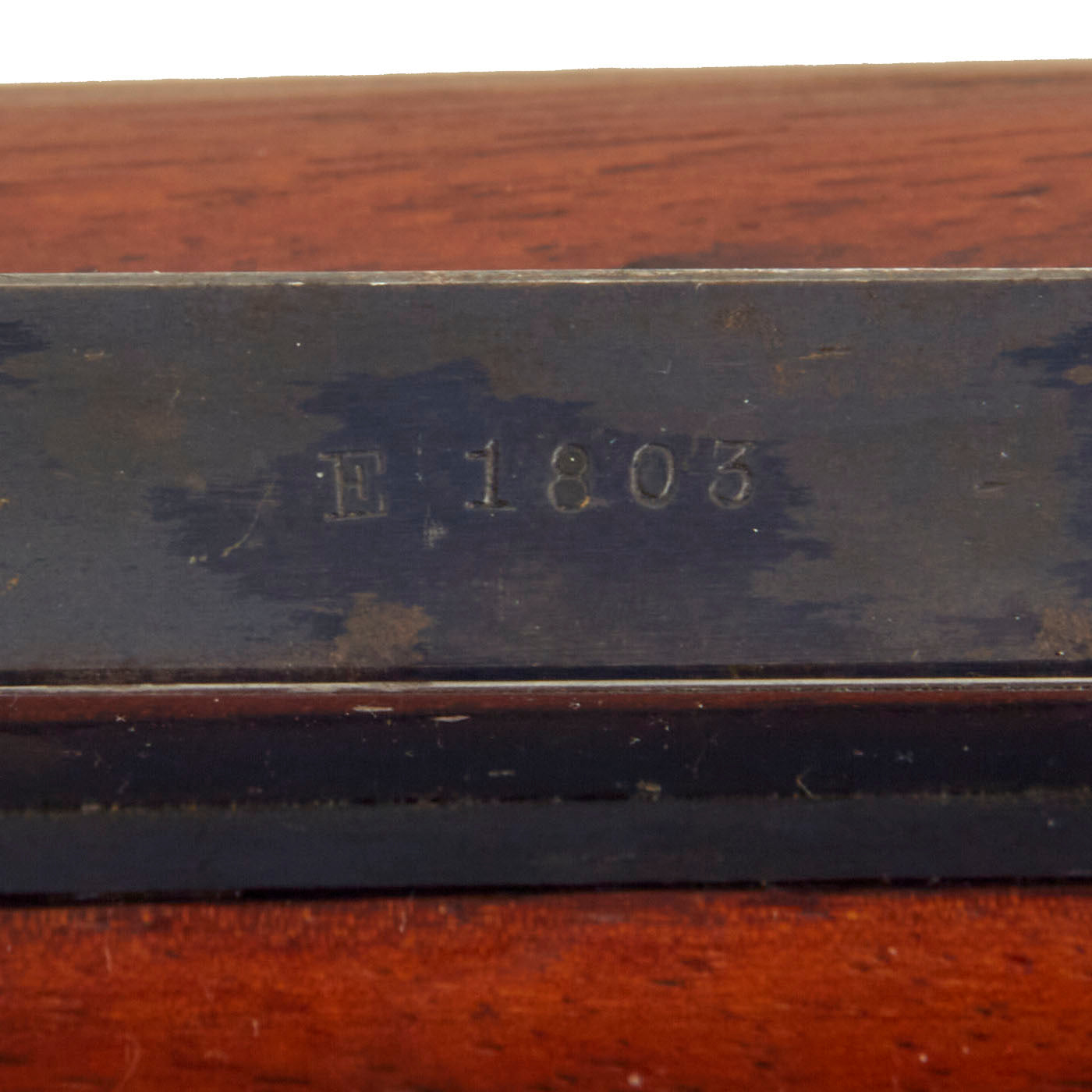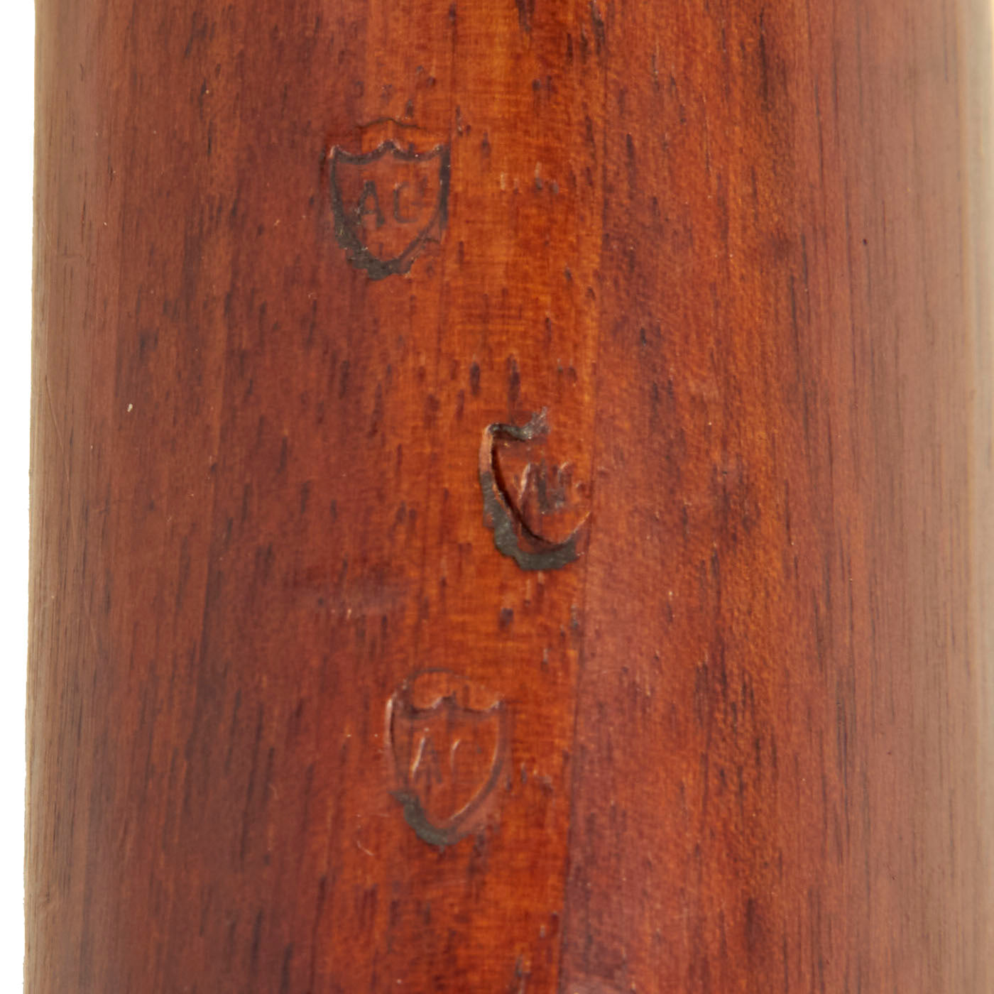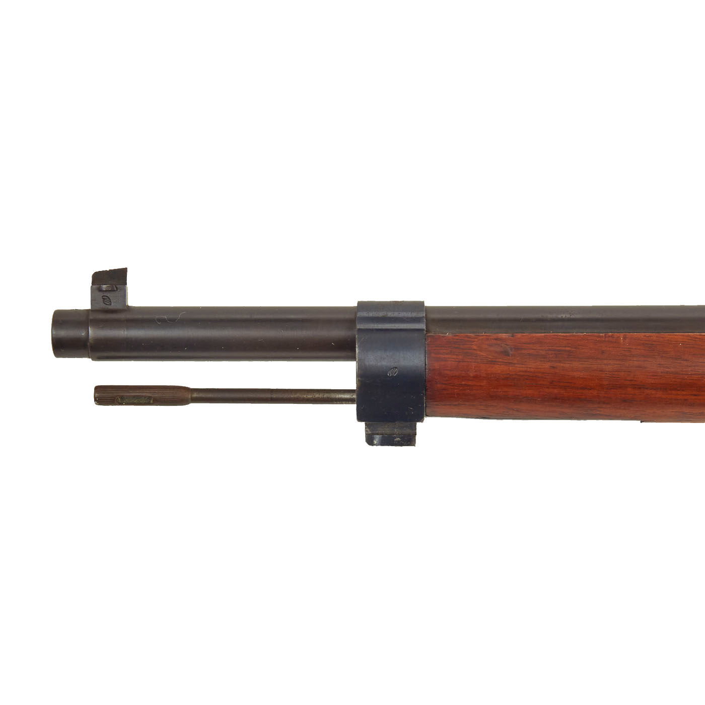 This example, like all of the Argentine Mausers made before 1897, was made by the renowned Company LUDWIG LOEWE of BERLIN, which from 1887 onward was actually part owner of Mauser Waffenfabrik. It has fully matching serial numbers, with E 1083 on the barrel, receiver, stock, bolt, and magazine floor plate. Even the cleaning rod is matched! It's very rare that we see an ALL MATCHING example like this, with no parts swapped out over the decades.