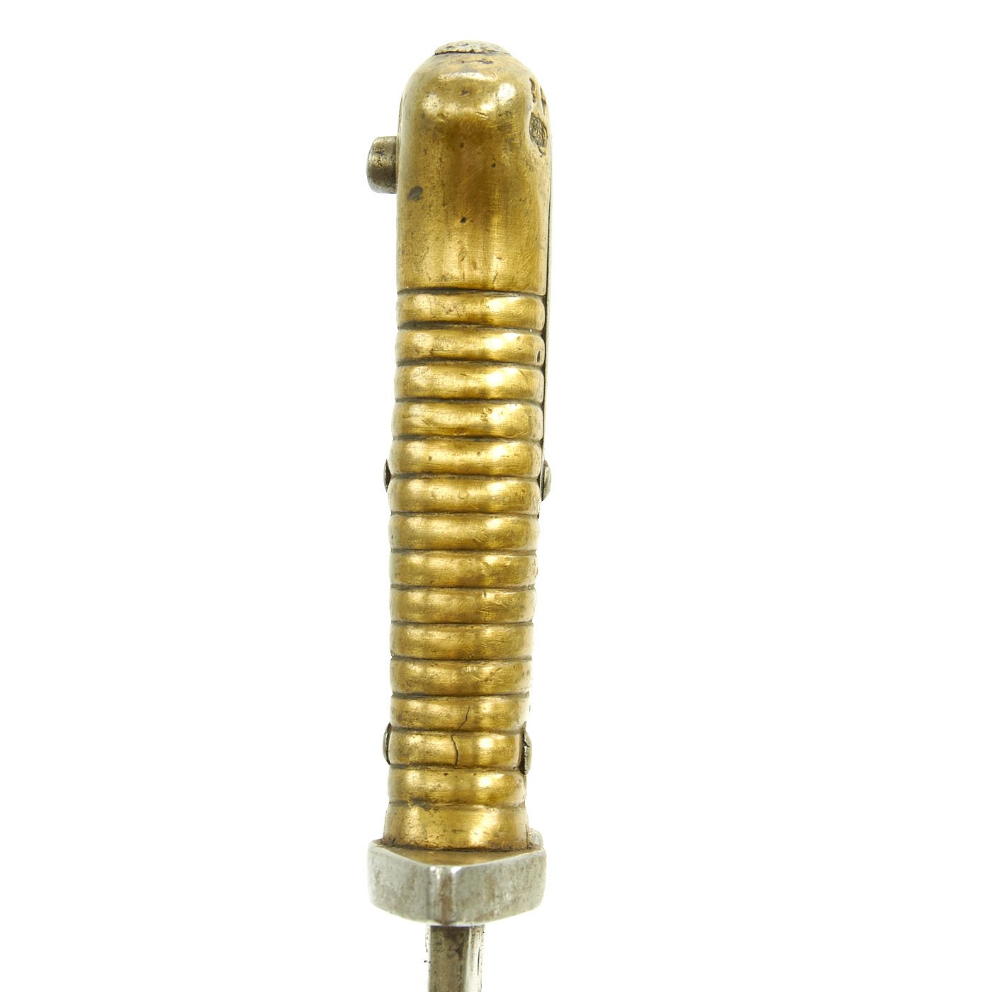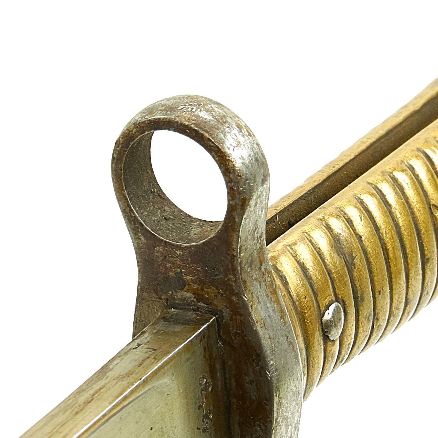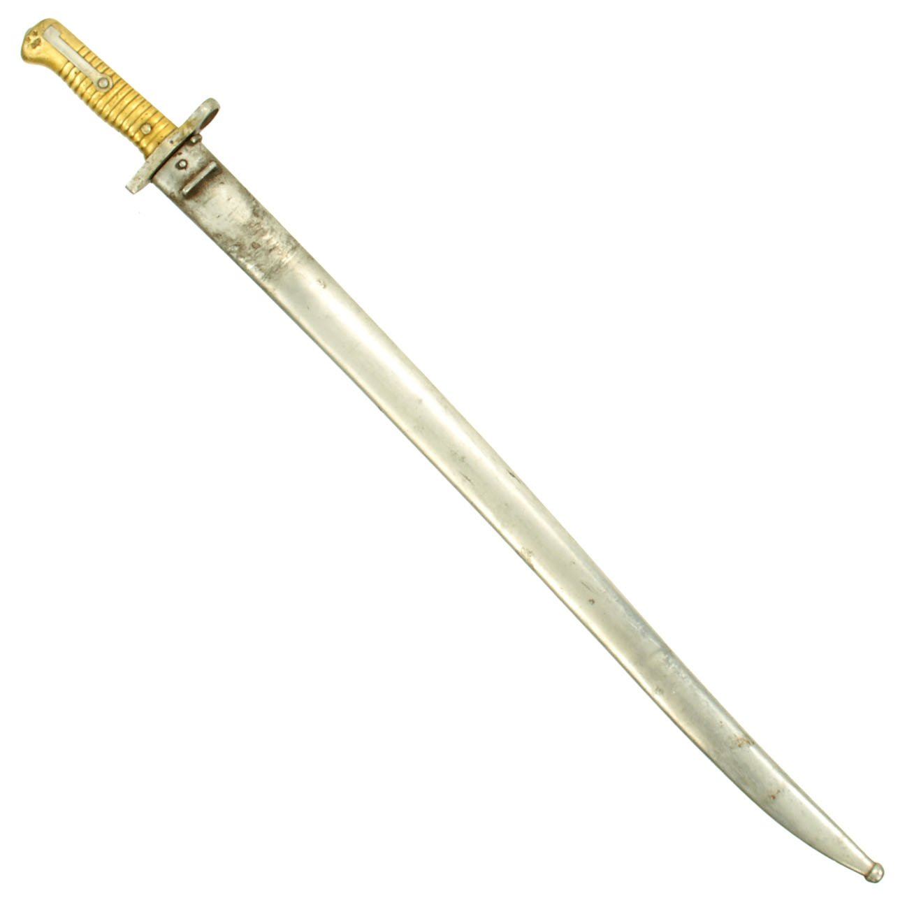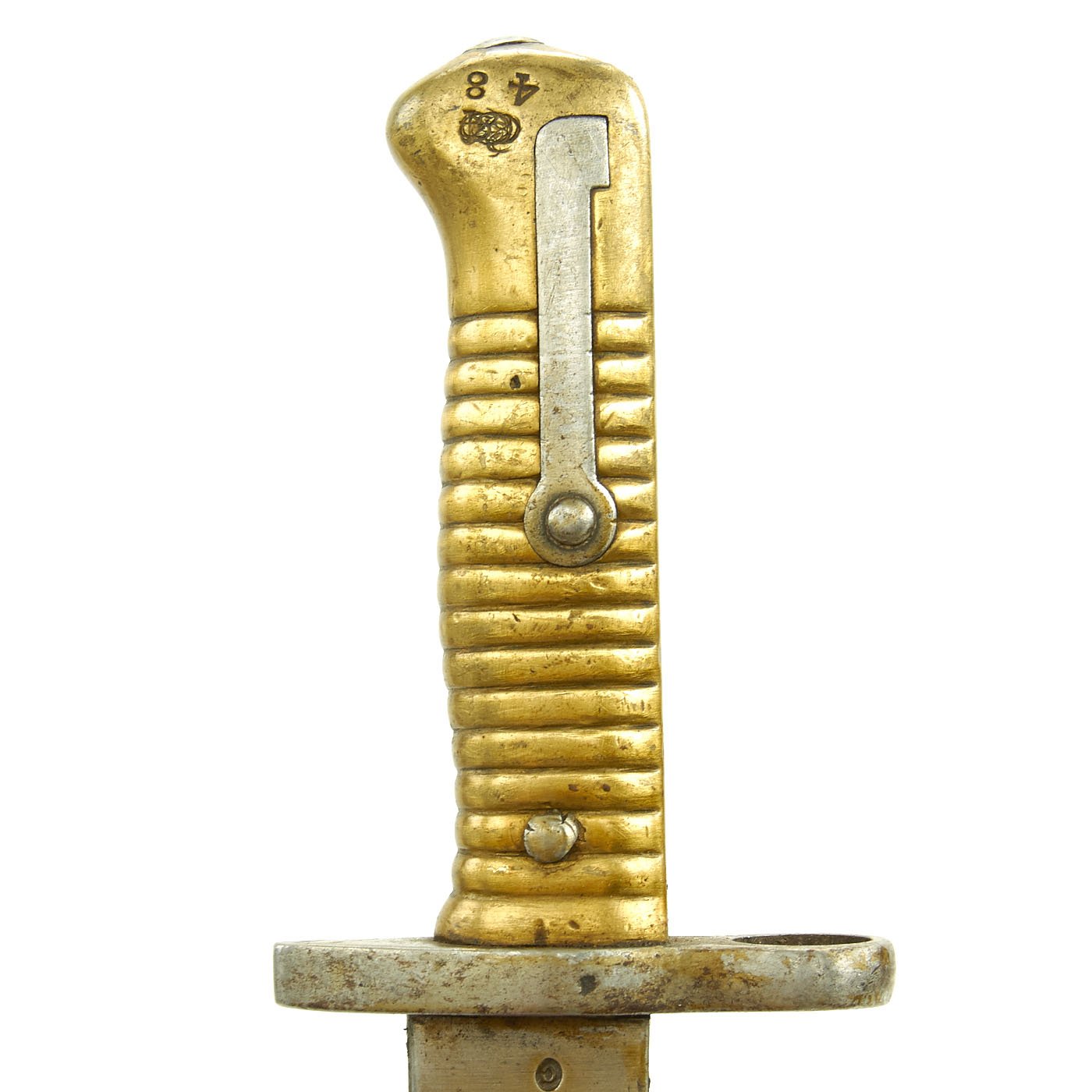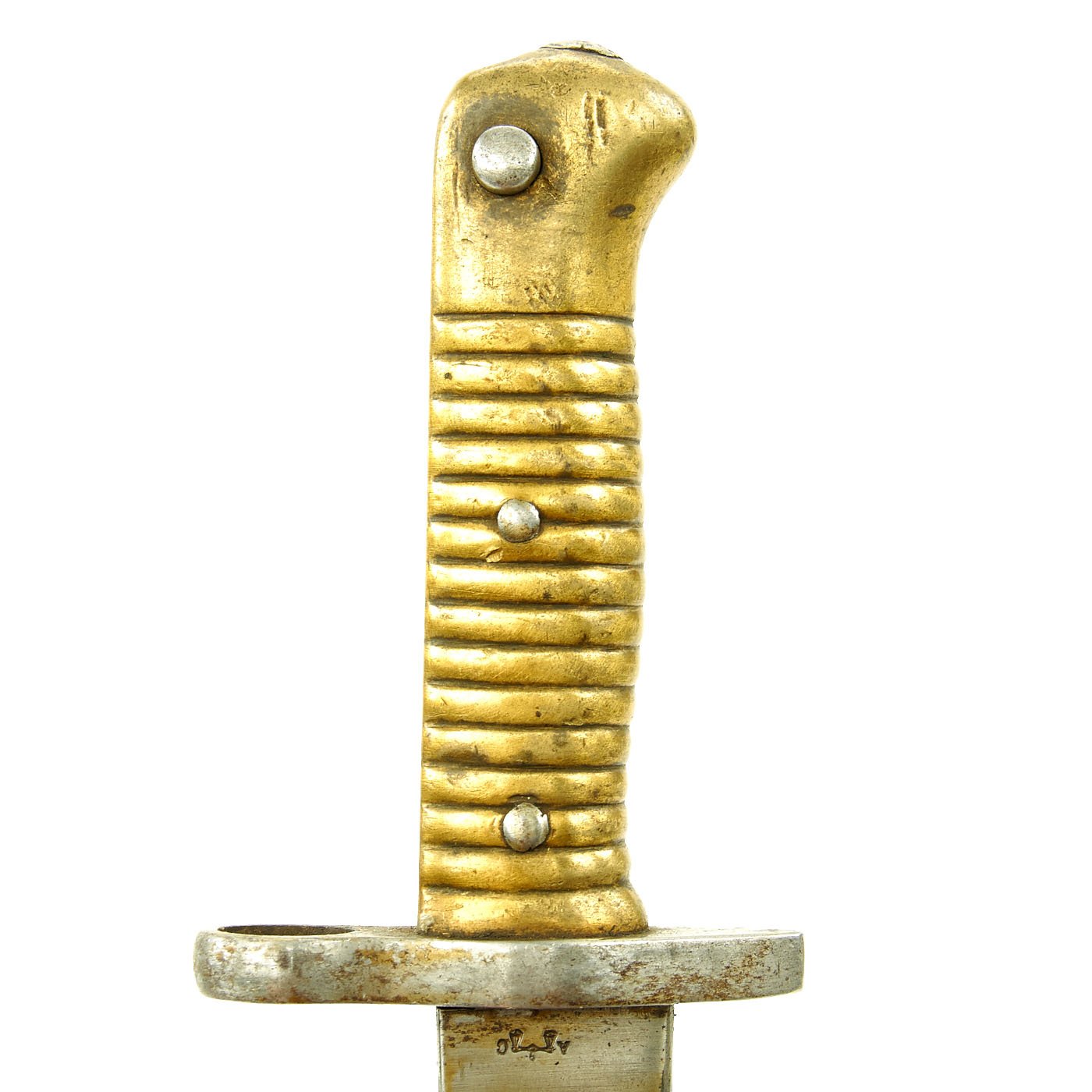 Original Item: Only One Available. Bayonets of this rare type were released in 1976 by the Egyptian Ministry of the Interior, included in a mass of Remington Rolling Block Contract Rifles and Martini Enfield Carbines. In Egypt, to keep bayonets in service, the earlier 1869 Remington bayonets were modified by the installation of a steel replacement cross guard without the traditional hook quillon. The replacement has a complete steel muzzle ring to fit a .303 caliber rifle, and the rear of the brass hilt machined to take the Enfield bayonet stand.