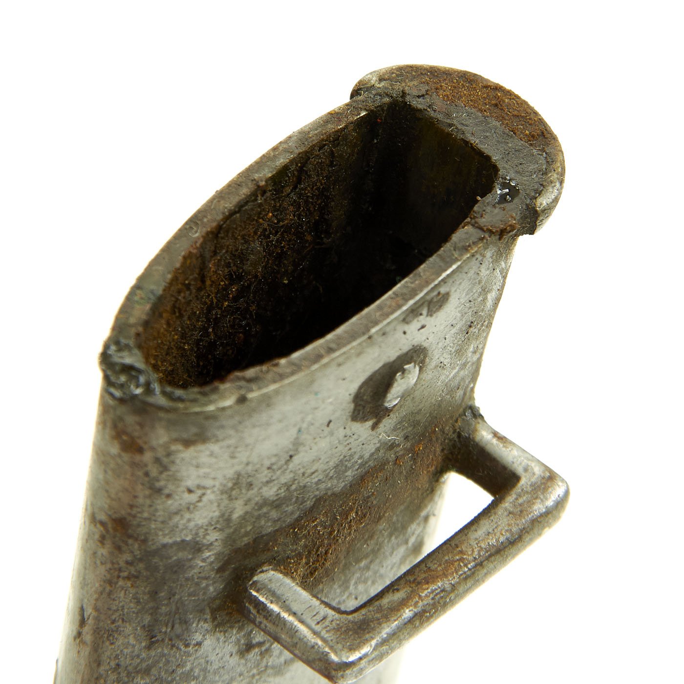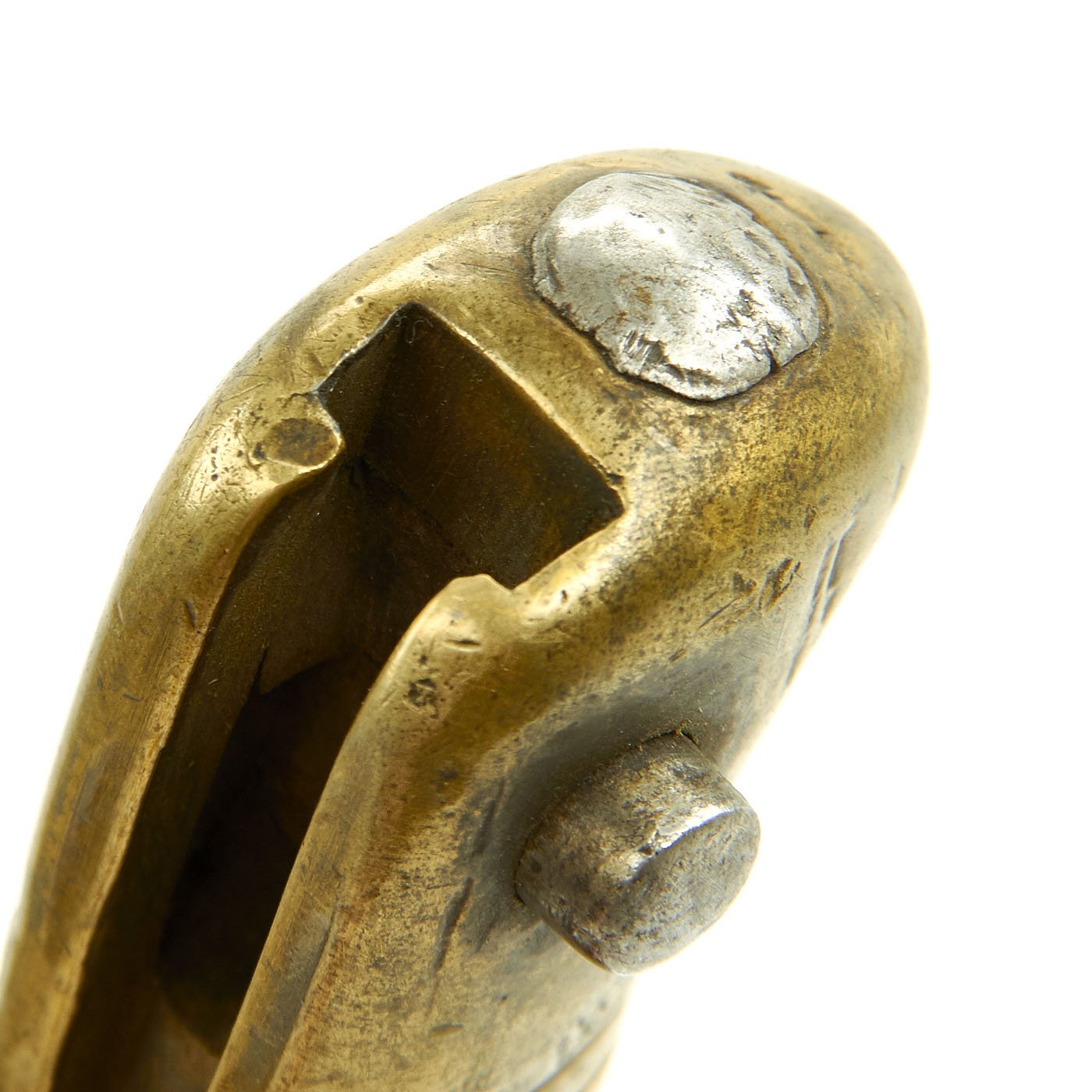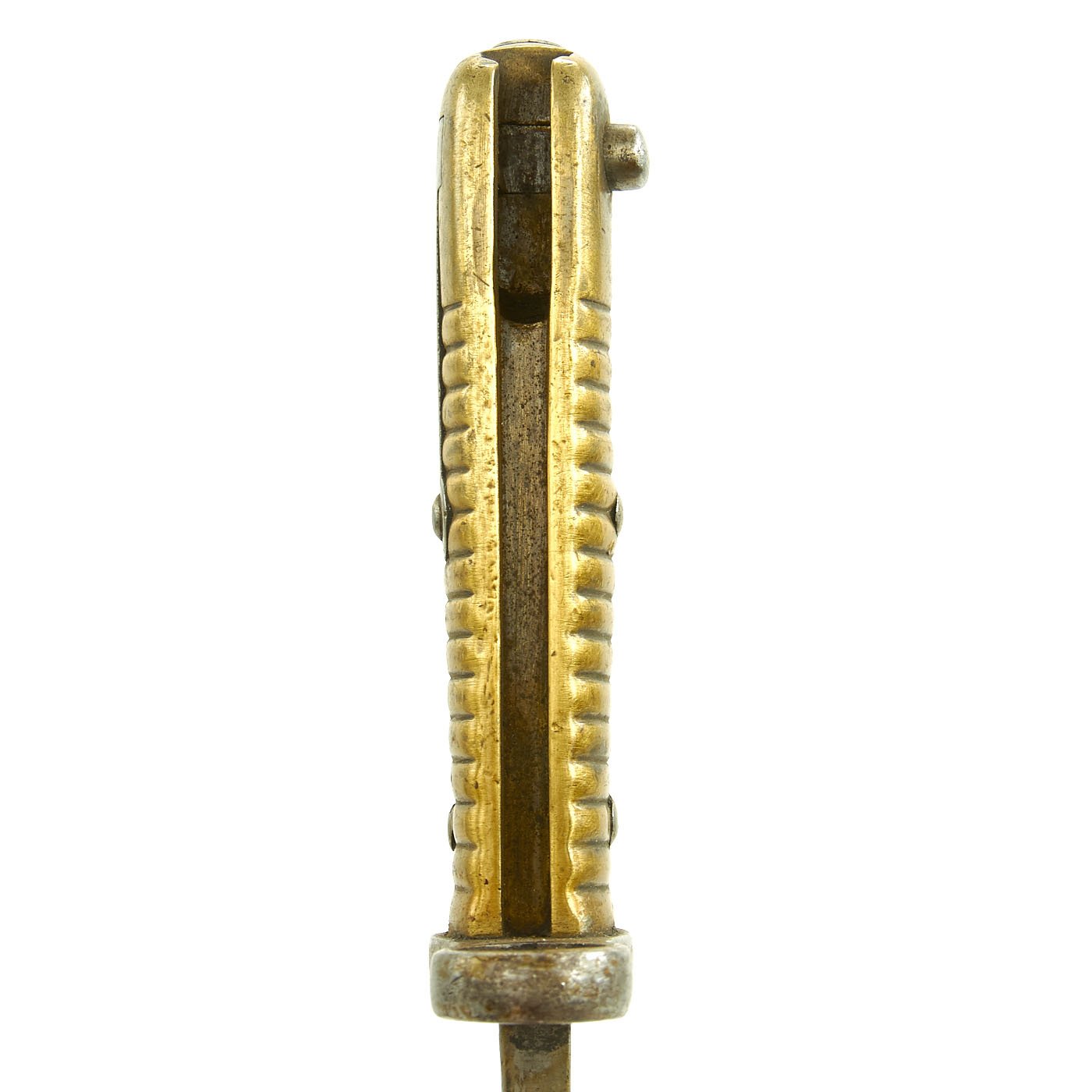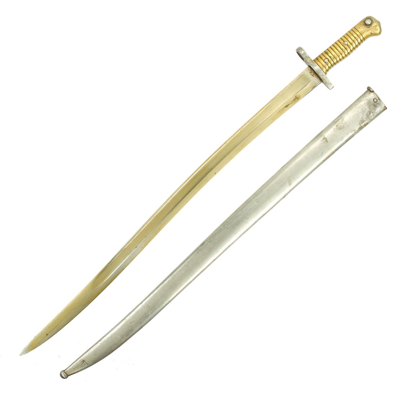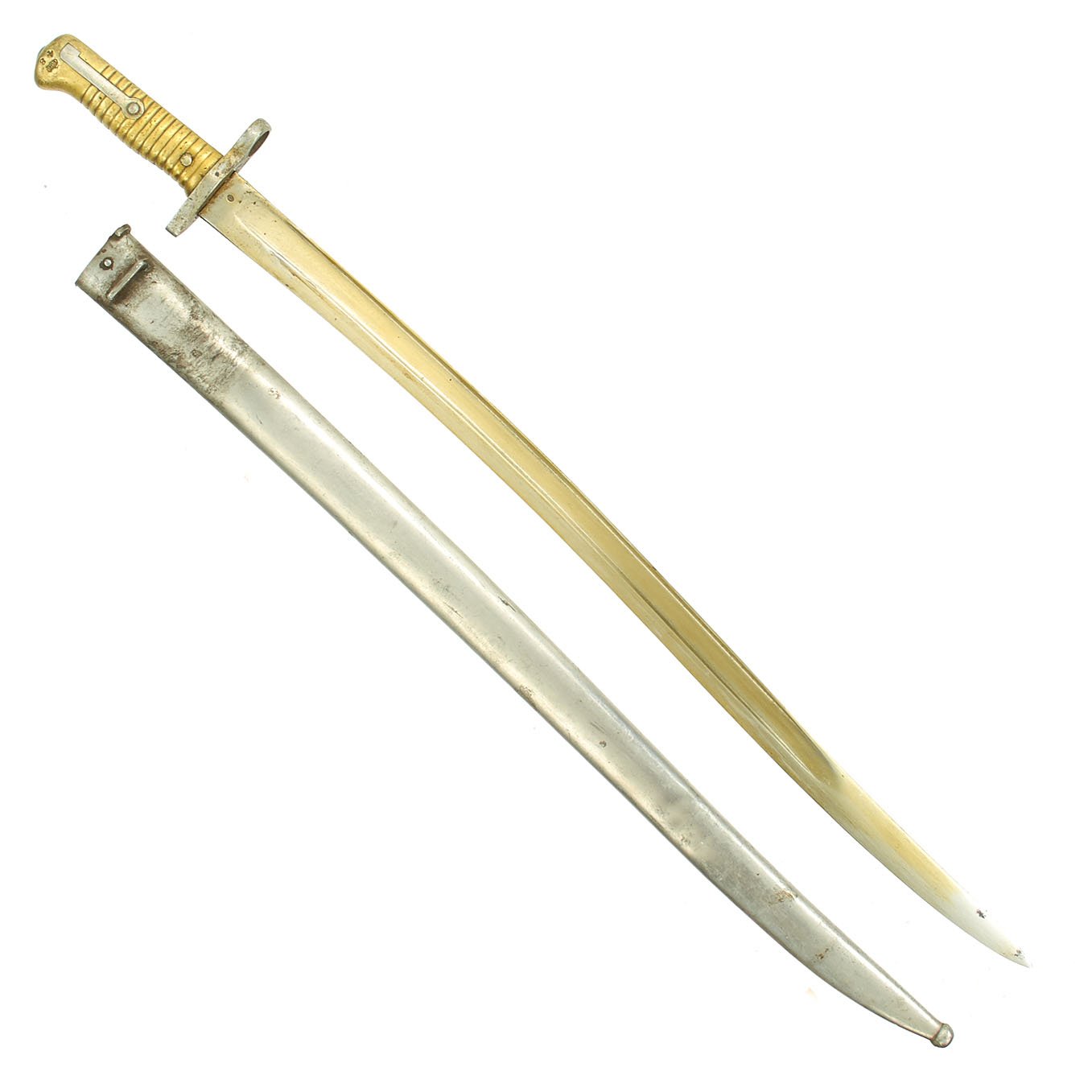 Original Item: Only One Available. Bayonets of this rare type were released in 1976 by the Egyptian Ministry of the Interior, included in a mass of Remington Rolling Block Contract Rifles and Martini Enfield Carbines. In Egypt, to keep bayonets in service, the earlier 1869 Remington bayonets were modified by the installation of a steel replacement cross guard without the traditional hook quillon. The replacement has a complete steel muzzle ring to fit a .303 caliber rifle, and the rear of the brass hilt machined to take the Enfield bayonet stand.