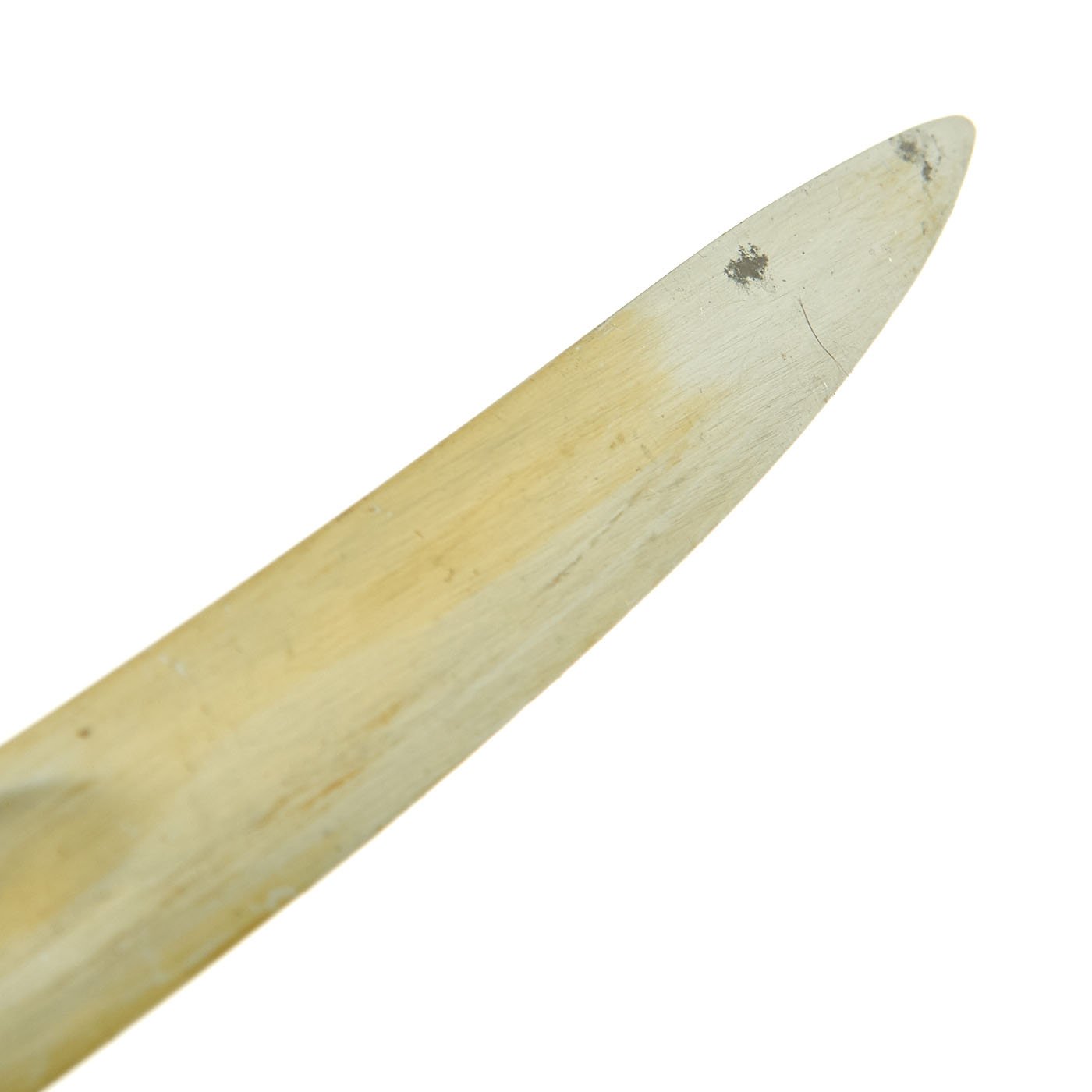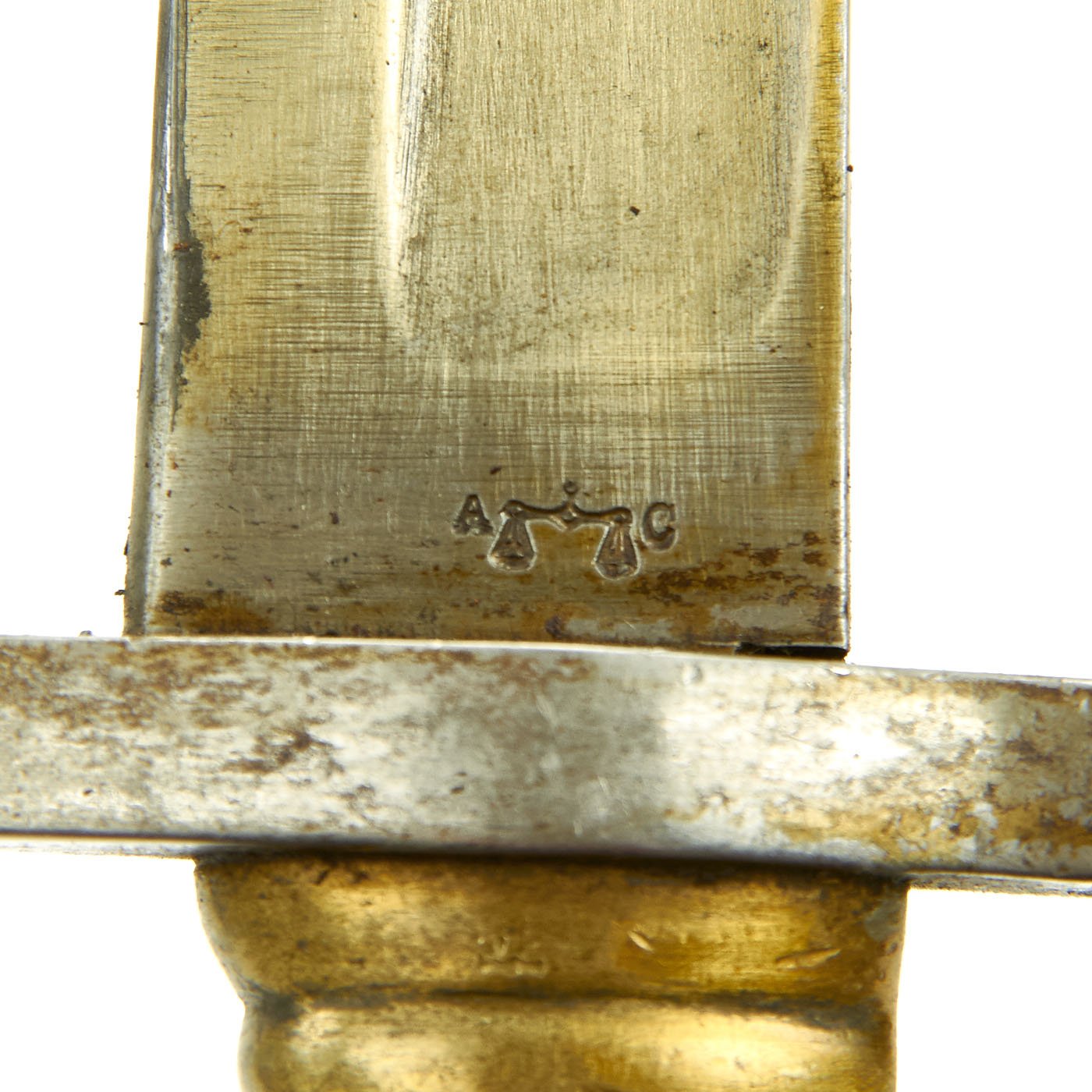 This bayonet is quite impressive, about 27 inches long with a 22 3/4 inch "Yataghan" style saber blade, with a wide fuller on each side. The ricasso of the blade is marked with the A (Scale) C logo of German edged weapon maker Alexander Coppel of Solingen, Germany. This company made large amounts of export bayonets during the 19th century.