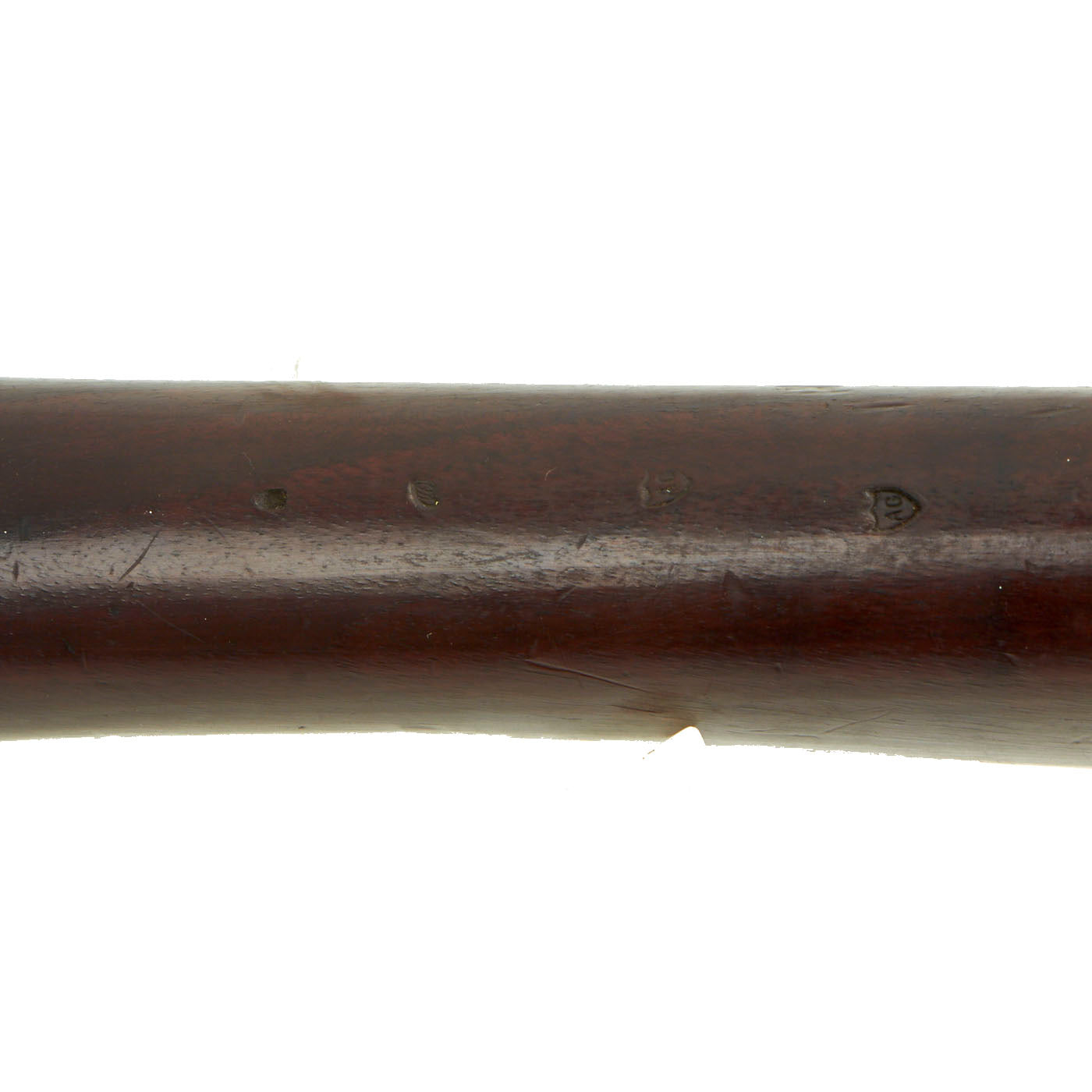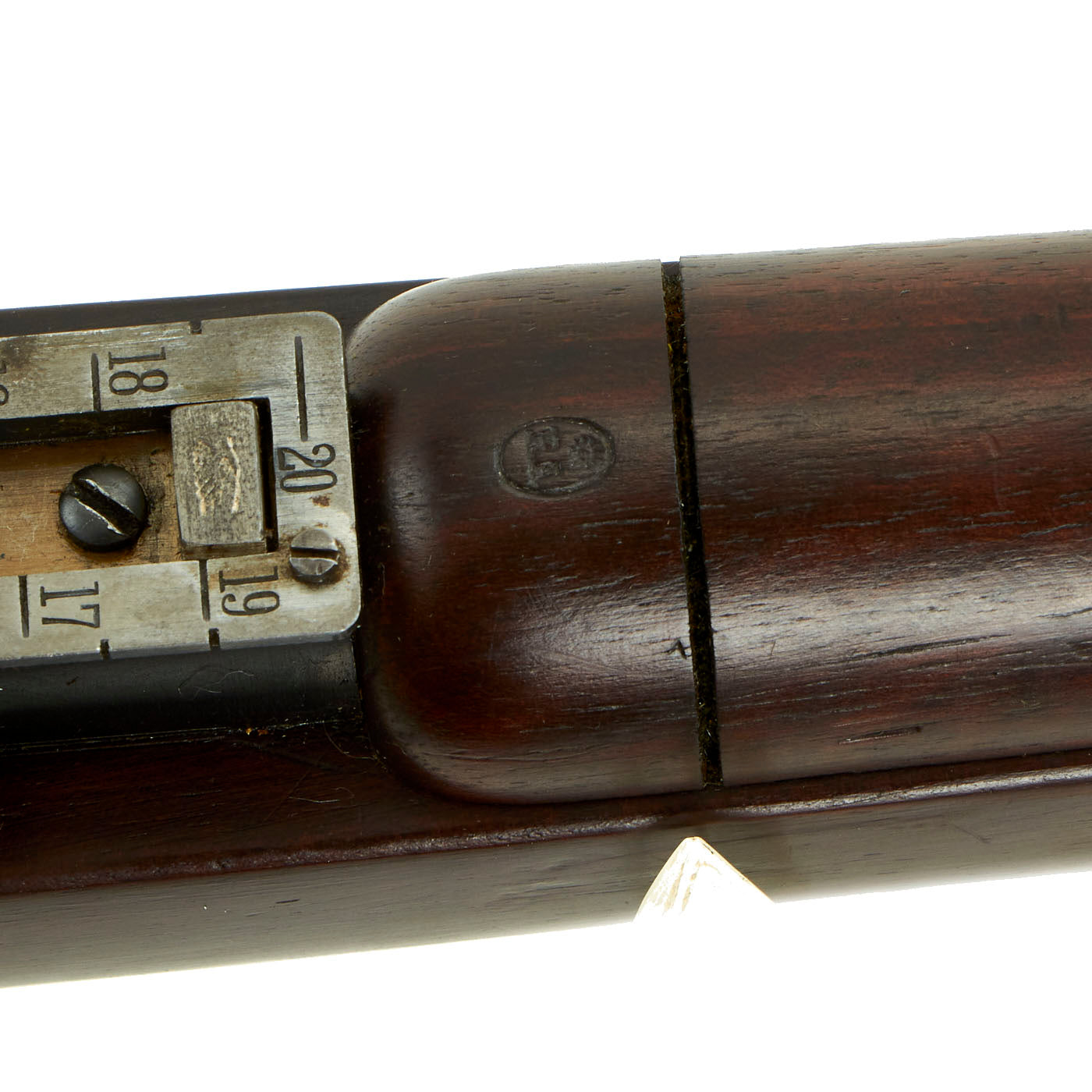 The stock is in excellent condition, showing very little sign of having seen actual service. It still has the original dark brown finish, with small dents and scuffs consistent with wear from storage. It even still has an intact Argentine crest on the right side of the butt stock. We checked the bore, and it looks to never have been used. It has a mirror bright finish with crisp lands and grooves, and we've never seen better.