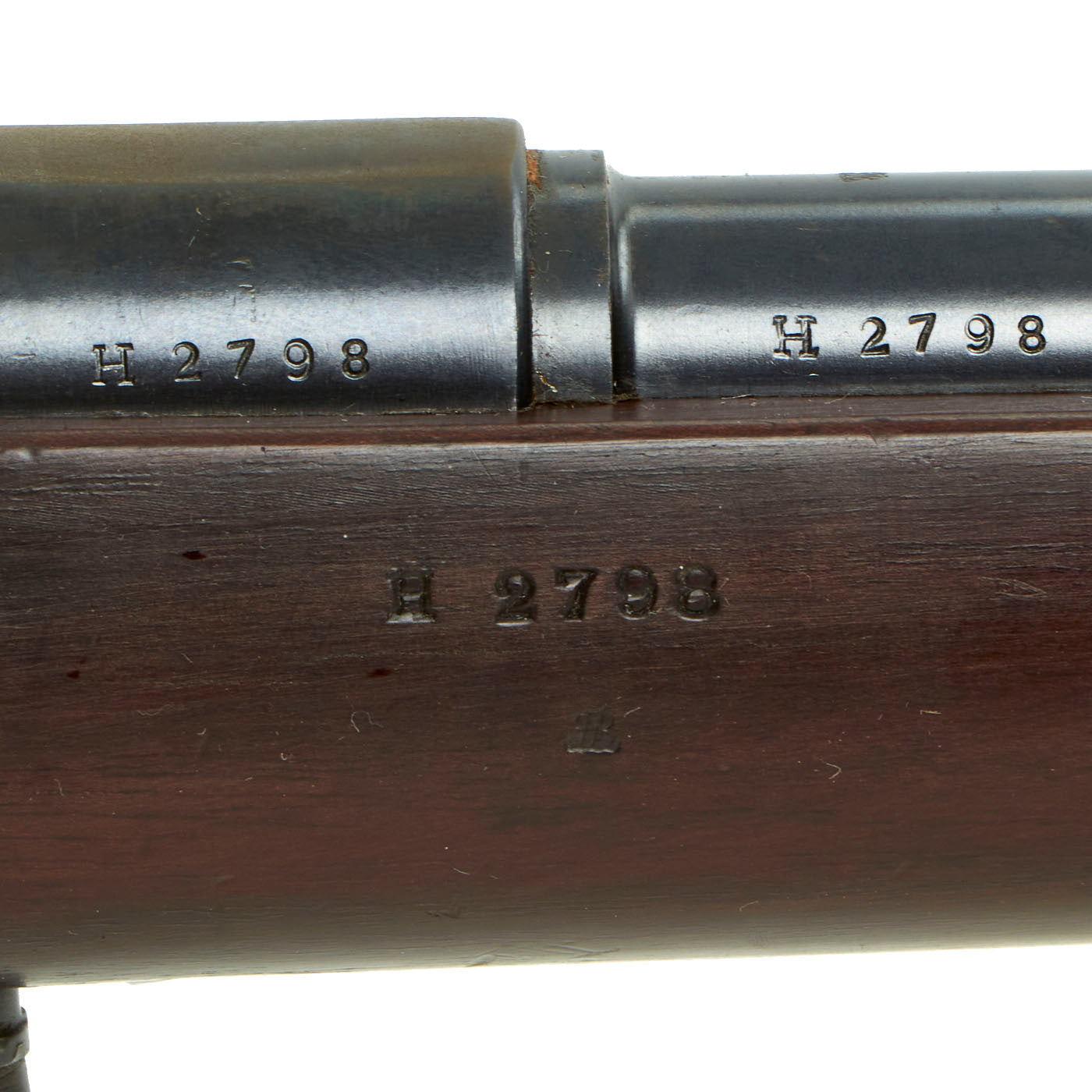 This example, like all of the Argentine Mausers made before 1897, was made by the renowned Company LUDWIG LOEWE of BERLIN, which from 1887 onward was actually part owner of Mauser Waffenfabrik. It has mostly matching serial numbers, with H 2798 on the barrel, receiver, stock, cleaning rod and magazine floor plate. Only the bolt is mis-matched, with H 0584 stamped on it. The serial numbers were issued sequentially with a single letter prefix. The Ludwig Loewe serial number records for the Argentine contract indicate that serial numbers G0000 to L4999 were produced in 1894, so this rifle was made towards the end of 1894. There were also surplus receivers made, which were then used later. In 1896 Ludwig Loewe founded Deutsche Waffen- und Munitionsfabriken, the famous D.W.M., and all rifle receivers made 1897 onward were marked as such.