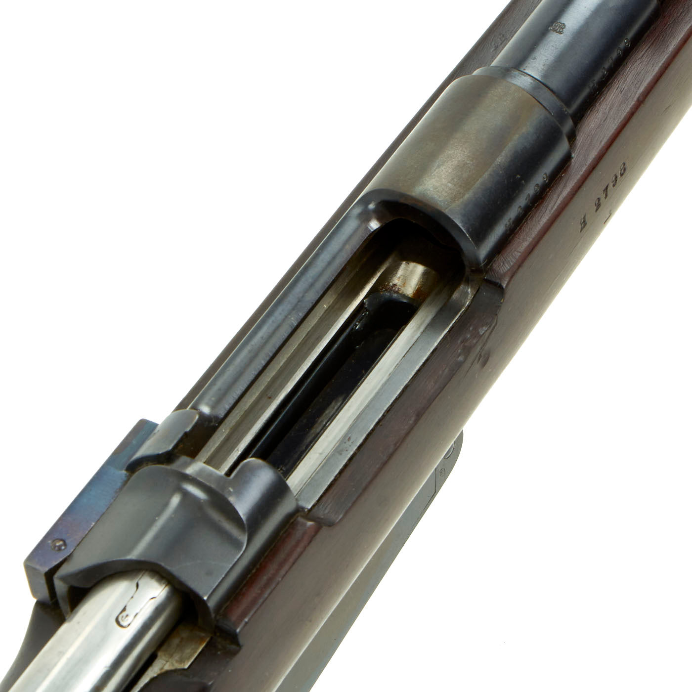 The area of the receiver over the chamber has been ground down to remove Argentine crest, as standard when sold out of service. It was then smoothed out and refinished. However, the Argentine "Clasped Hands" proof is still present on many components. The rest of the finish is a lovely blue, with just a few areas of light oxidation, such as the bolt handle. There is even still much of the iridescent "Niter blue" finish on the magazine follower and bolt release spring.