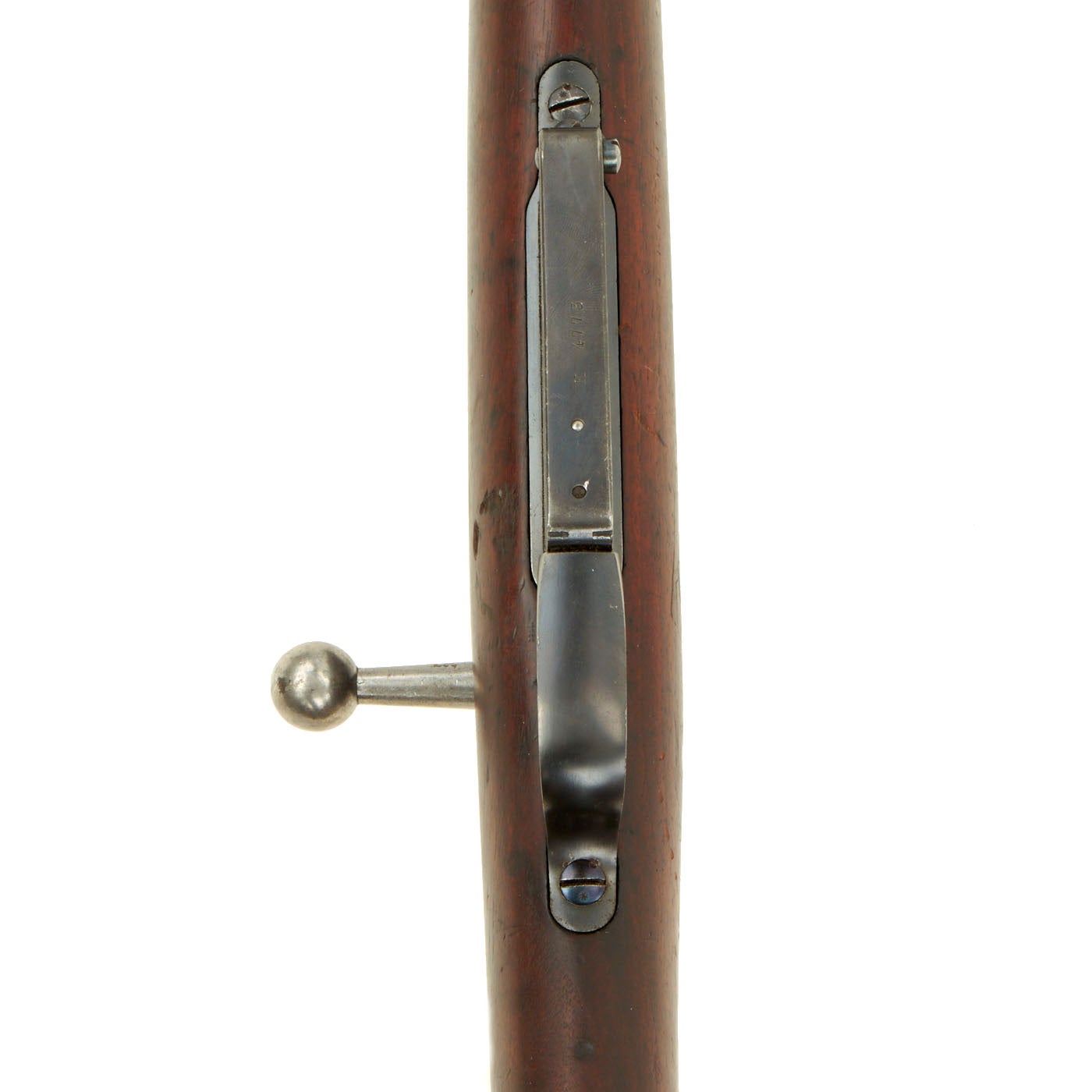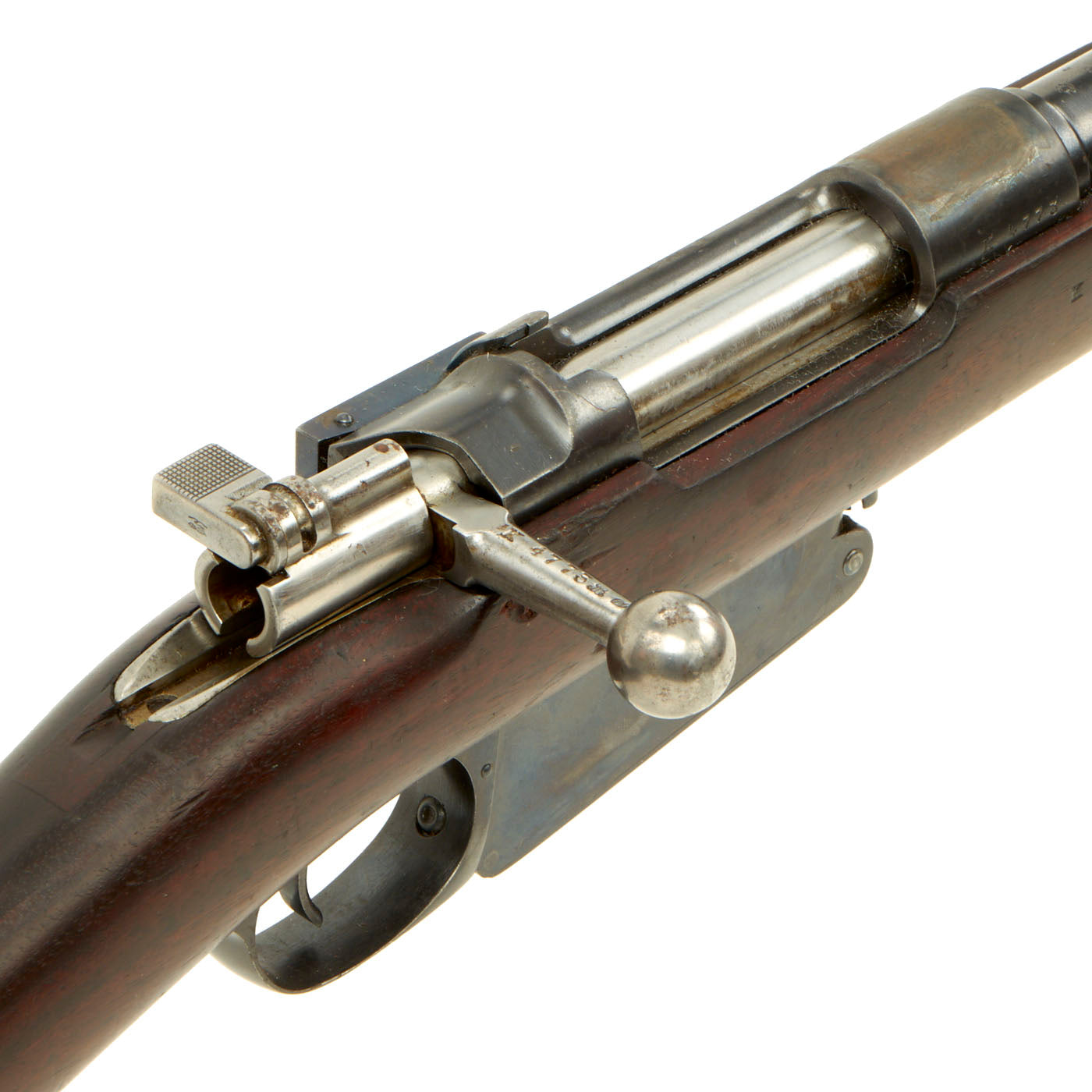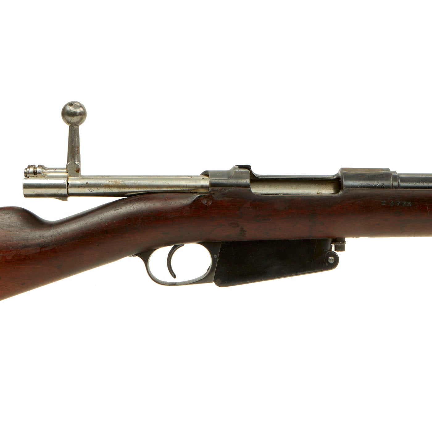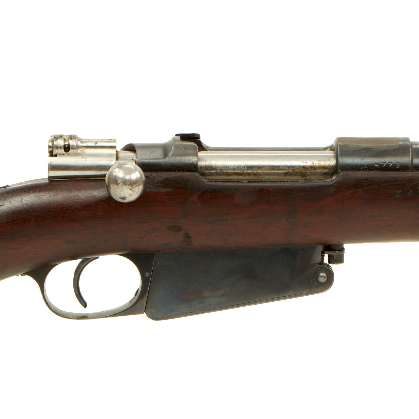 This example, like all of the Argentine Mausers made before 1897, was made by the renowned Company LUDWIG LOEWE of BERLIN, which from 1887 onward was actually part owner of Mauser Waffenfabrik. It has mostly matching serial numbers, with K 4773 on the barrel, receiver, stock, bolt, and magazine floor plate. Only the cleaning rod is mis-matched, with E 4555 stamped on it. The serial numbers were issued sequentially with a single letter prefix. The Ludwig Loewe serial number records for the Argentine contract indicate that serial numbers G0000 to L4999 were produced in 1894, so this rifle was made towards the end of 1894. There were also surplus receivers made, which were then used later. In 1896 Ludwig Loewe founded Deutsche Waffen- und Munitionsfabriken, the famous D.W.M., and all rifle receivers made 1897 onward were marked as such.