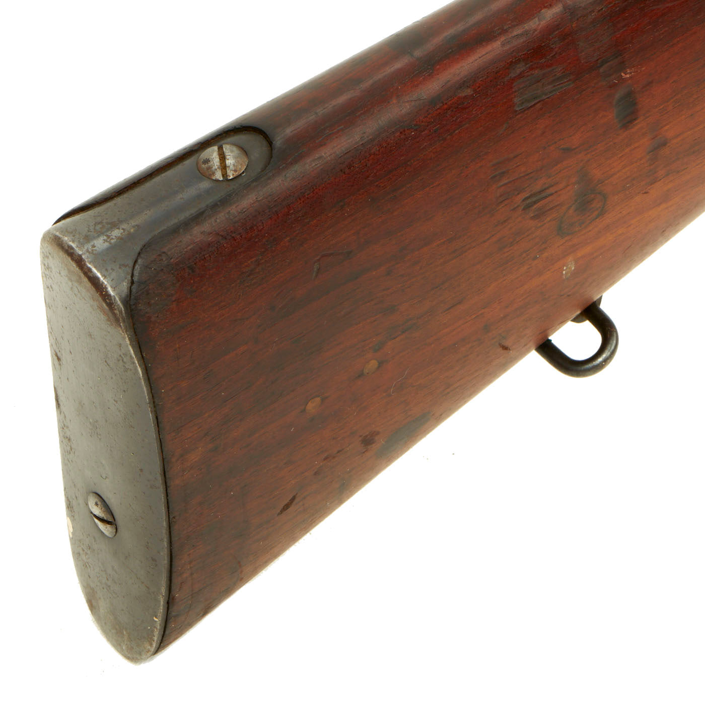 The stock is in very good condition, with great grain and a lovely dark red brown color. It does not look to have been reconditioned in the past, and still shows handling marks and light denting. There are some small filled holes in areas, so it looks like marking disks were attached to the stock at one point, now removed. The bore is in very good condition, with clear lands and grooves and a mostly bright finish. There is some powder fowling and light wear, so this is definitely a rifle that did see some amount of use while in service.