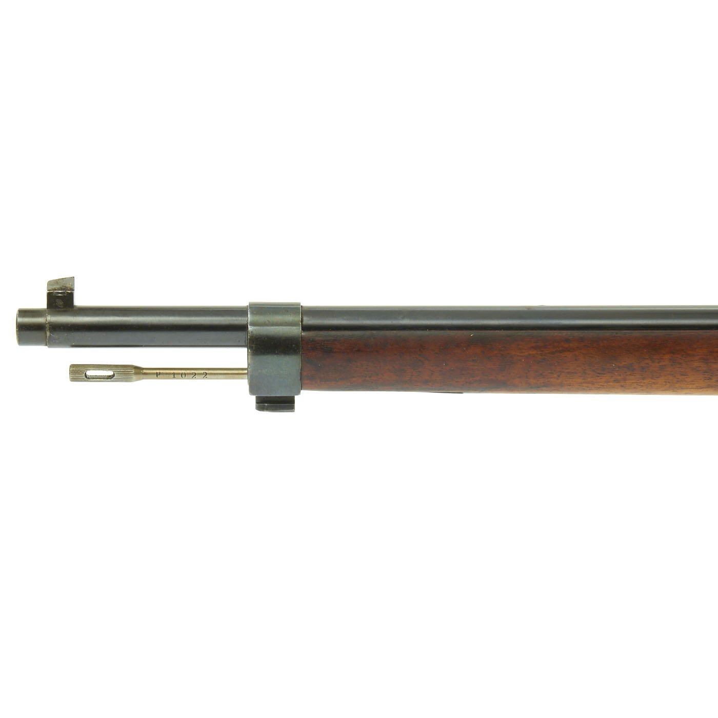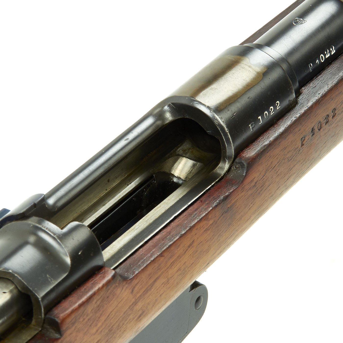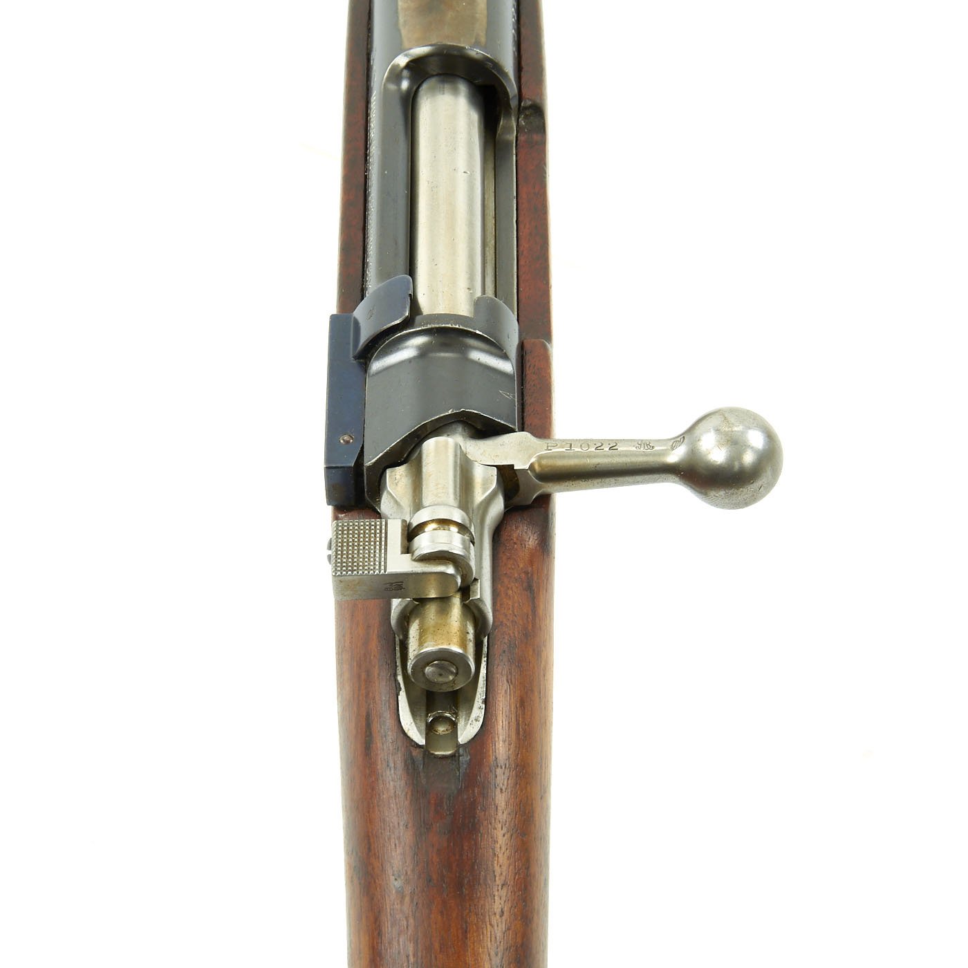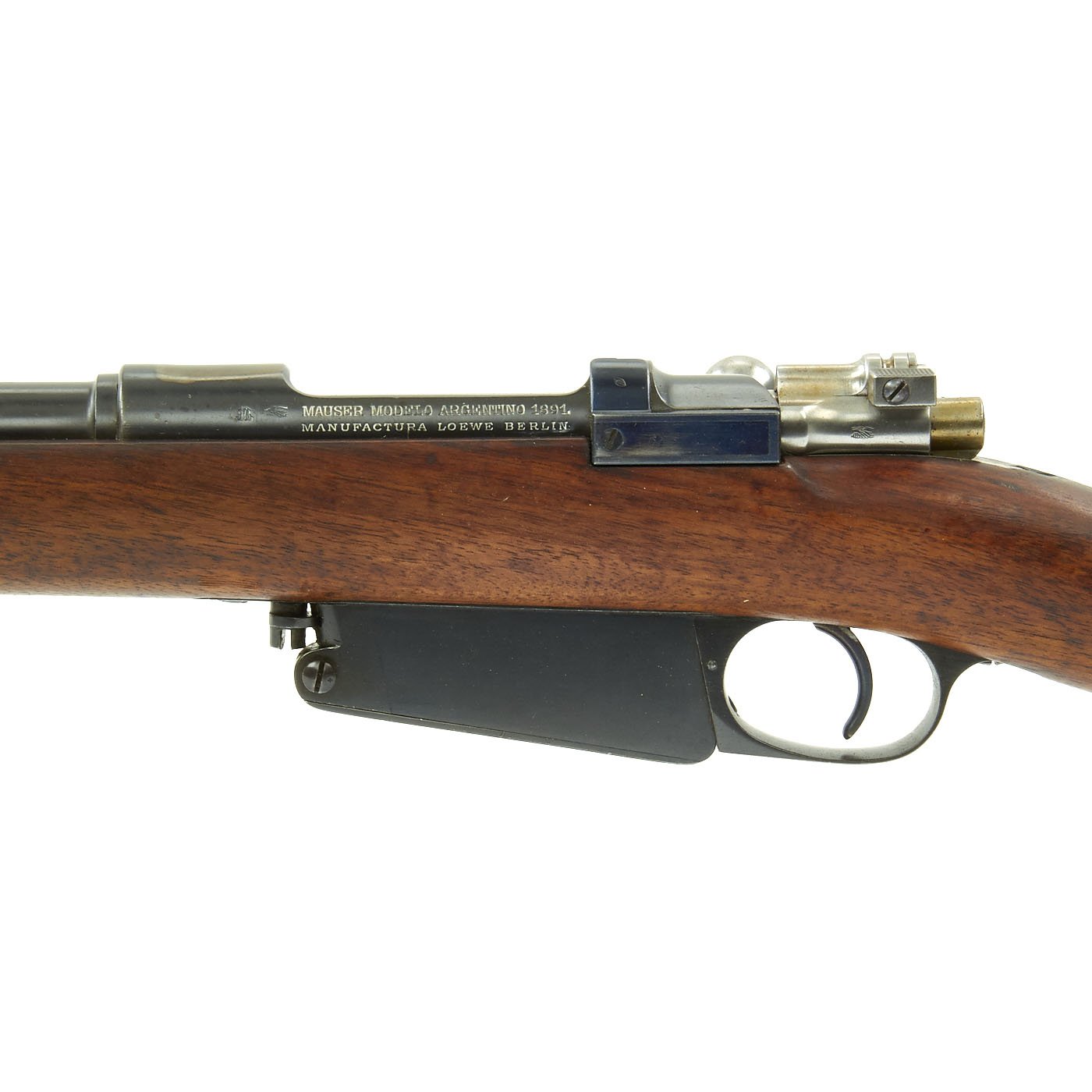 This example, like all of the Argentine Mausers made before 1897, was made by the renowned Company LUDWIG LOEWE of BERLIN, which from 1887 onward was actually part owner of Mauser Waffenfabrik. It has all matching serial numbers, with P 1022 on the barrel, receiver, bolt magazine floor plate, and even on the original steel-tipped cleaning rod. The serial numbers were issued sequentially with a single letter prefix. The Ludwig Loewe serial number records for the Argentine contract indicate that serial numbers N0000 to P0500 were produced in 1896, so this rifle was made probably made in the first quarter of 1897. There were also surplus receivers made, which were then used later. In 1896 Ludwig Loewe founded Deutsche Waffen- und Munitionsfabriken, the famous D.W.M., and all rifle receivers made 1897 onward were marked as such, so this rifle is definitely from 1896, even if it was delivered for a later contract.