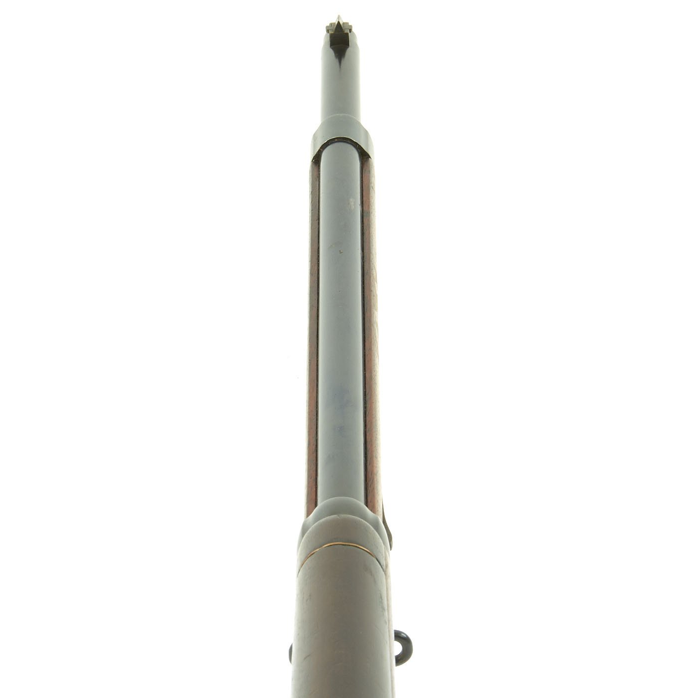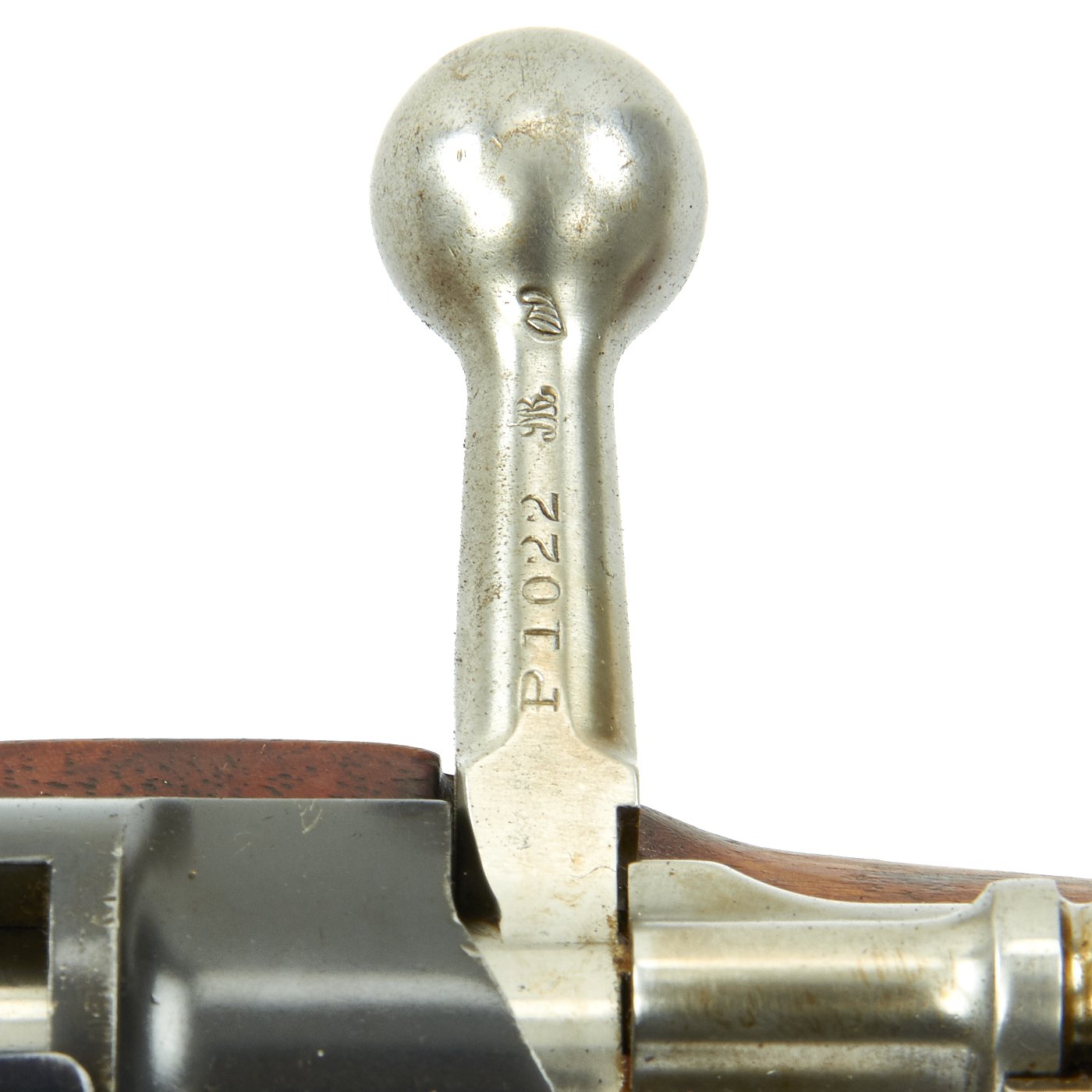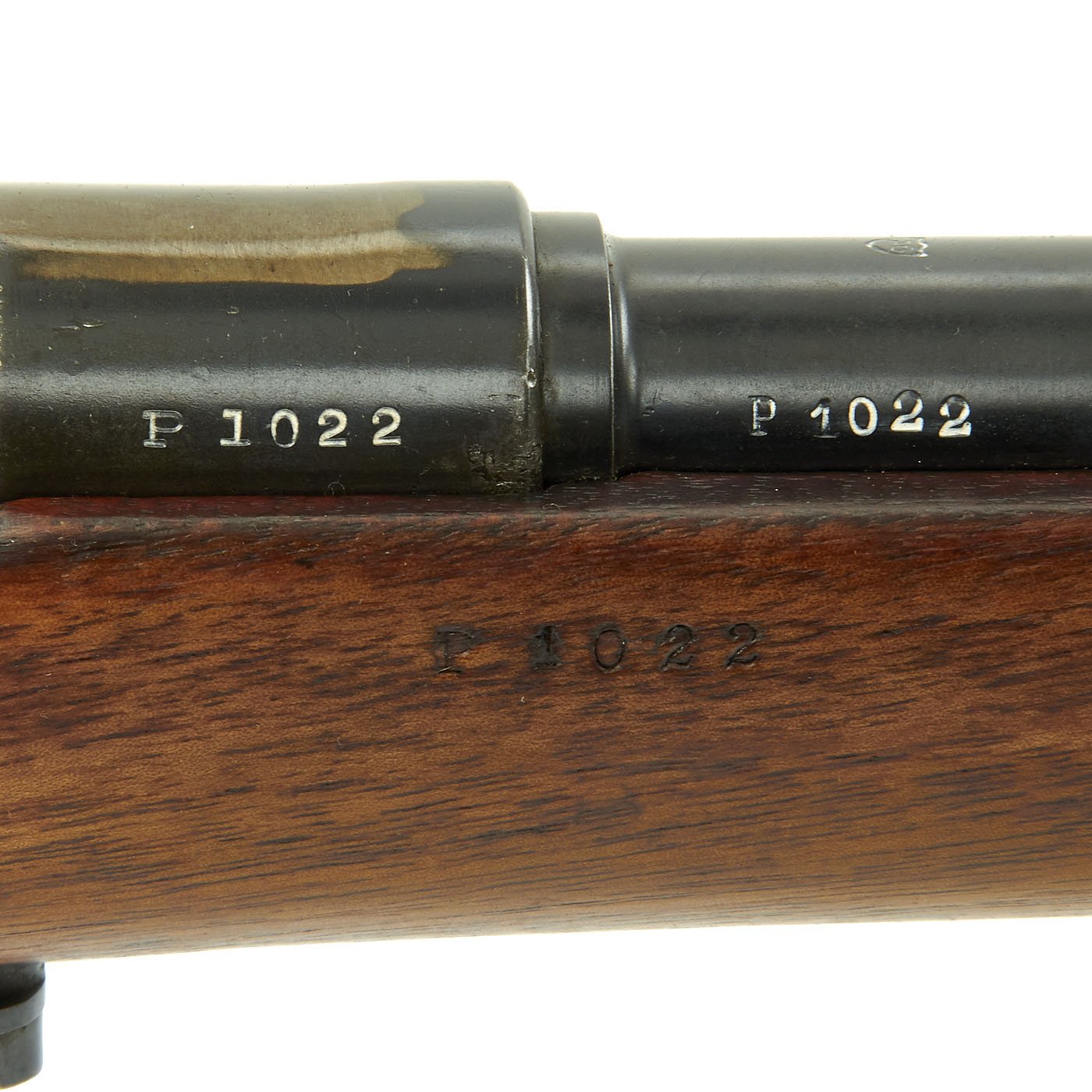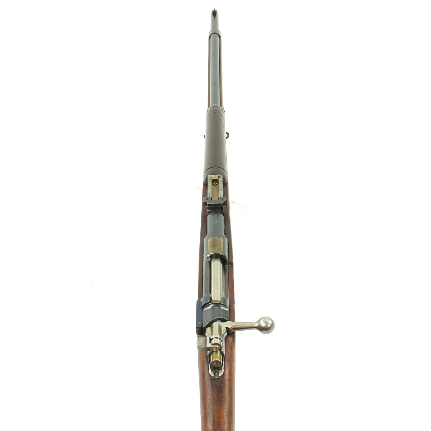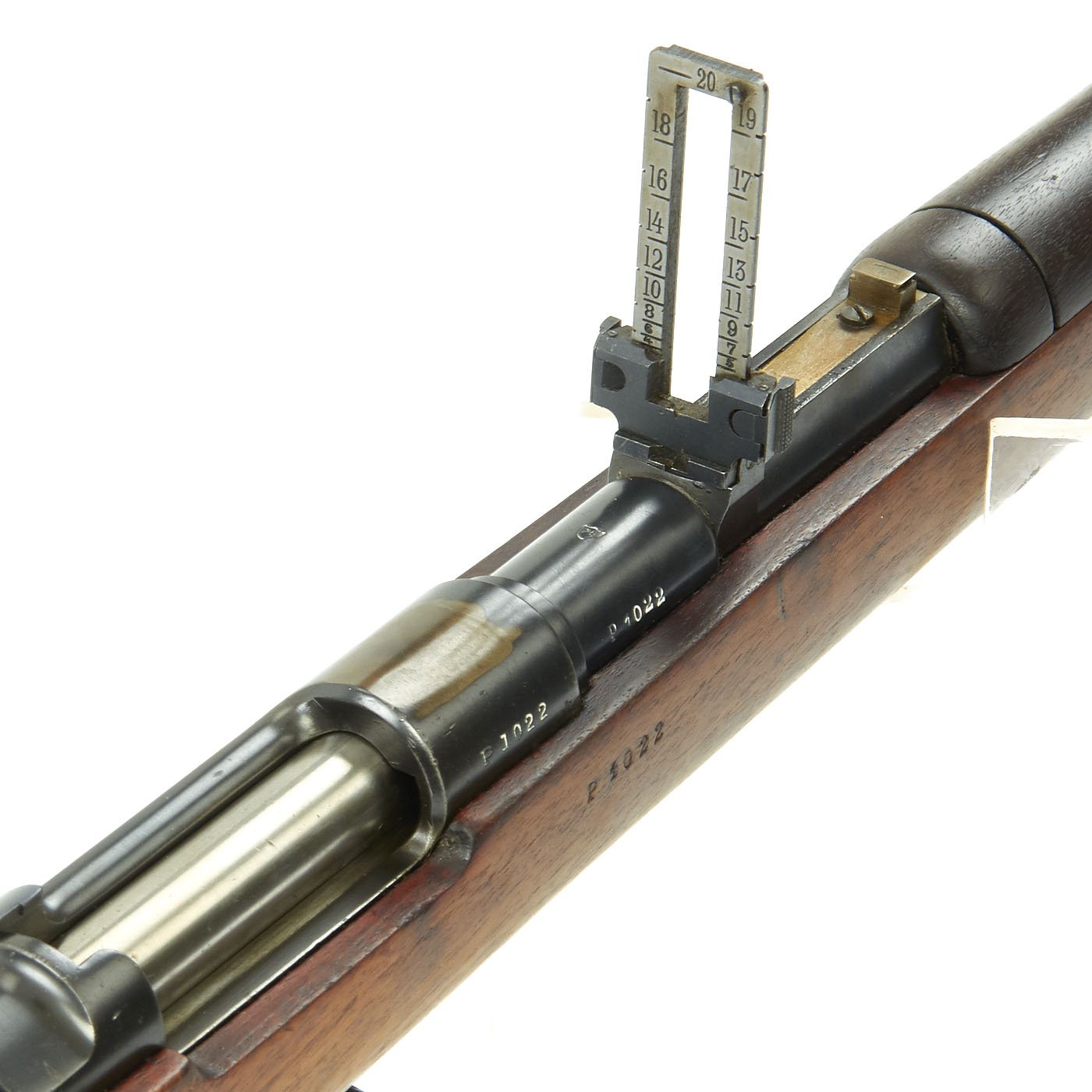 This example, like all of the Argentine Mausers made before 1897, was made by the renowned Company LUDWIG LOEWE of BERLIN, which from 1887 onward was actually part owner of Mauser Waffenfabrik. It has all matching serial numbers, with P 1022 on the barrel, receiver, bolt magazine floor plate, and even on the original steel-tipped cleaning rod. The serial numbers were issued sequentially with a single letter prefix. The Ludwig Loewe serial number records for the Argentine contract indicate that serial numbers N0000 to P0500 were produced in 1896, so this rifle was made probably made in the first quarter of 1897. There were also surplus receivers made, which were then used later. In 1896 Ludwig Loewe founded Deutsche Waffen- und Munitionsfabriken, the famous D.W.M., and all rifle receivers made 1897 onward were marked as such, so this rifle is definitely from 1896, even if it was delivered for a later contract.