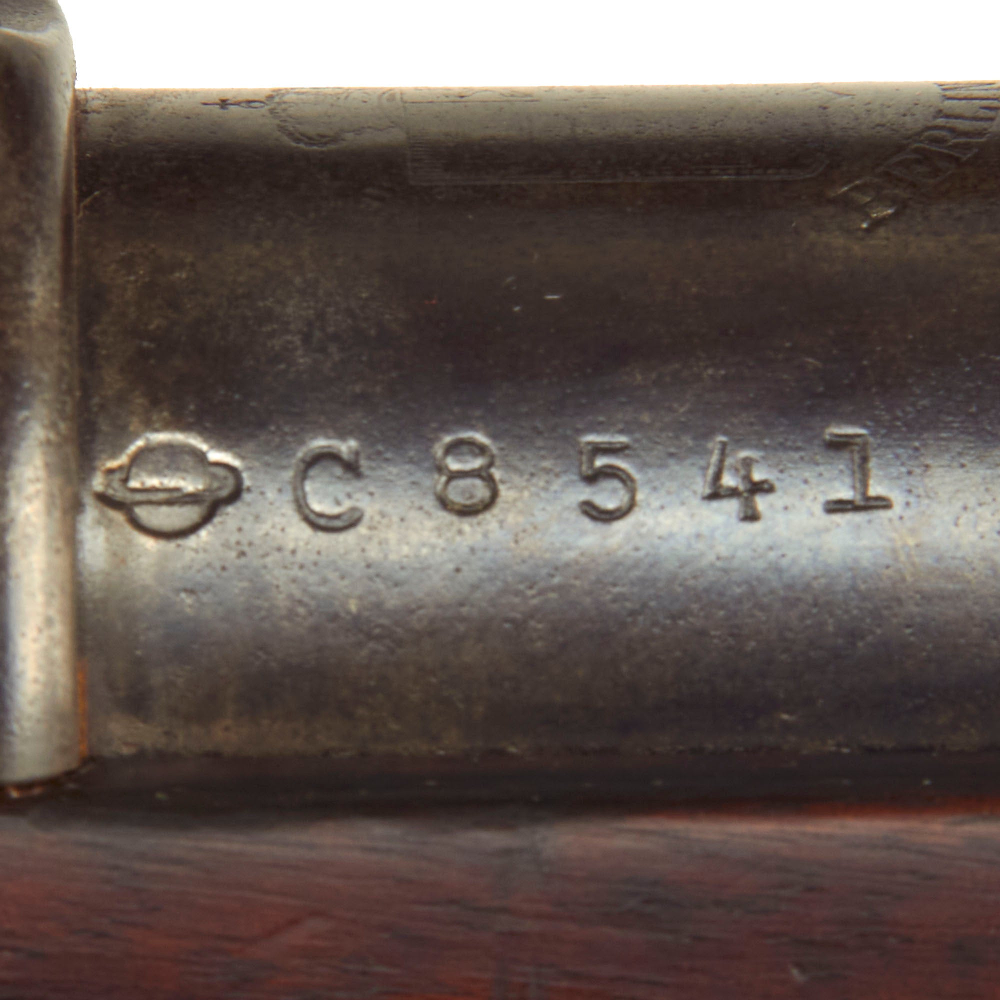 As this rifle is still marked Loewe, it was produced prior to this change, and it is indeed marked BERLIN 1894 on top of the chamber, directly under a worn Spanish Royal coat of arms. It is also marked with serial number C8541 on the side of the chamber. The same number is stamped onto the bolt handle (faint) and the magazine housing, with shortened number 41 on the magazine floor plate. This definitely looks to be a very nice "All Matching" example!