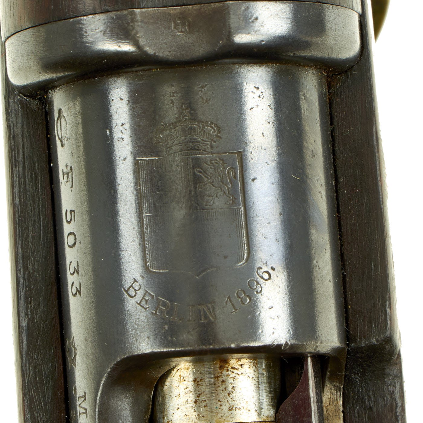 As this rifle is still marked Loewe, it was produced prior to this change, and it is indeed faintly marked BERLIN 1896 on top of the chamber, directly under a faint Spanish Royal coat of arms. It is also marked with serial number F5033 on the side of the chamber. The same number is stamped onto the bolt handle and the magazine housing in front of the floor plate. This definitely looks to be a very nice "All Matching" example, and it is a great one, complete with an original bayonet and sling!