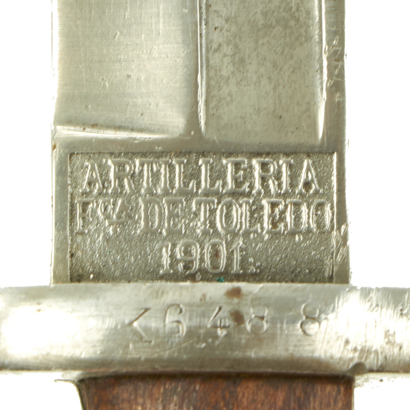 The included bayonet is the correct M1893 Spanish production, marked ARTILLERIA F'ca DE TOLEDO 1901., for 1901 manufacture at the Toledo Artillery Factory, the main manufacturer of Spanish military edged weapons of the period. It has some wear, but is still in the original issued configuration. It comes complete with an all leather scabbard, riveted into a leather belt frog. The bayonet fits the rifle well, and locks into place correctly.