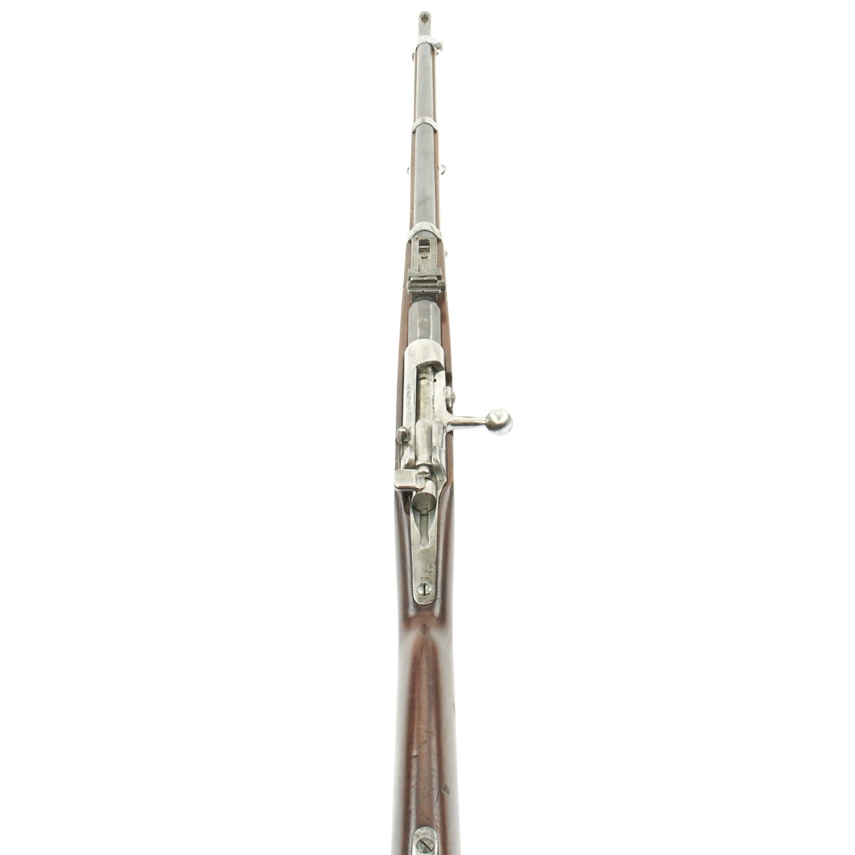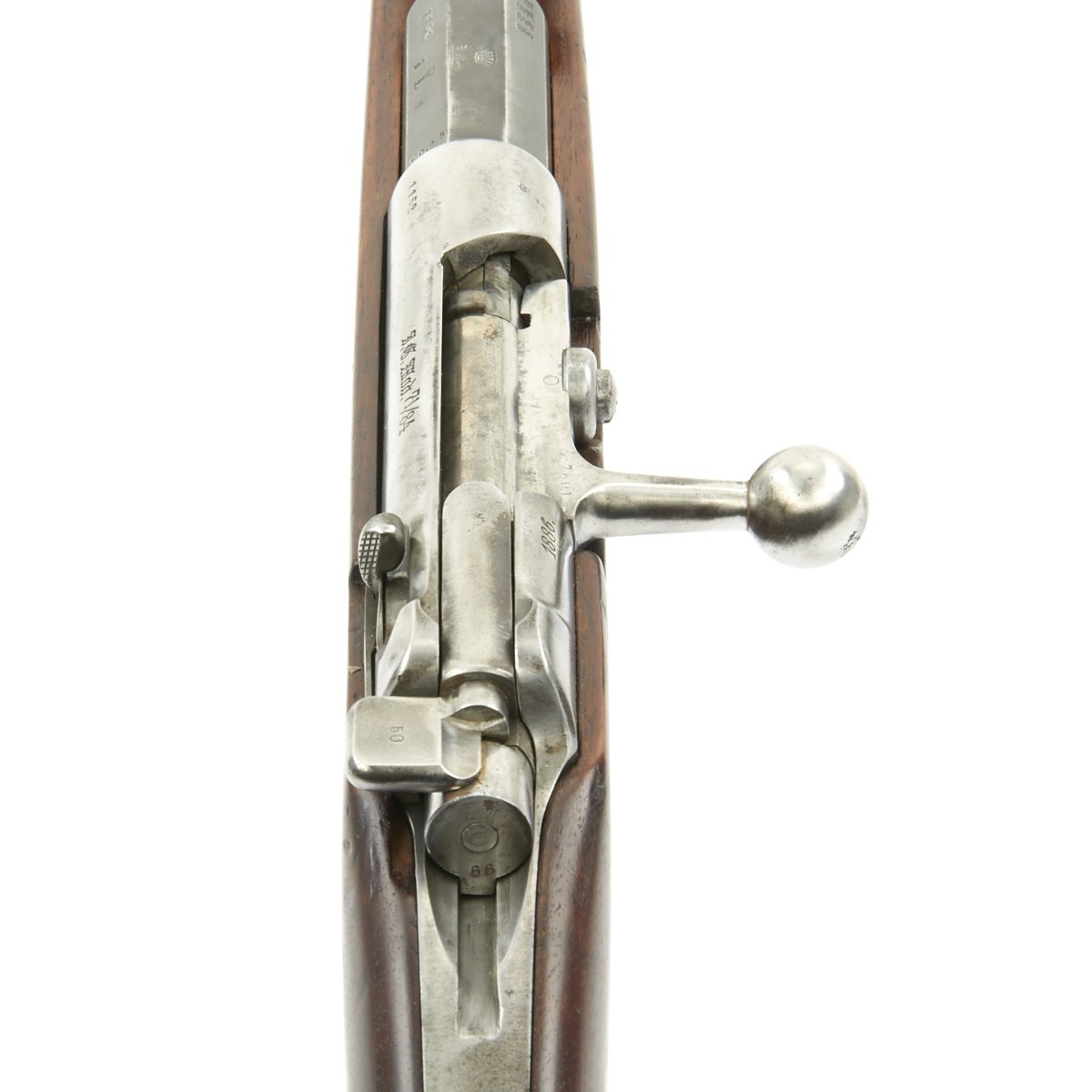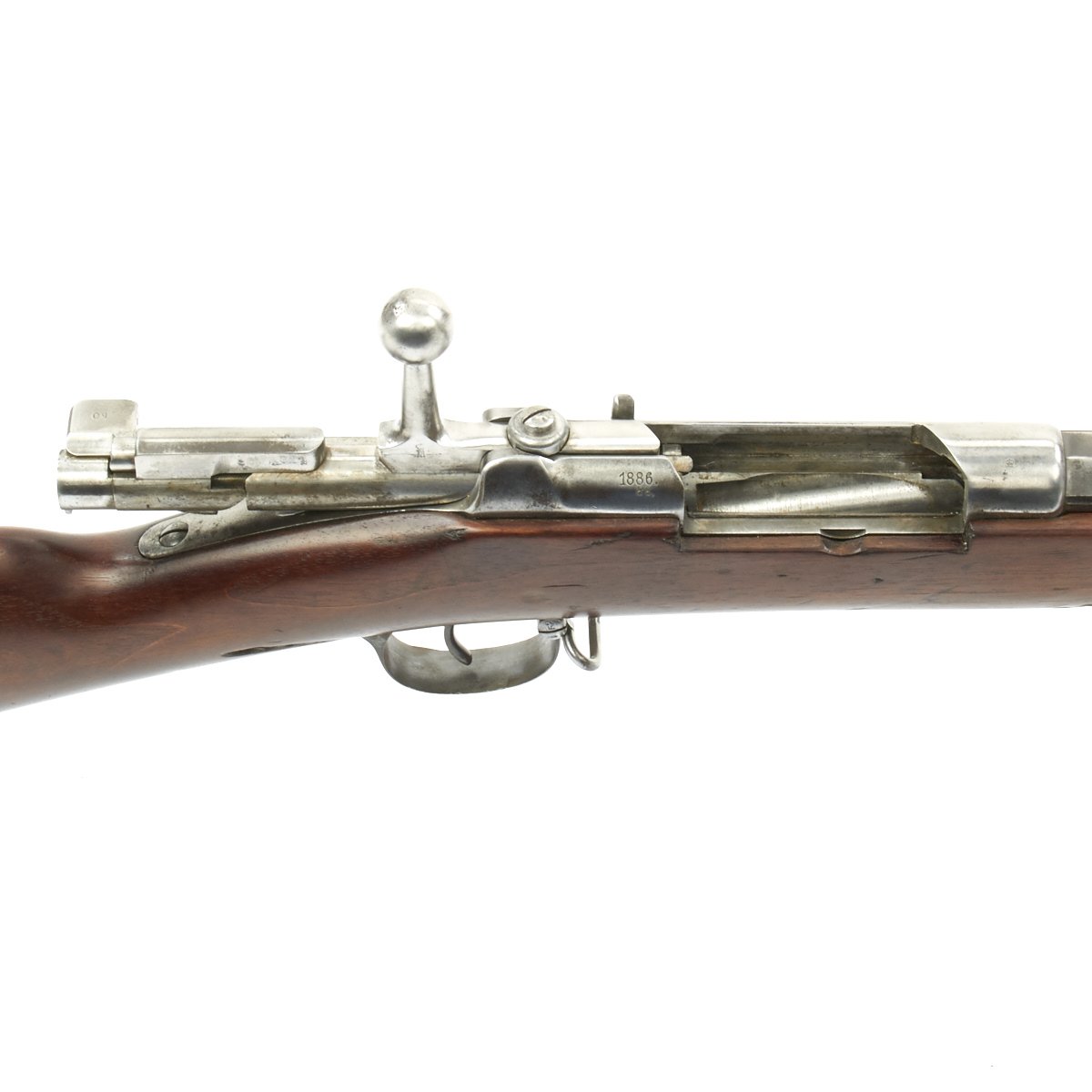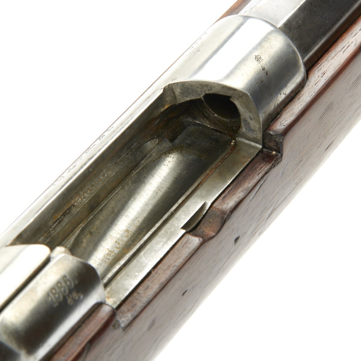 The receiver is dated 1886. and marked I. G. Mod. 71/84. on the opposite side. The rifle is complete with all major parts intact and functional, and in good condition. The exterior metal finish is blued on the barrel, and bright on other components of the rifle. The markings are still crisp on the metalwork, so this rifle does not appear to have had the metal refinished or subjected to major cleaning, and is quite attractive. The wood stock is good condition, with a great color and some nice curl, with the expected dents and dings of long service. It definitely has been sanded down a bit, resulting in the proofs being hard to read.