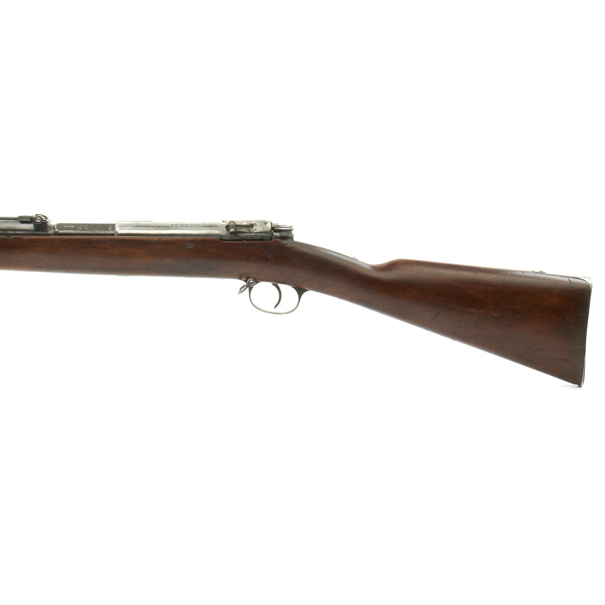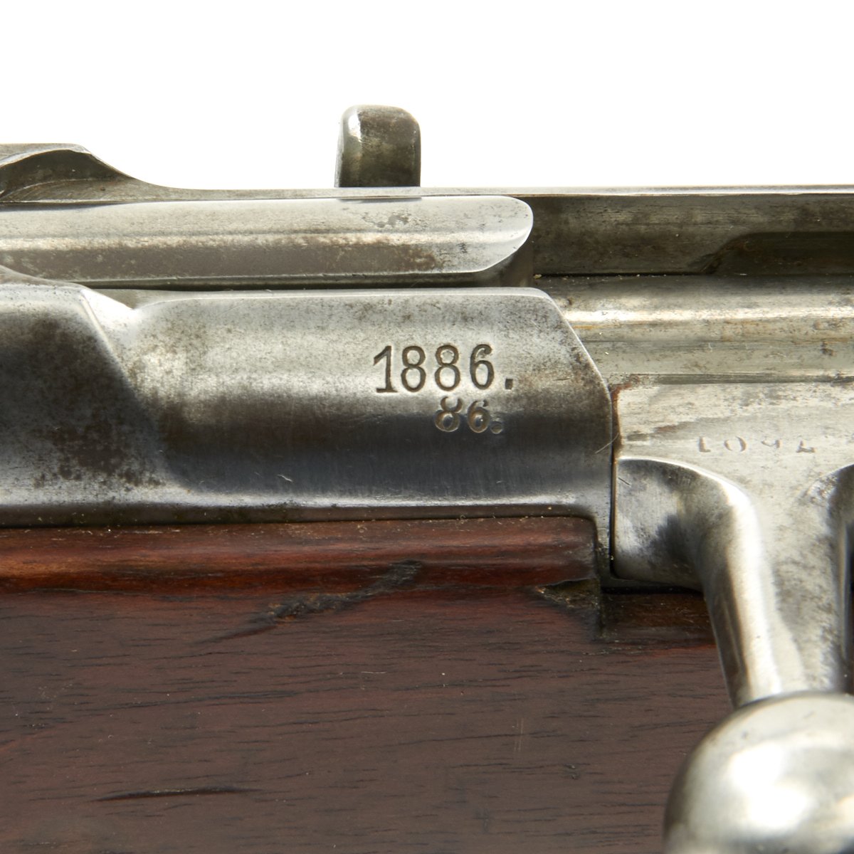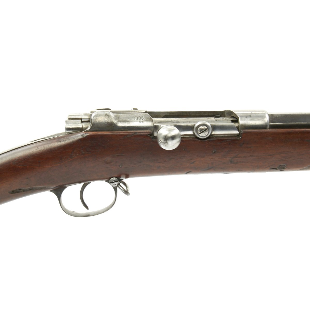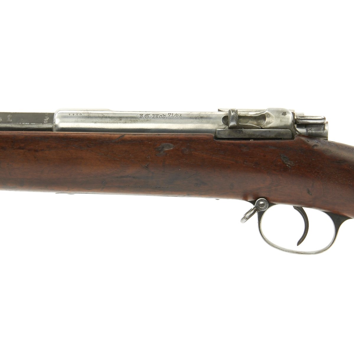 The receiver is dated 1886. and marked I. G. Mod. 71/84. on the opposite side. The rifle is complete with all major parts intact and functional, and in good condition. The exterior metal finish is blued on the barrel, and bright on other components of the rifle. The markings are still crisp on the metalwork, so this rifle does not appear to have had the metal refinished or subjected to major cleaning, and is quite attractive. The wood stock is good condition, with a great color and some nice curl, with the expected dents and dings of long service. It definitely has been sanded down a bit, resulting in the proofs being hard to read.