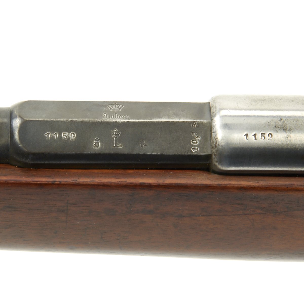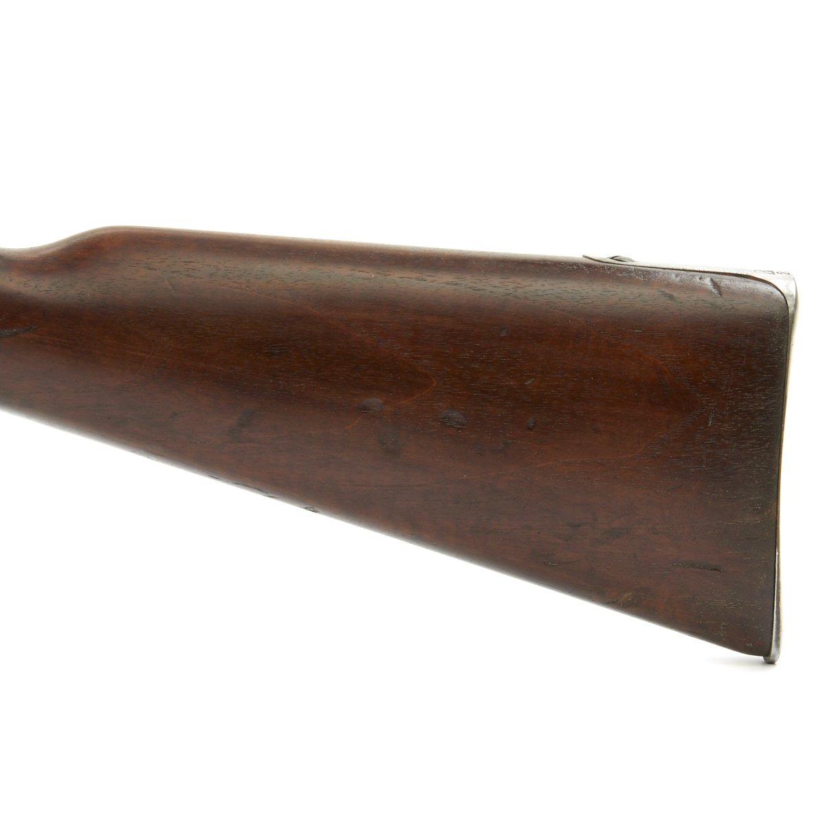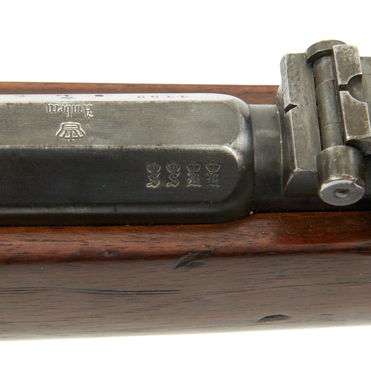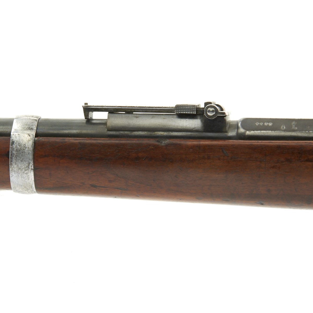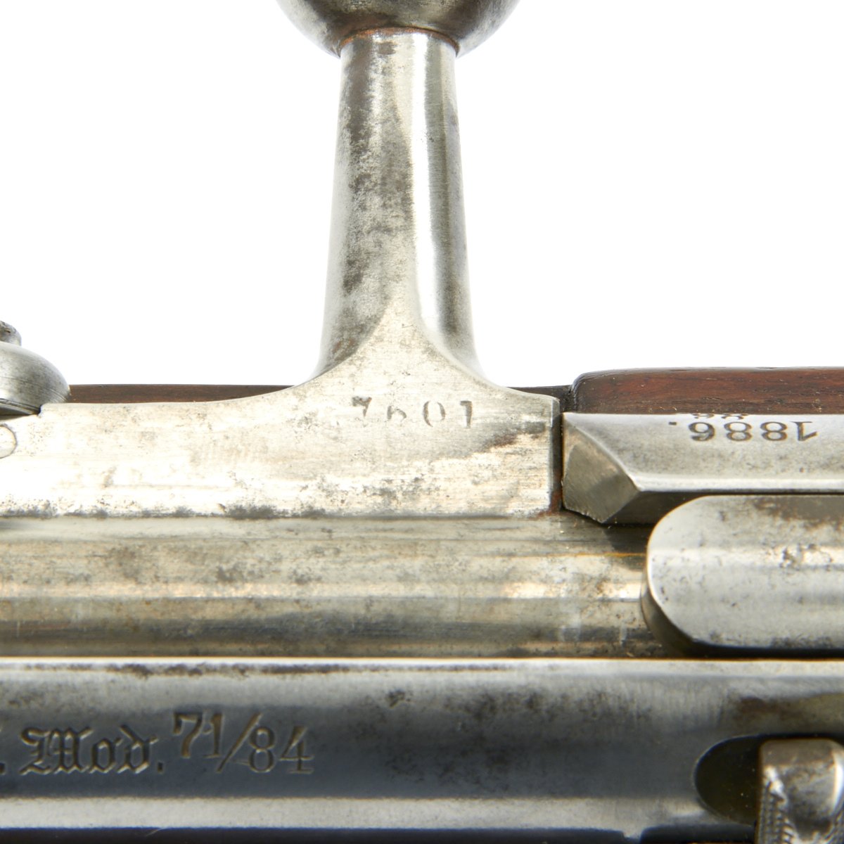 Original Item: Only One Available. This is a nice example of the Mauser Model 1871/84 rifle, which is covered with Imperial German and Bavarian inspection and acceptance markings on the metal work, though they are a bit worn in places. The serial number 1152 appears on the barrel, butt plate, and receiver, while the barrel bands, butt plate, and many screws and other parts have shortened number 52. The bolt has serial number 7601 and other numbers on the components. It was common in most countries for obsolete long arms to be refurbished are arsenal for use by reserve and home guards.