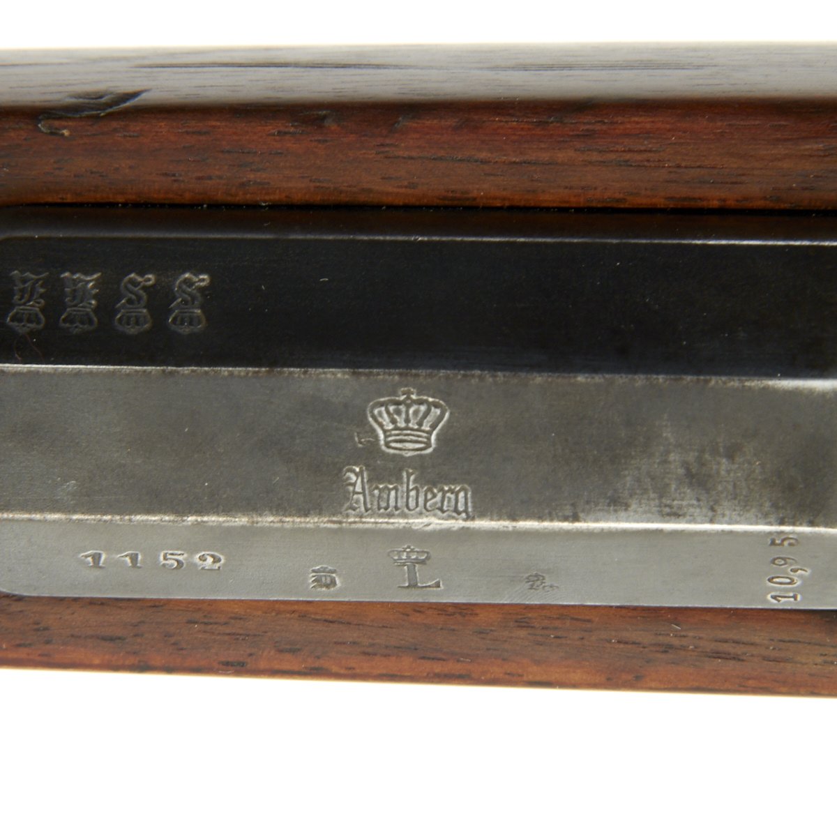 The bore is in excellent condition, with crisp lands and grooves, and a bright finish. The top of the chamber is marked (Crown) over Amberg, for the Bavarian (and later Imperial) arsenal in Amberg, in the Kingdom of Bavaria. Below this is the Crown over L proof for King Ludwig II of Bavaria, who reigned from 1864–1886. The butt plate still has the original REGIMENTAL MARKINGS, with B.8 R. / 2. 115., for the 8th Royal Bavarian Infantry "Grand Duke Frederick II of Baden" Regiment, 2nd company, Weapon 115. From what we can see, this is the only regimental marking that this weapon was marked with.