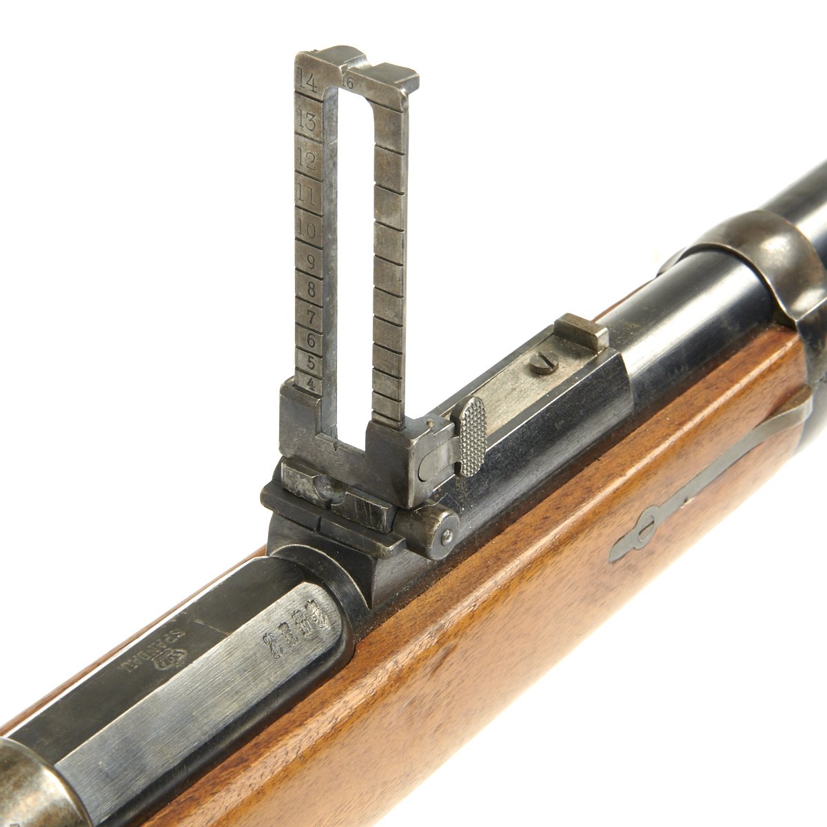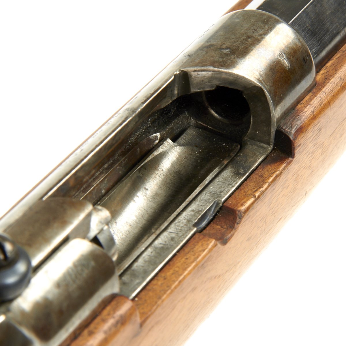 The rifle is complete with all major parts intact and functional. The exterior metal finish on the fittings does show some wear, but still has a lot of the original bluing, and is most attractive. The wood stock is in very good condition, and has not been sanded down at all, so all proofs are clear and crisp. The beech wood has a lovely amber color, with a good amount of flame/figuring on the buttstock. There are two gouges on the sides upper fore stock above the upper sling swivel, which are the only thing keeping this stock from being excellent. There are also some small gouges in the metal around this area, rather suggesting that the rifle was used to defend against an edged weapon while in service.