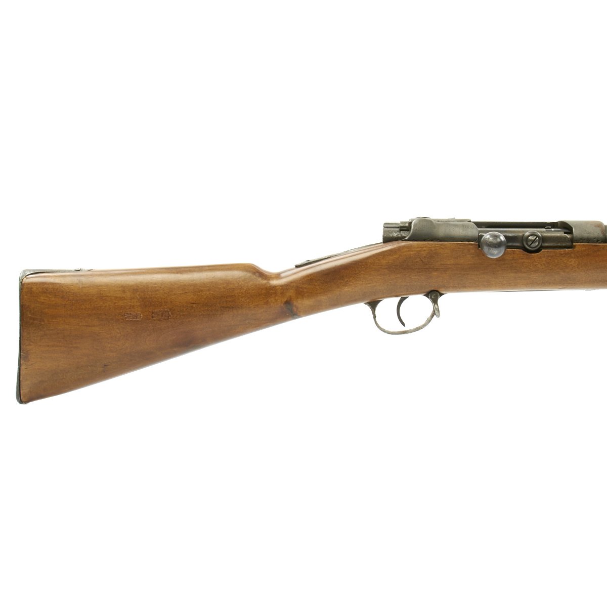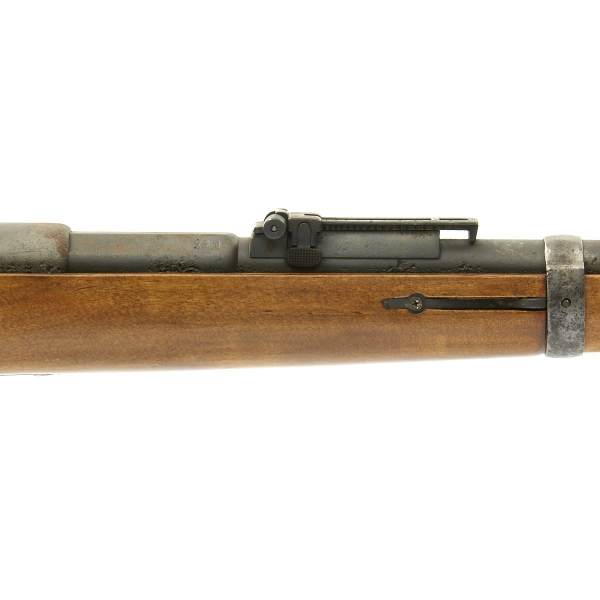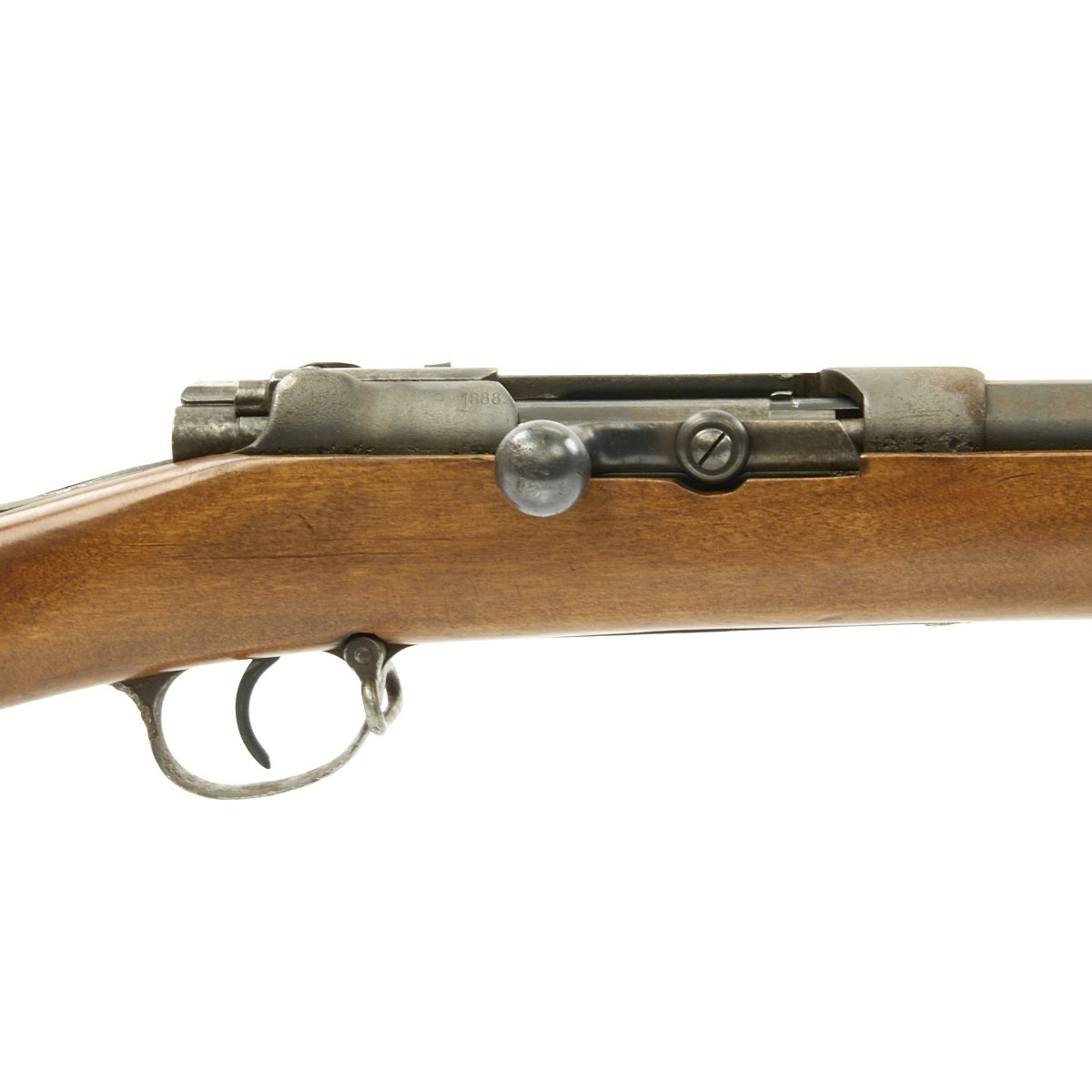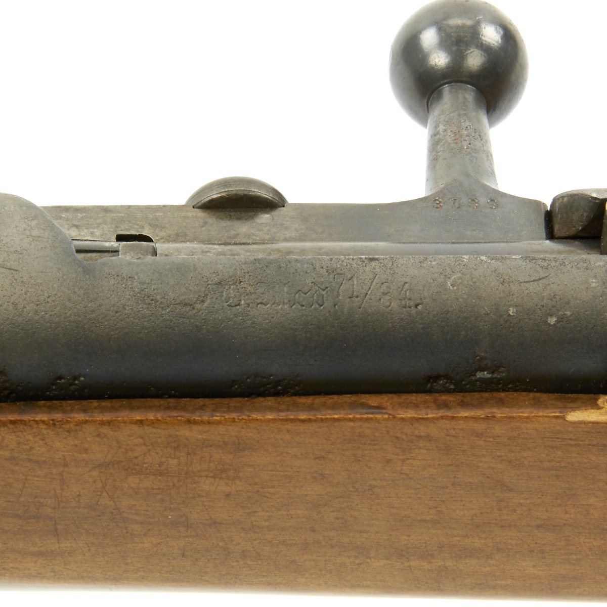 The receiver is dated 1888. and marked I. G. Mod. 71/84. on the opposite side. The rifle is complete with all major parts intact and functional, and in good condition. The metalwork was definitely refurbished, and there was significant woodline rust prior to this, and it now has a gray peppered patina. The stock looks to be an arsenal replacement, with some very nice proof marks, and a light finish. The stock has been sanded in areas, so it does not meet up with the metalwork completely.