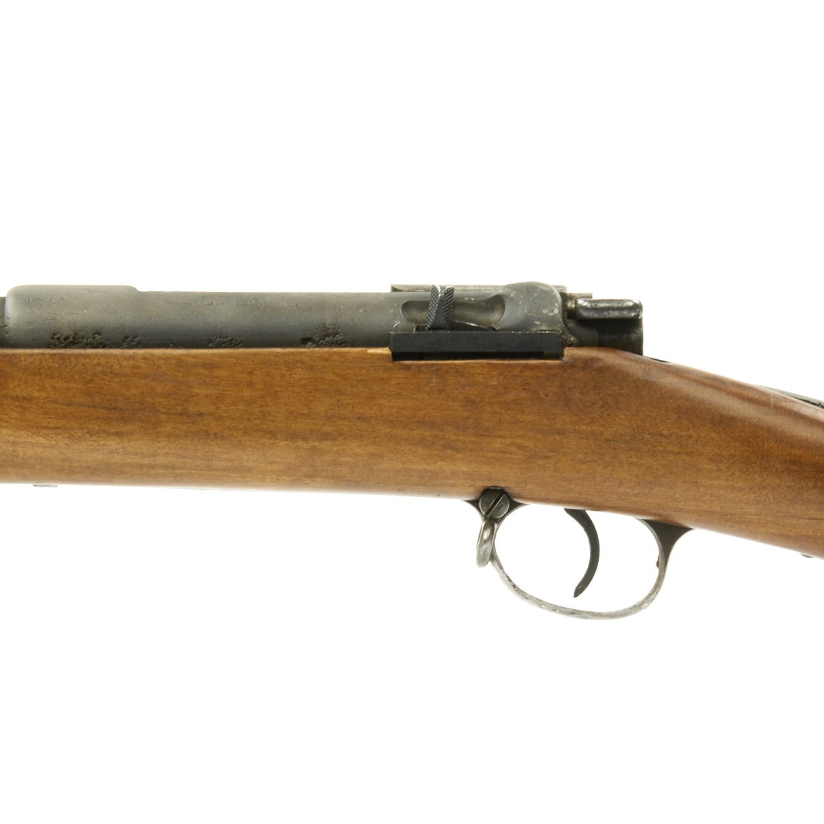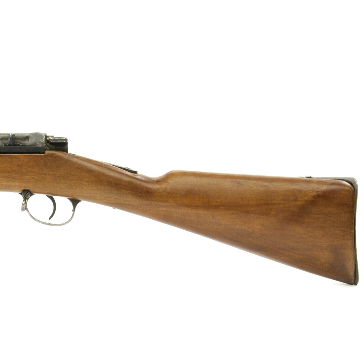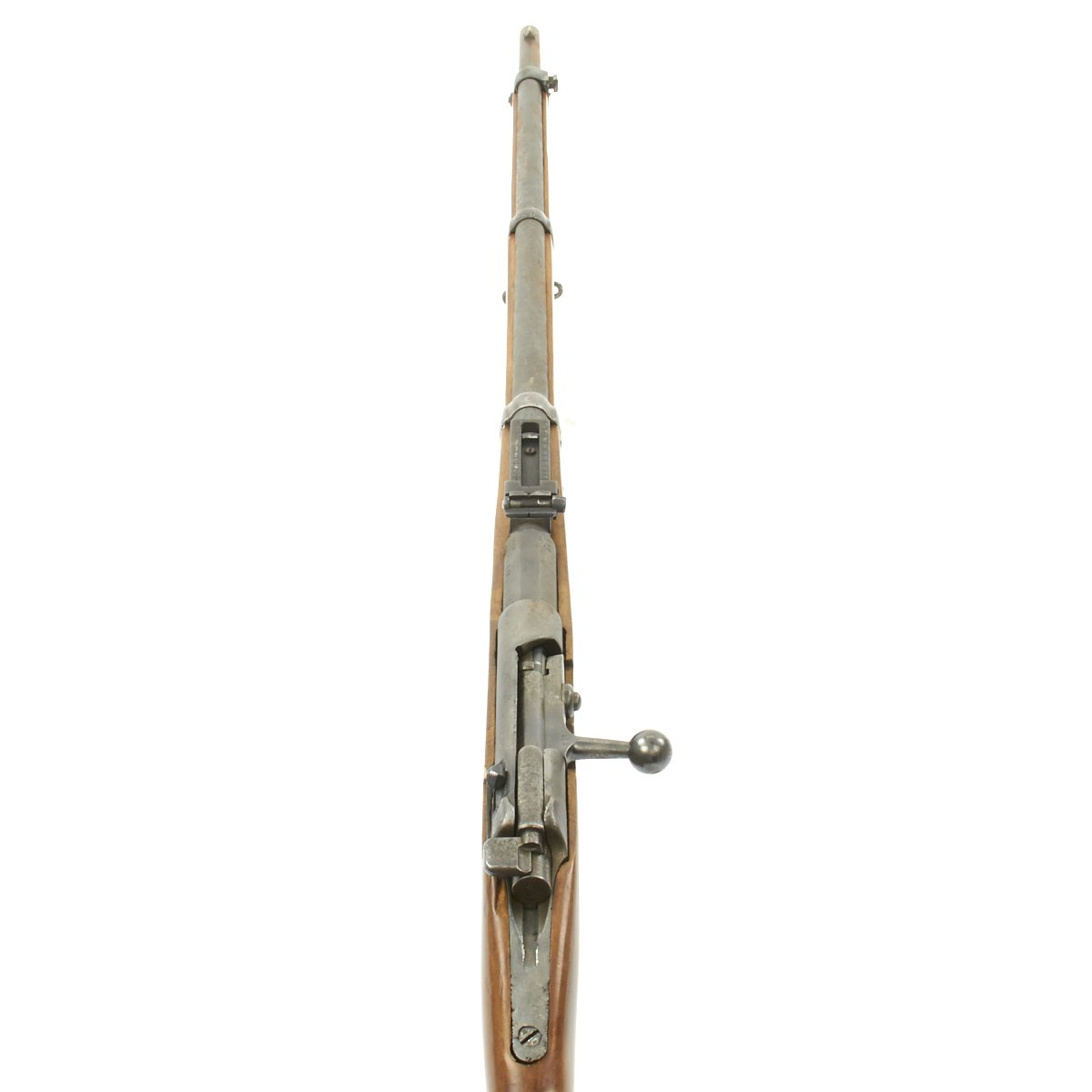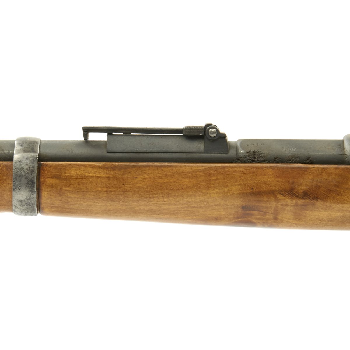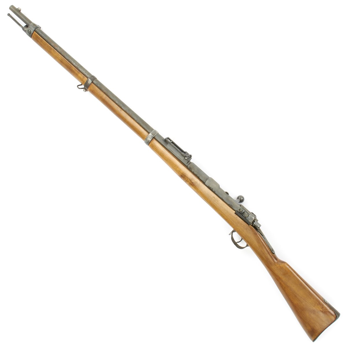 The receiver is dated 1888. and marked I. G. Mod. 71/84. on the opposite side. The rifle is complete with all major parts intact and functional, and in good condition. The metalwork was definitely refurbished, and there was significant woodline rust prior to this, and it now has a gray peppered patina. The stock looks to be an arsenal replacement, with some very nice proof marks, and a light finish. The stock has been sanded in areas, so it does not meet up with the metalwork completely.