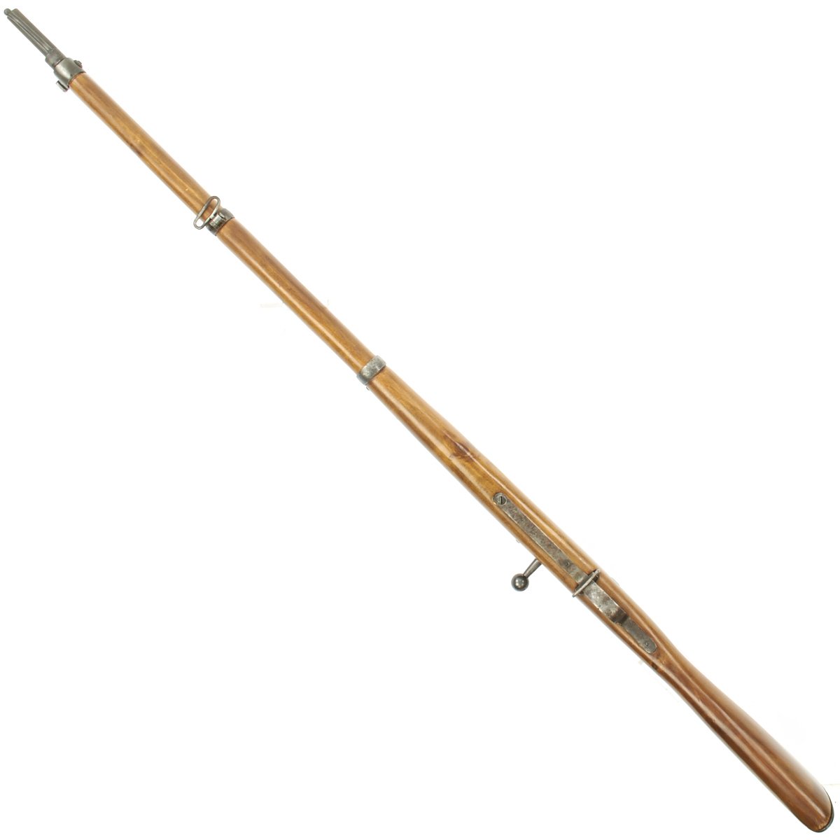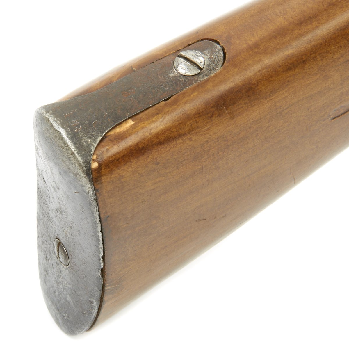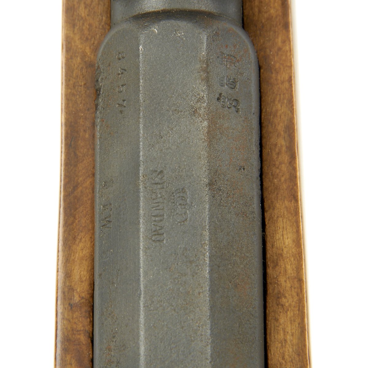 The bore is in good condition, with clear lands and grooves, with a partly bright finish. There are some areas of oxidation in places, probably from lack of cleaning. The top of the chamber is marked Crown over SPANDAU, for the Prussian (and later Imperial) Spandau arsenal in Berlin, a storied production plant that would produce weapons up until 1919, including the famous MG08 Maxim. Below this is the Crown over FW proof for Kaiser Wilhelm I, who used the F.W. monogram. The butt plate is faintly regimentally marked, with 9. R. / 4. 53., probably for the 9th Reserve infantry, 4th battalion, 53rd weapon. Most likely this is not the first regimental mark this rifle has borne.