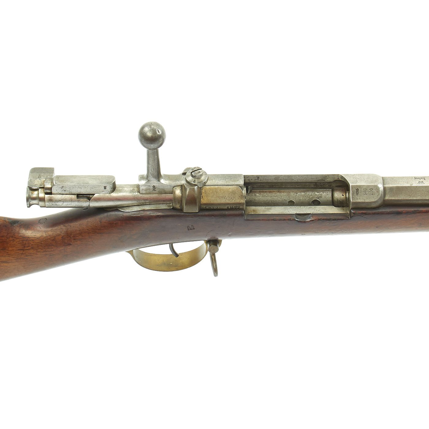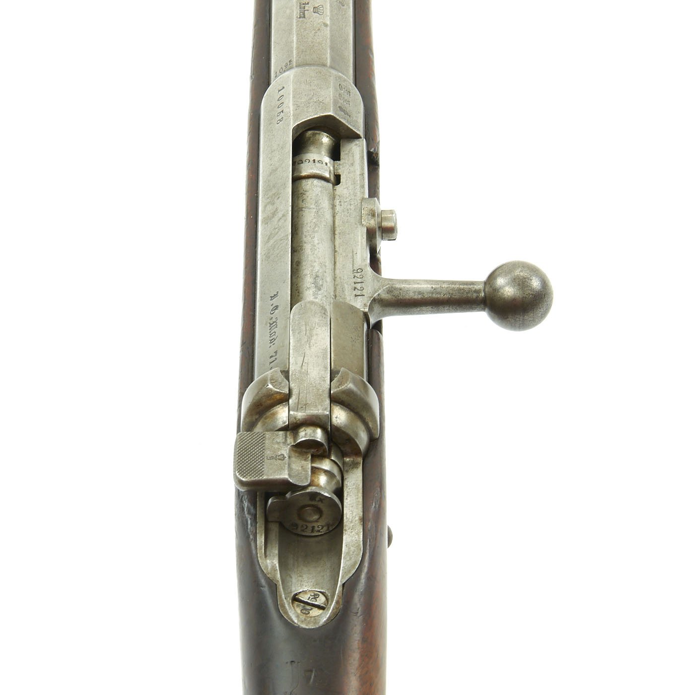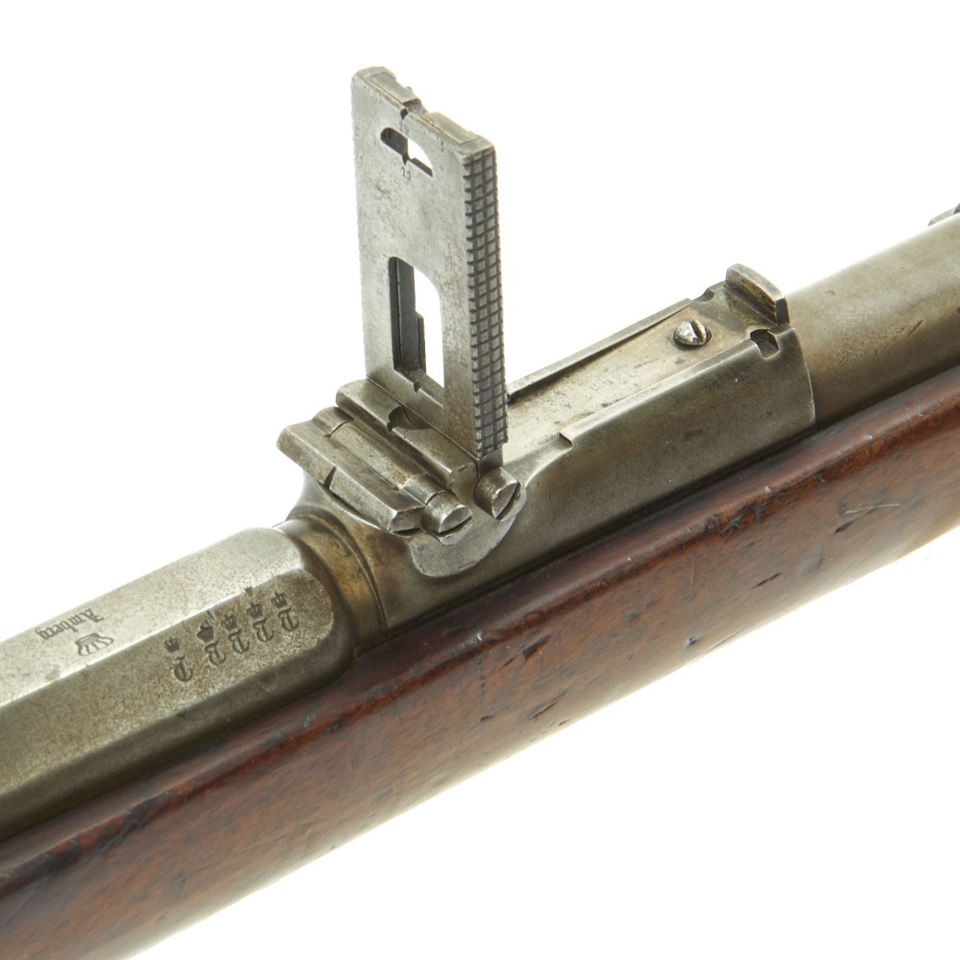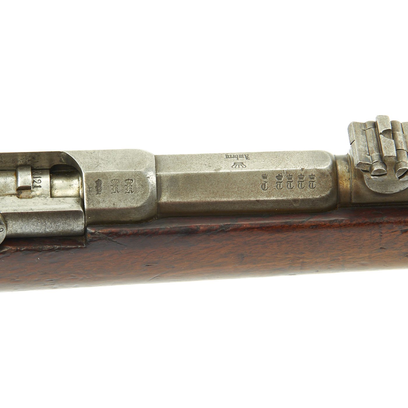 The receiver is dated twice with 1877 and marked I. G. Mod. 71 on the opposite side in German "Black Letter" type. This stands for Infanterie Gewehr (Infantry Rifle) Model 71. The top of the barrel nocks form is marked (Crown) over Amberg, for the Bavarian (and later Imperial) arsenal in Amberg, in the Kingdom of Bavaria. Interestingly, there is neither a Bavarian Royal Cypher nor a German Imperial Cypher on the left side of the receiver. There also are no regimental markings or signs that they were removed, so it's possible this was originally kept as some type of production sample, or maybe sold out of service.