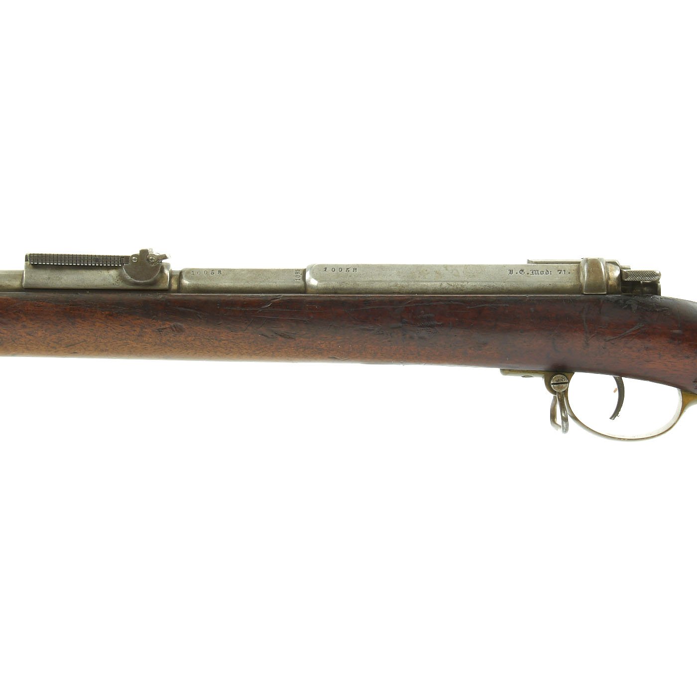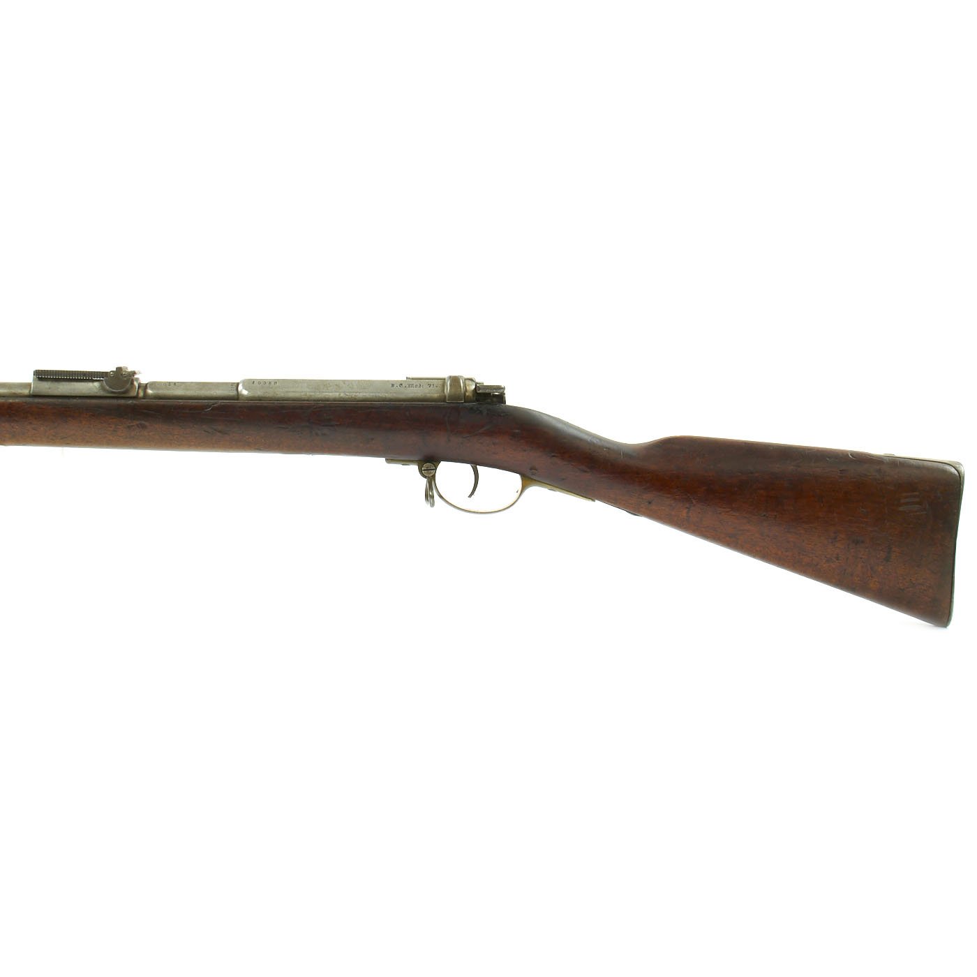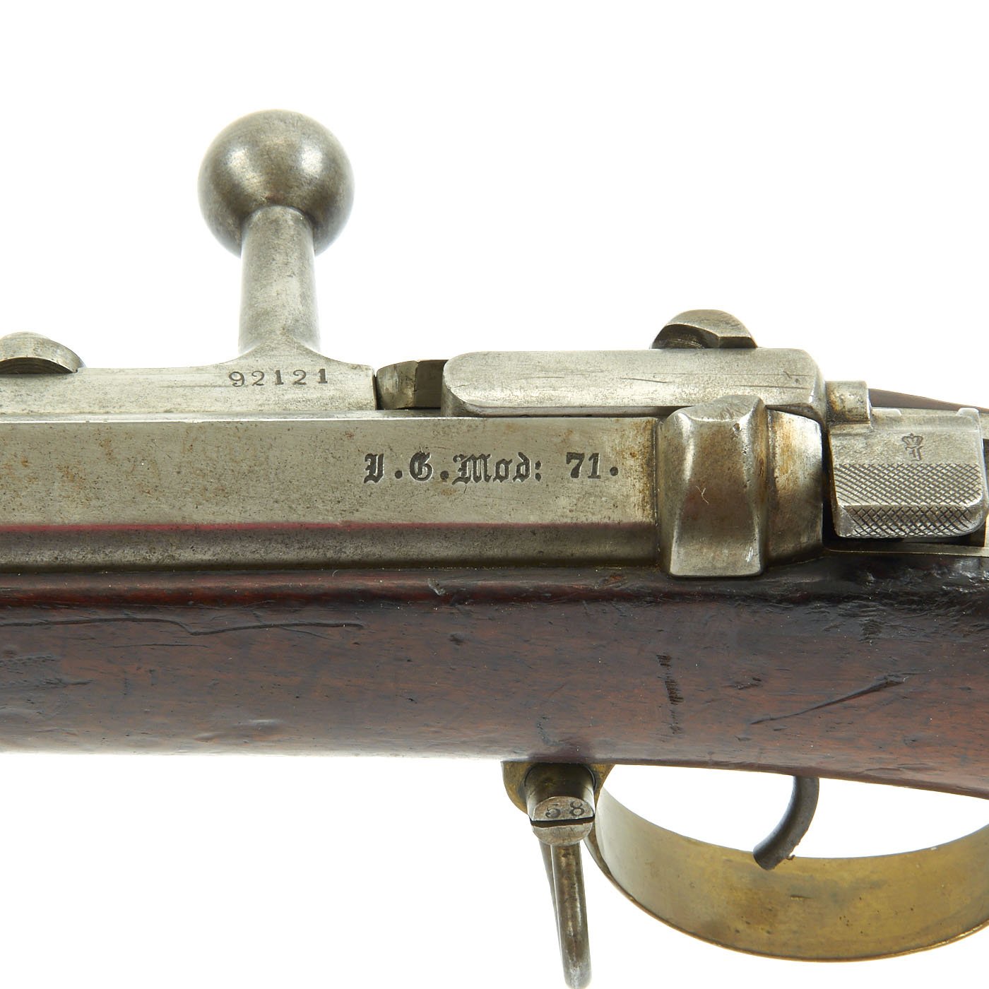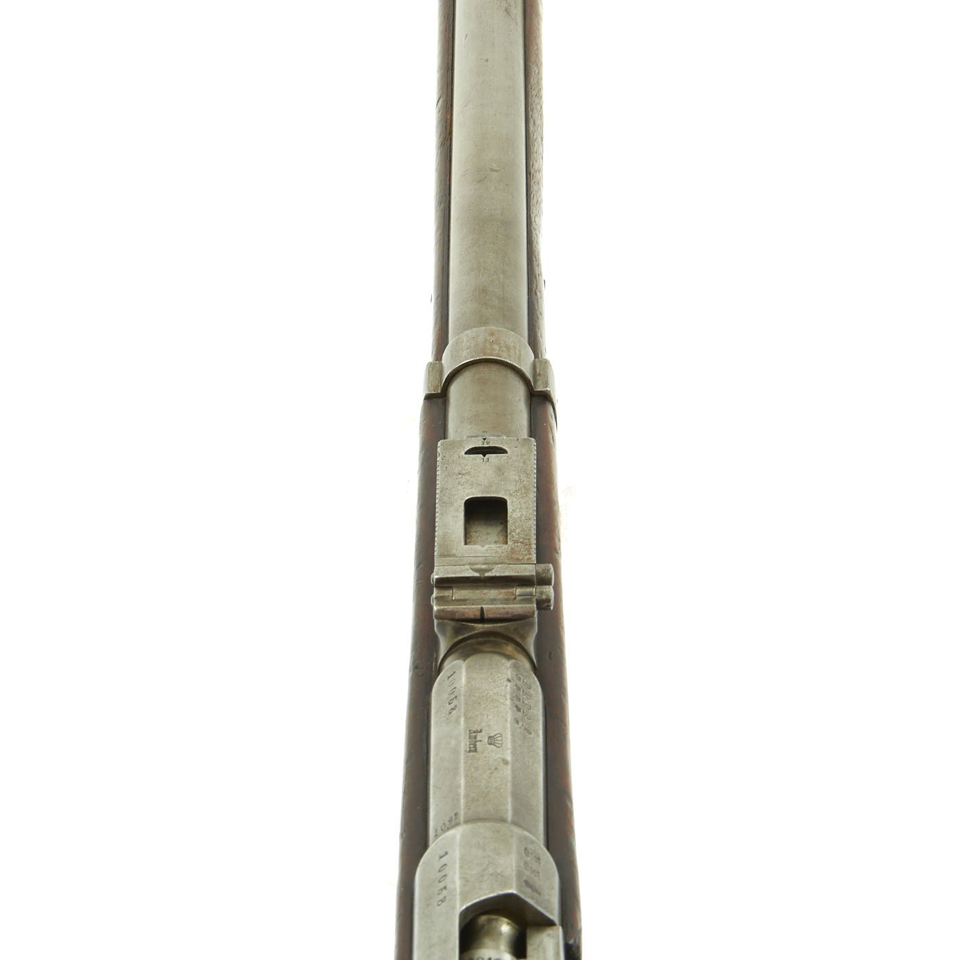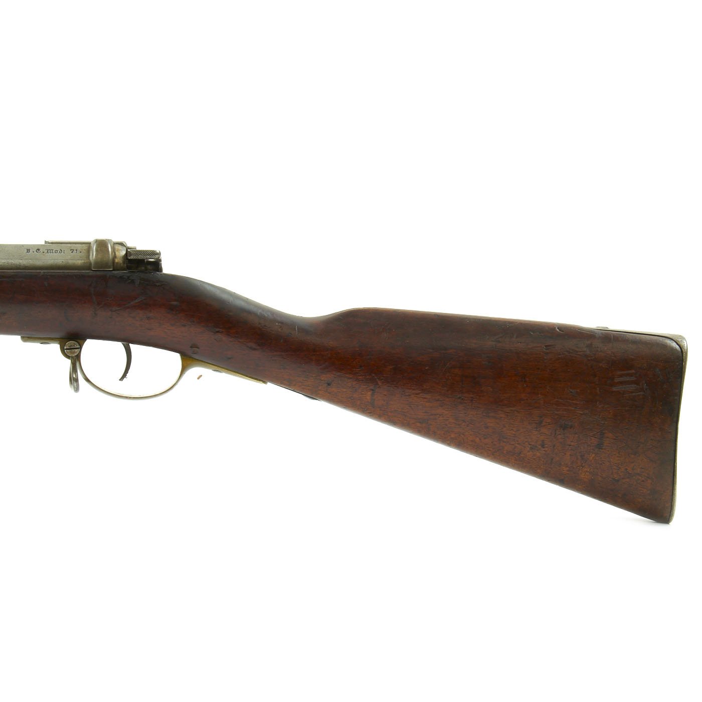 The receiver is dated twice with 1877 and marked I. G. Mod. 71 on the opposite side in German "Black Letter" type. This stands for Infanterie Gewehr (Infantry Rifle) Model 71. The top of the barrel nocks form is marked (Crown) over Amberg, for the Bavarian (and later Imperial) arsenal in Amberg, in the Kingdom of Bavaria. Interestingly, there is neither a Bavarian Royal Cypher nor a German Imperial Cypher on the left side of the receiver. There also are no regimental markings or signs that they were removed, so it's possible this was originally kept as some type of production sample, or maybe sold out of service.