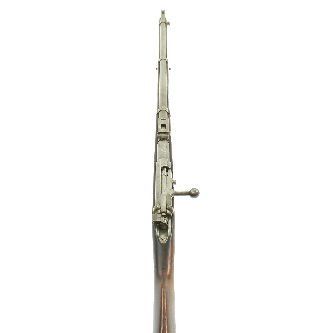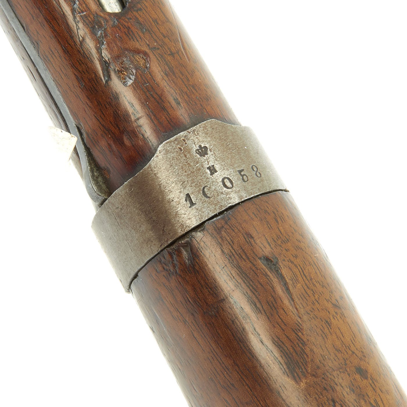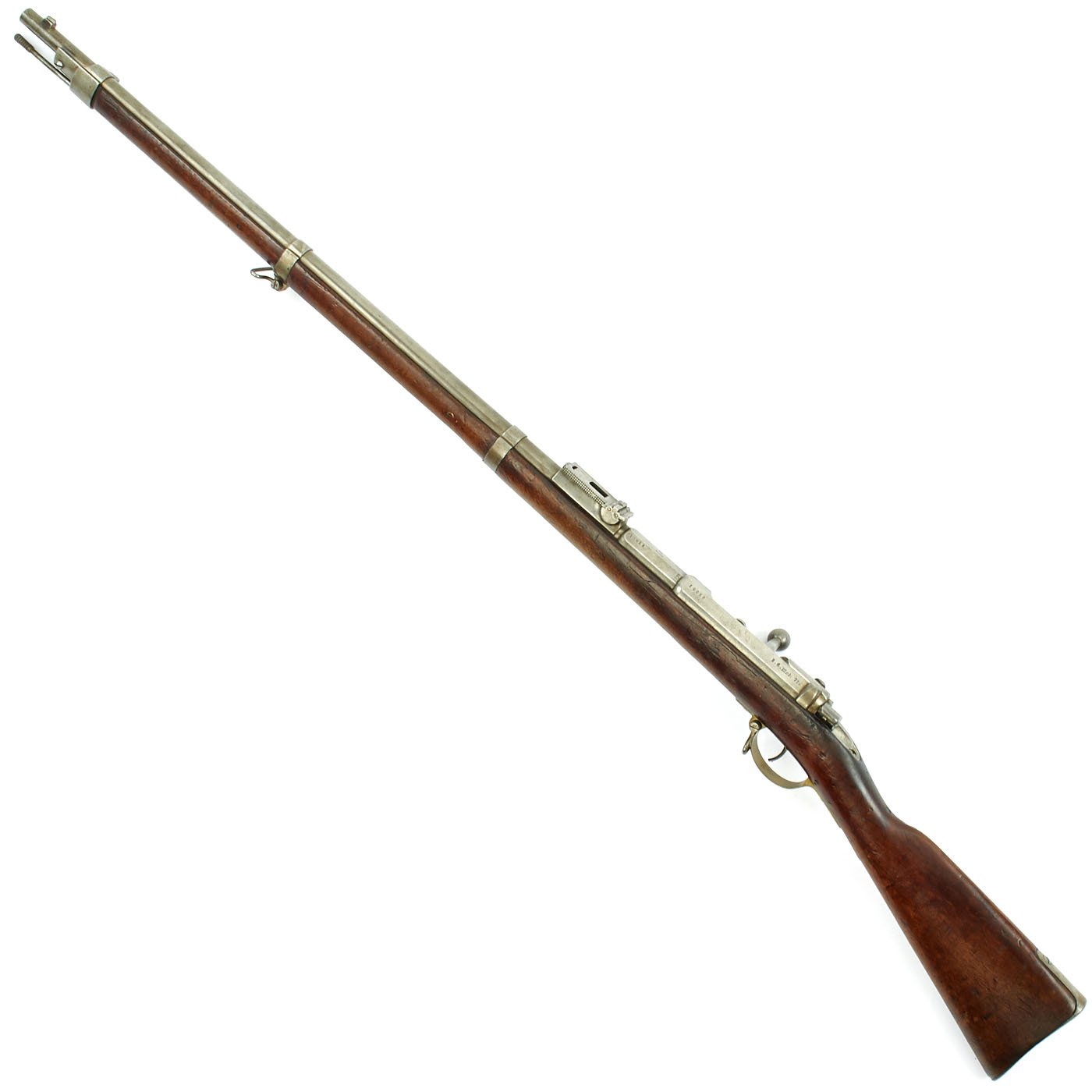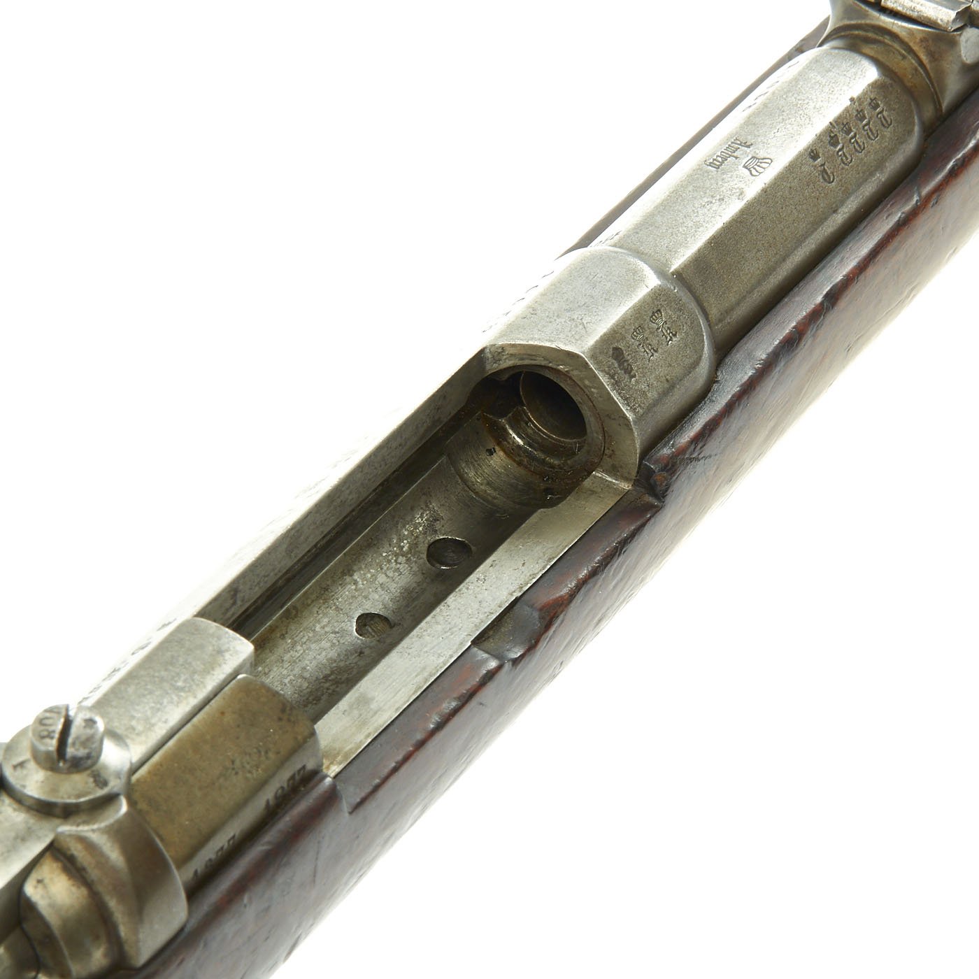 The receiver is dated twice with 1877 and marked I. G. Mod. 71 on the opposite side in German "Black Letter" type. This stands for Infanterie Gewehr (Infantry Rifle) Model 71. The top of the barrel nocks form is marked (Crown) over Amberg, for the Bavarian (and later Imperial) arsenal in Amberg, in the Kingdom of Bavaria. Interestingly, there is neither a Bavarian Royal Cypher nor a German Imperial Cypher on the left side of the receiver. There also are no regimental markings or signs that they were removed, so it's possible this was originally kept as some type of production sample, or maybe sold out of service.
