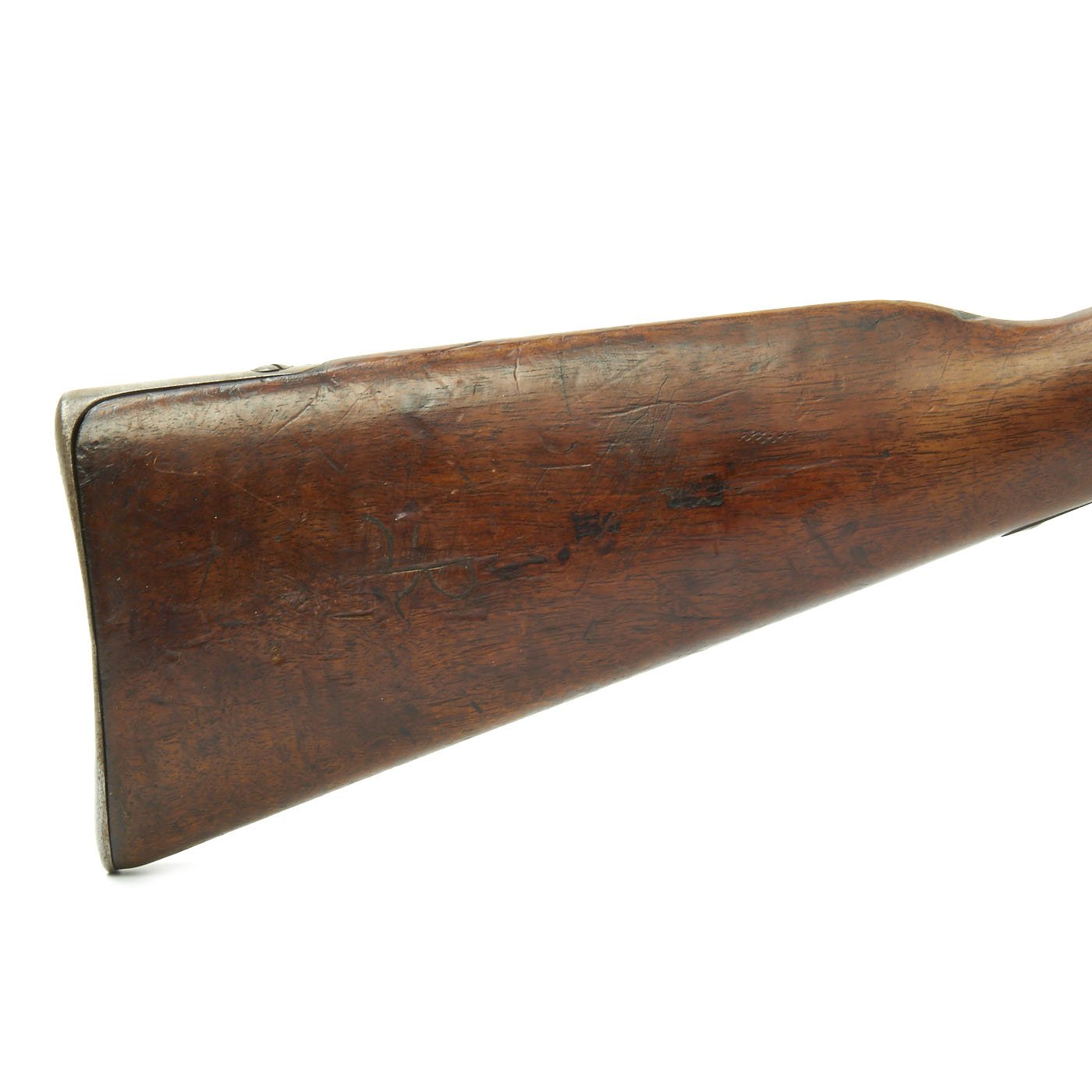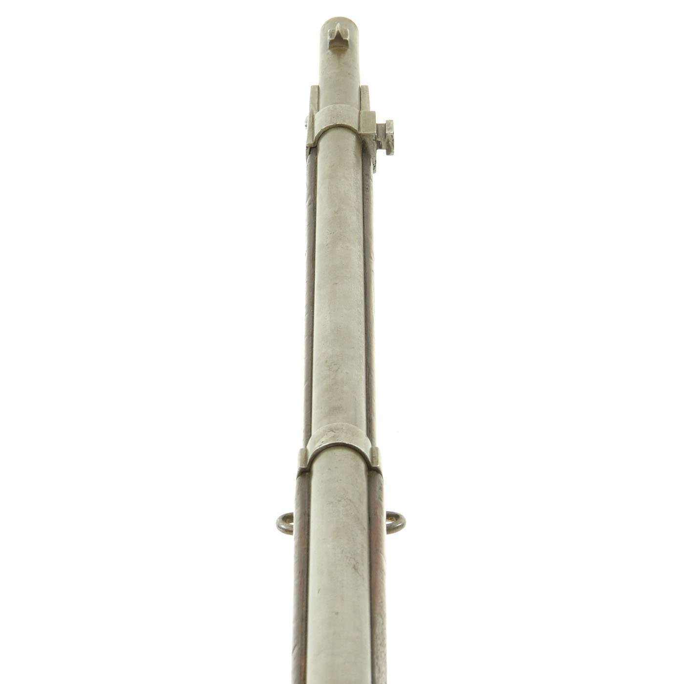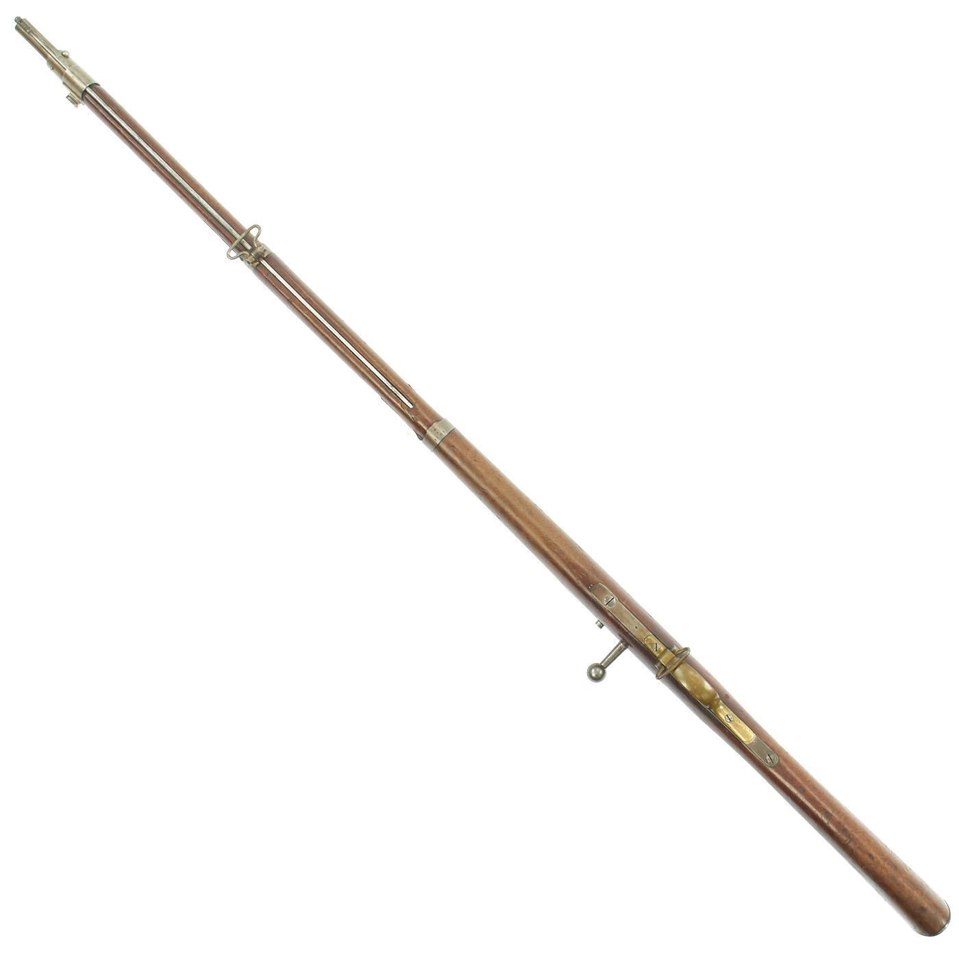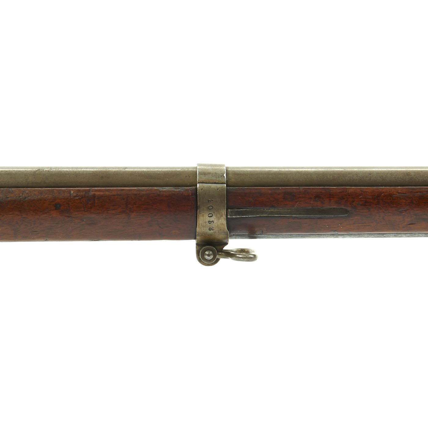 The Rifle comes complete with cleaning rod and is in good condition overall. Interestingly, it has a brass trigger guard installed. The rifle still has both sling swivels intact. The exterior metal finish shows years of polishing, and is now all dull steel, with evidence of light peppering in the past. The bore is in excellent condition, with crisp lands and grooves and a bright finish, so it was not fired much at all. The rifle cycles and dry fires correctly, an has an intact firing pin.
