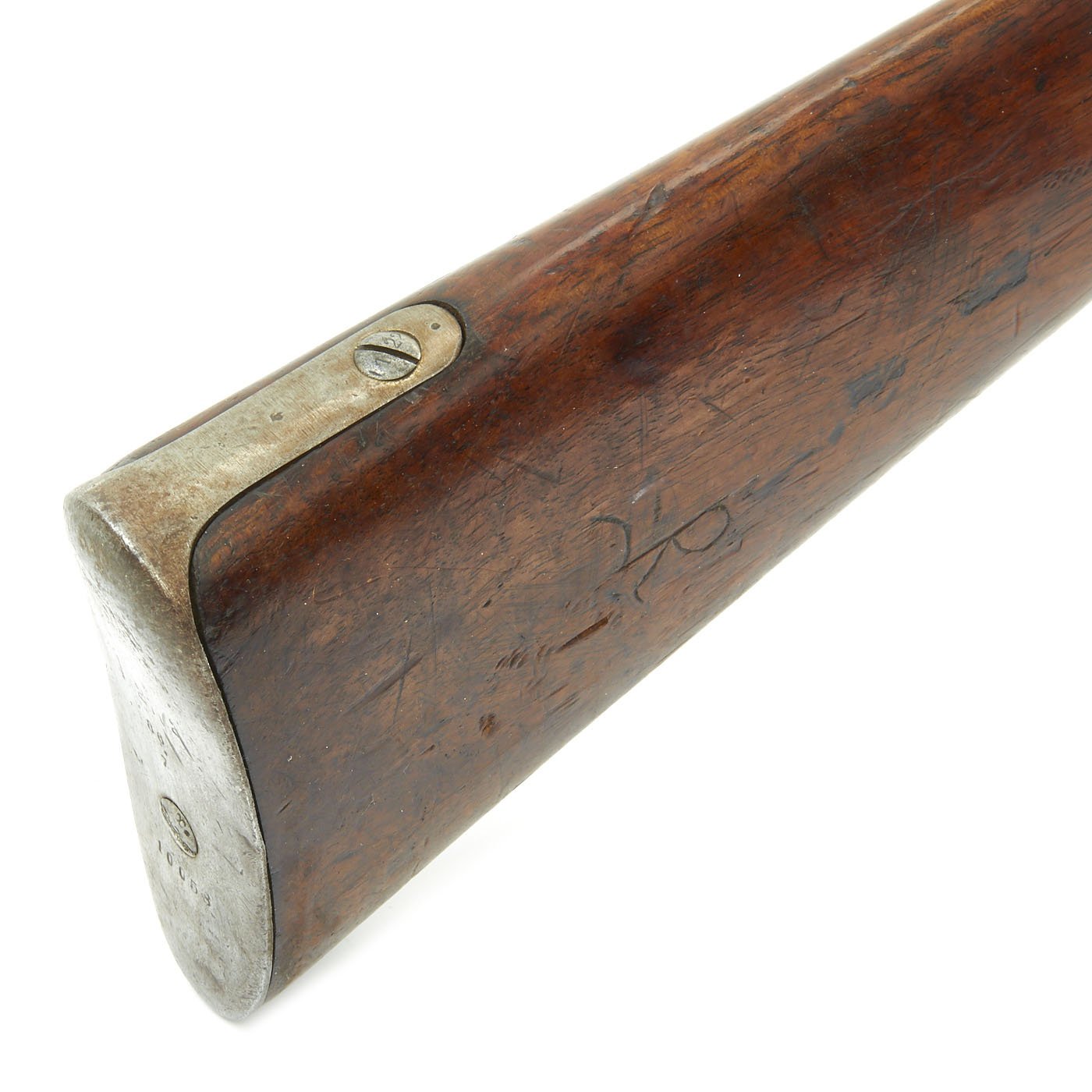 The stock looks very nice, though it has been sanded down a bit, which has made the original proof marks somewhat faint. It has a lovely color and great grain, with the usual dents and other marks from years of handling and service.