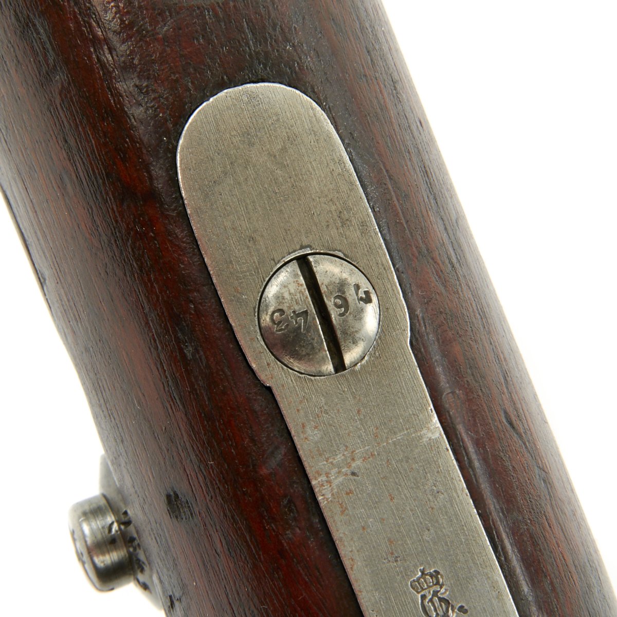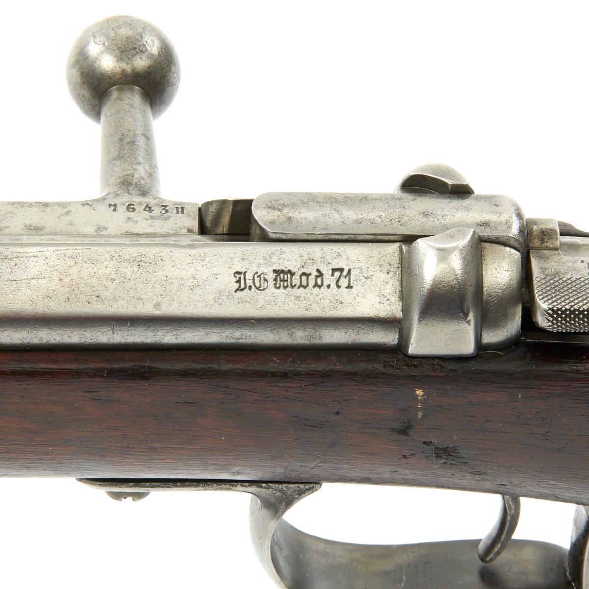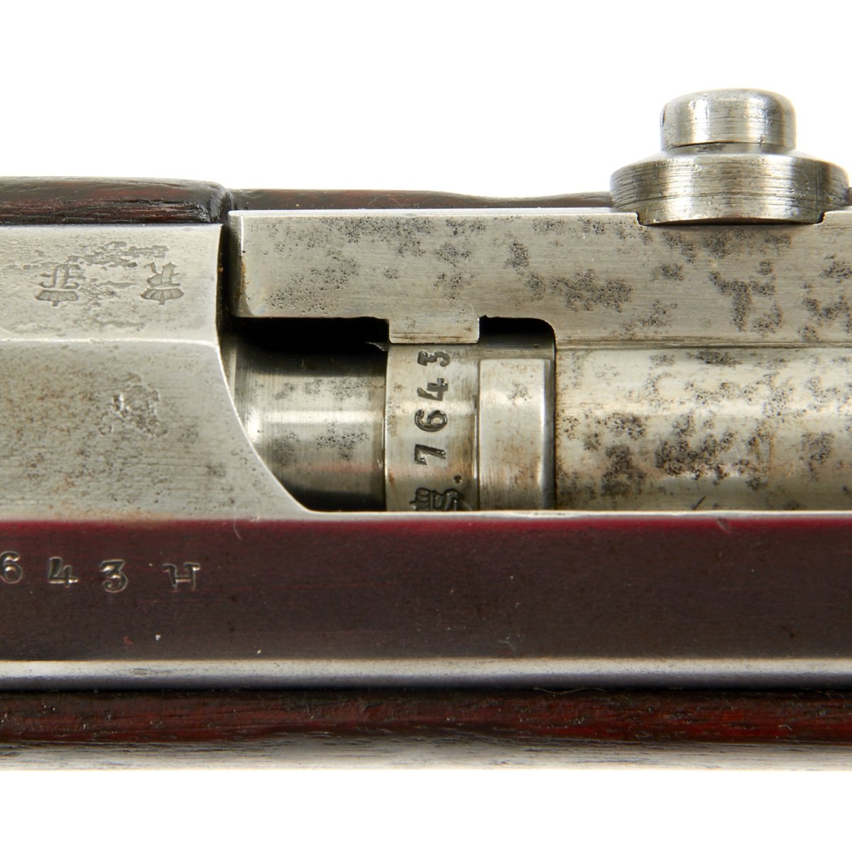 Original Item: Only One Available. This is a wonderful example of the Mauser Model 1871 Jäger Rifle, manufactured by ŒWG Steyr in Austria. It is covered with Imperial German inspection and acceptance markings, even on the wood stock. The serial number 7643H appears on all parts of the gun, even the barrel bands, nose cap, and many of the screws, making this an "ALL MATCHING" example, and it really is great. It even won 2nd prize in the "Overseas War Souvenirs" category at the 1984 Inter-State fair in York, PA.