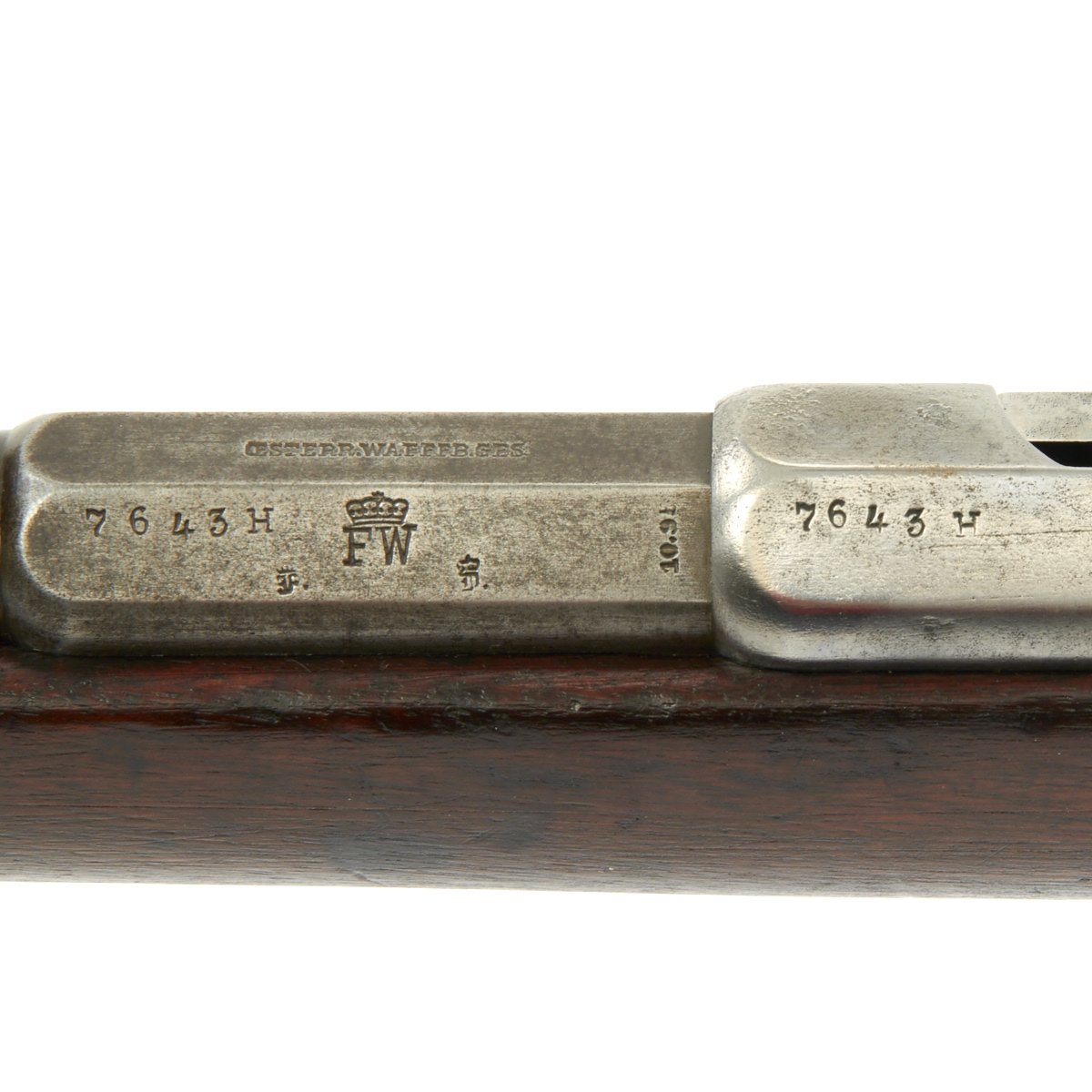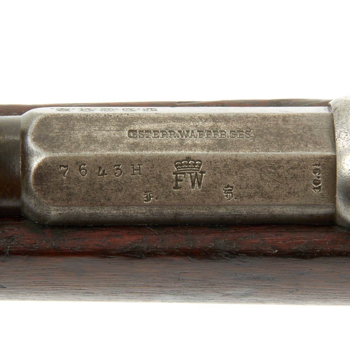 The receiver is dated 1876 and marked I. G. Mod. 71 on the opposite side in German "Black Letter" type. This stands for Infanterie Gewehr (Infantry Rifle) Model 71. The top of the barrel knoxform is marked ŒSTERR. WAFFFB. GES., an abbreviation of "Österreichische Waffenfabriksgesellschaft", or the Austrian Arms-Manufacturing Company. Part of ŒWG was Steyr-Mannlicher, known mainly as Steyr, who continue to make firearms to this day. Below this is the Crown over FW proof for Kaiser Wilhelm I, who used the F.W. monogram.