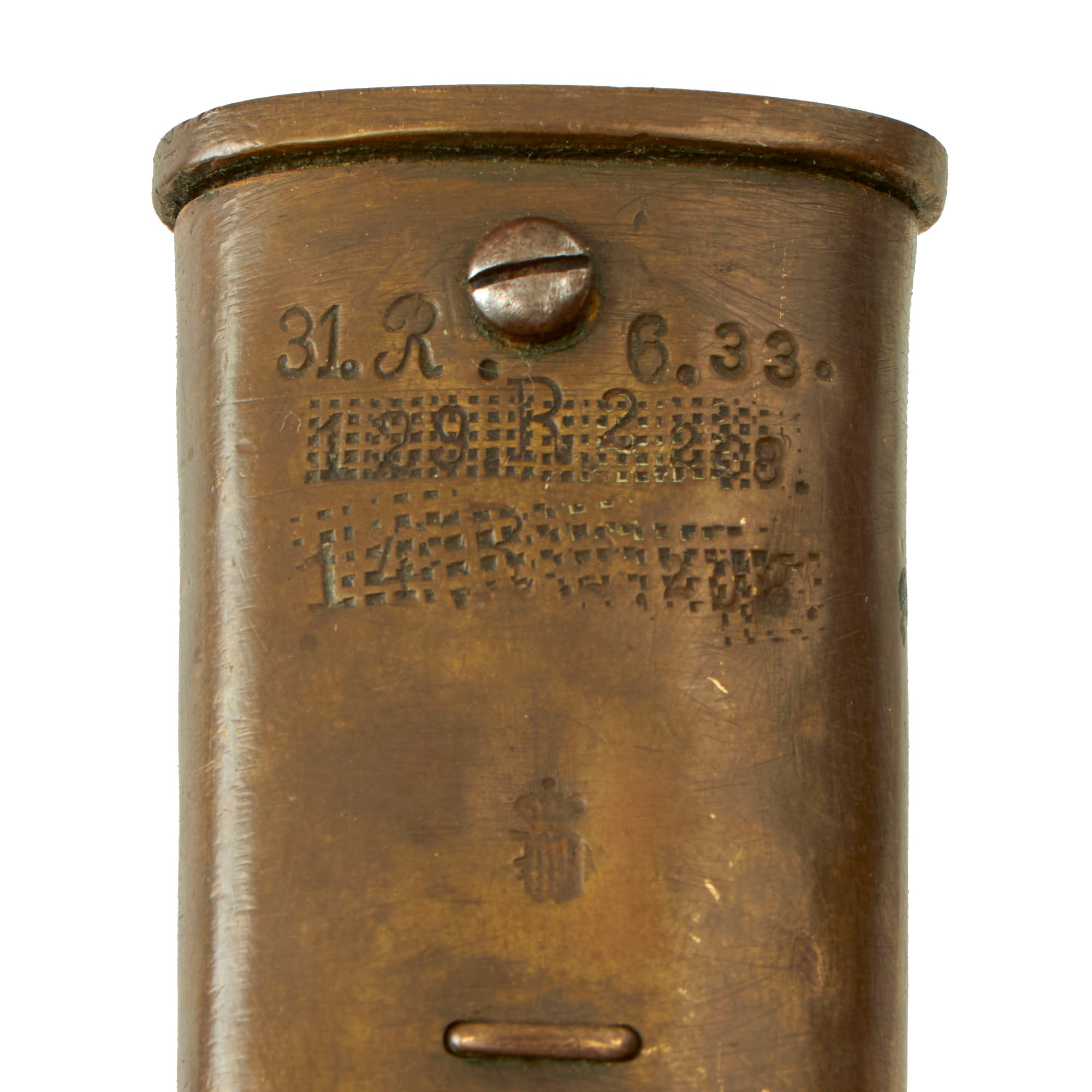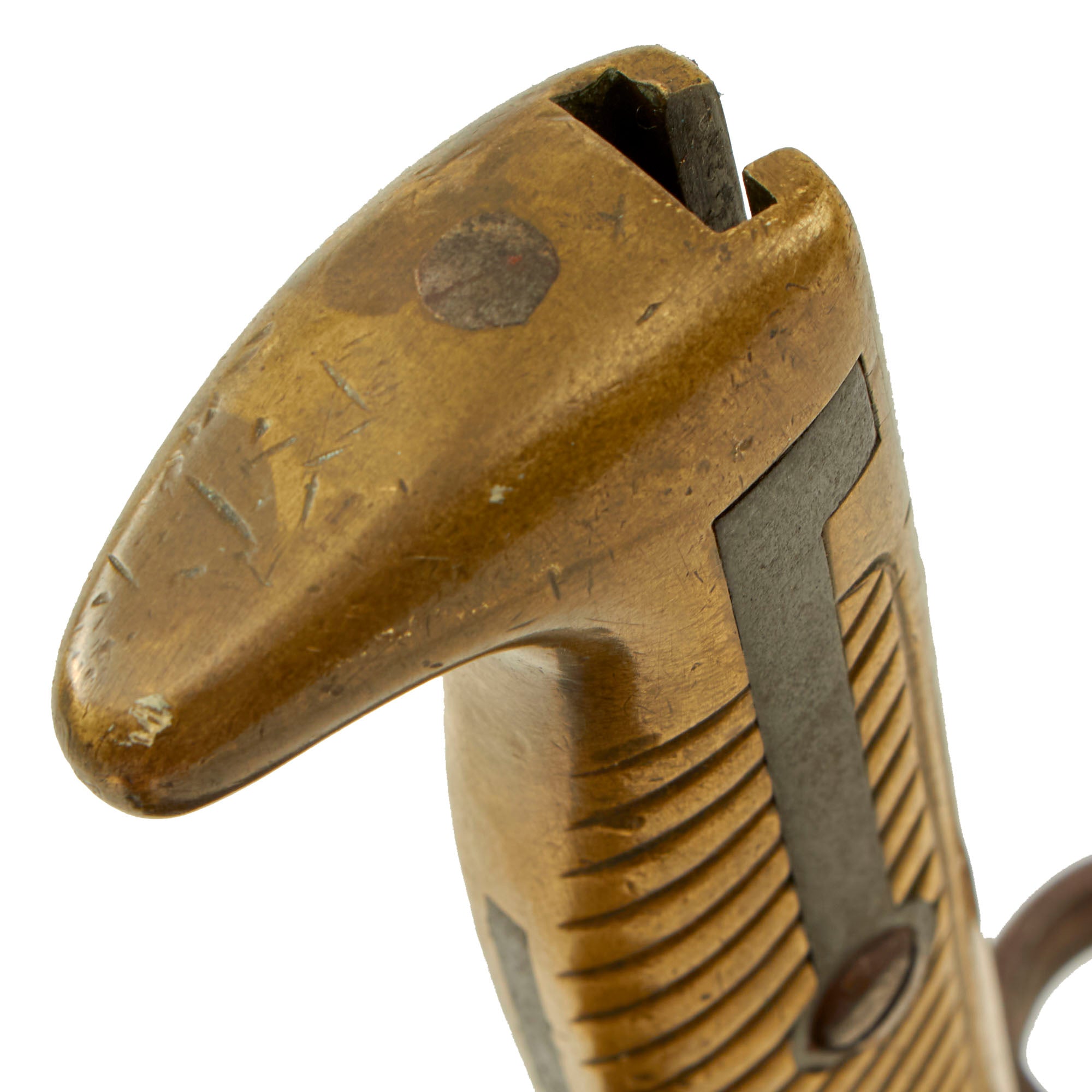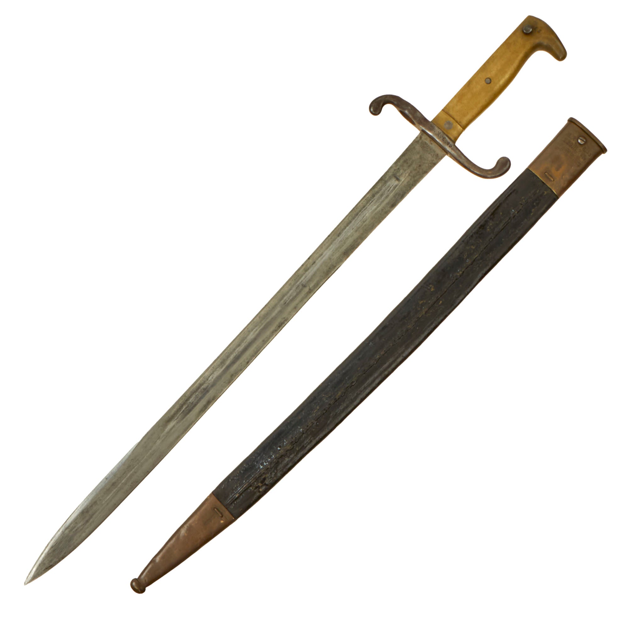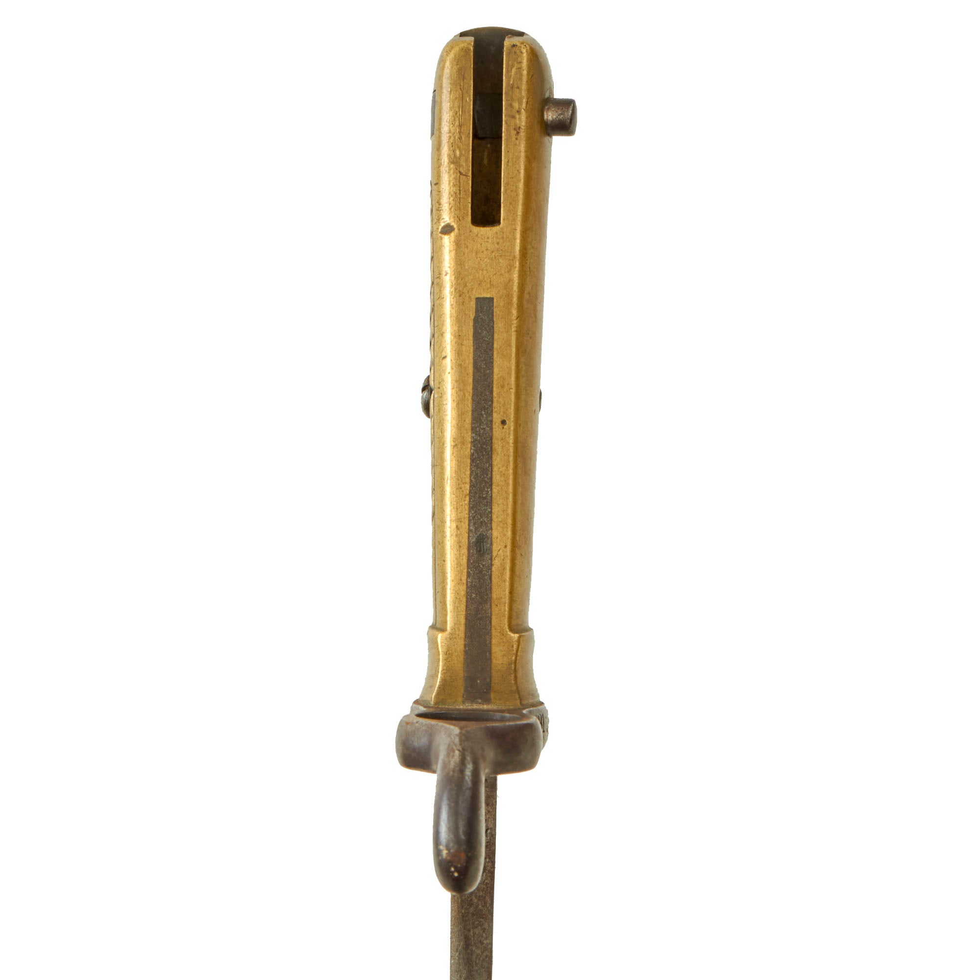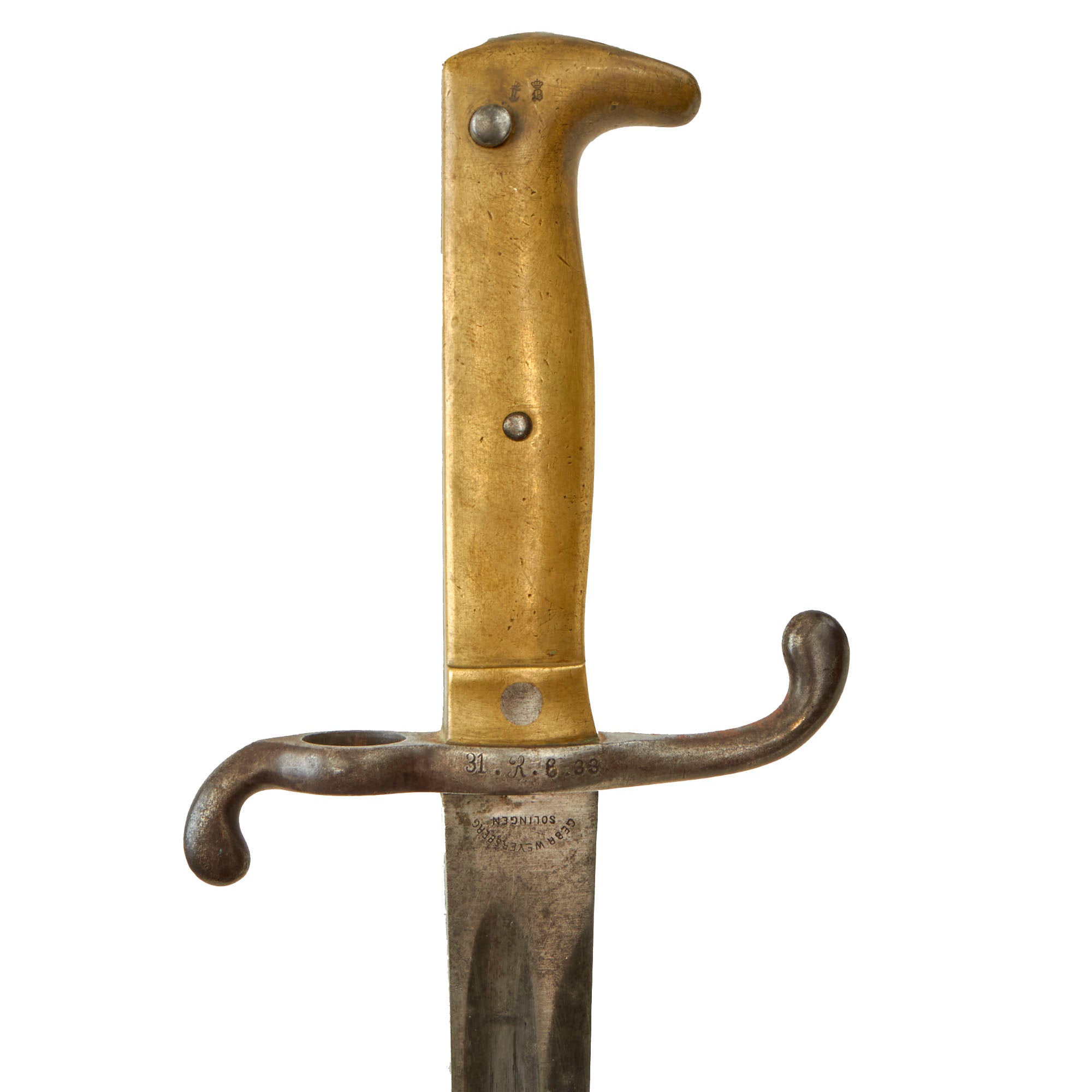 Original Item: Only One Available. This is a very good example of the Mauser Model 1871 rifle bayonet with brass hilt, complete with the original brass-fitted leather scabbard. The bayonet is in good condition, and is not marked on the rear of the blade with an 1875 year as well as the usual acceptance marks.