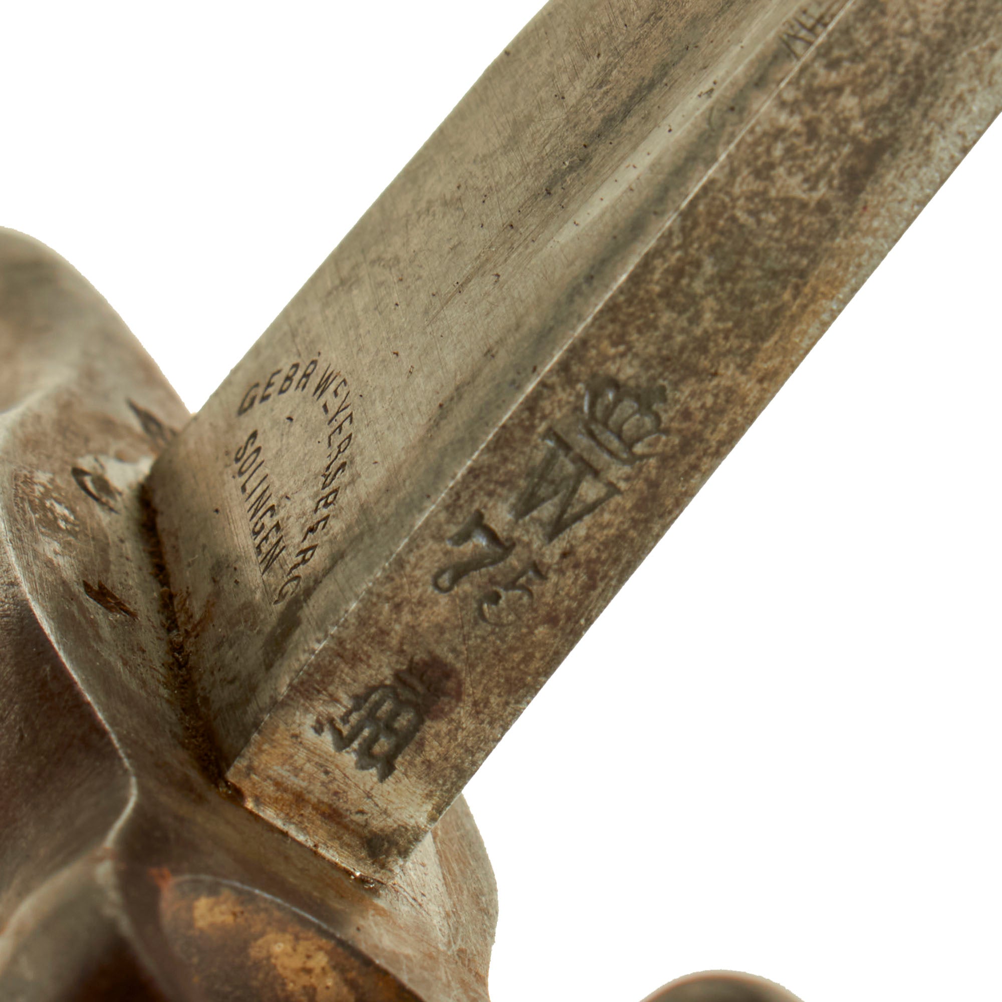 The blade ricasso is maker marked GEBR: / WEYERSBERG / [SOLINGEN], indicating manufacture by Gebrüder Weyersberg. Gebrüder Weyersberg, Waffenfabrik, was founded in 1787 by the brothers Johan William and Peter to manufacture sword and knife blades. By 1850 they were located on Kölnerstrasse in the Ohligs area of the City of Solingen. From 1859 onward they operated a factory on Hochstrasse in the same area. Called "The City of Blades", Solingen is a world-renowned edged weapon area, with a history dating back to the middle ages. The Weyersberg family itself had a history of swordmaking going back at least 6 generations. The company had numerous contacts and customers in Europe, and supplied weapons to Napoleon's army, as well as to the Prussian and Russian armies during the 19th century.