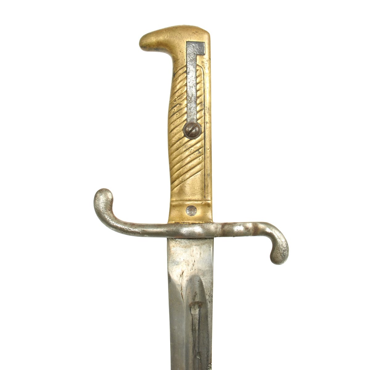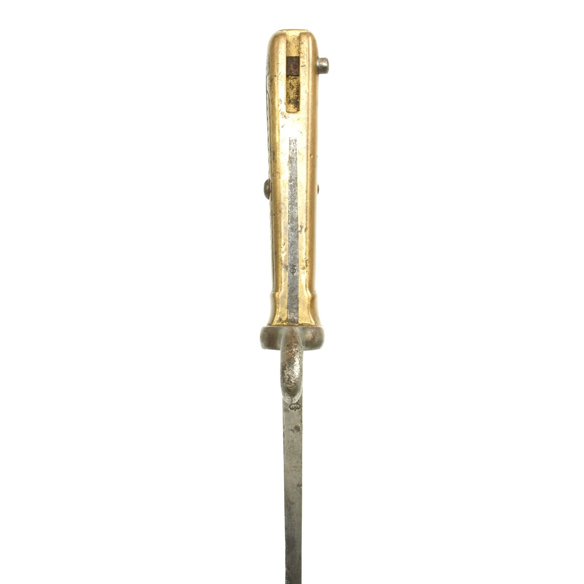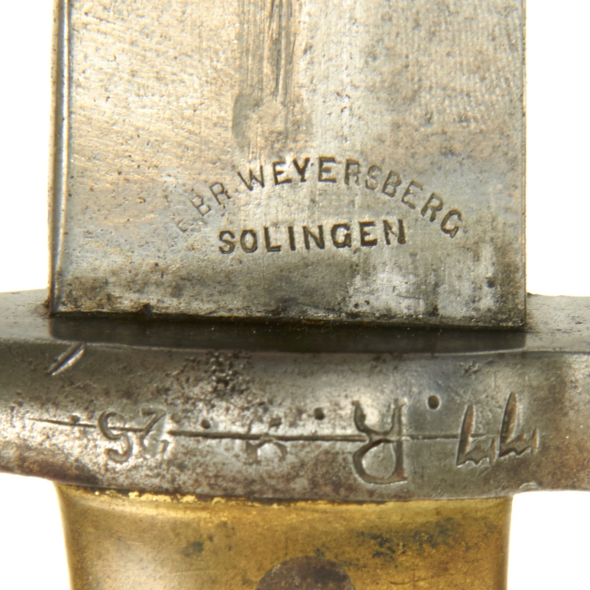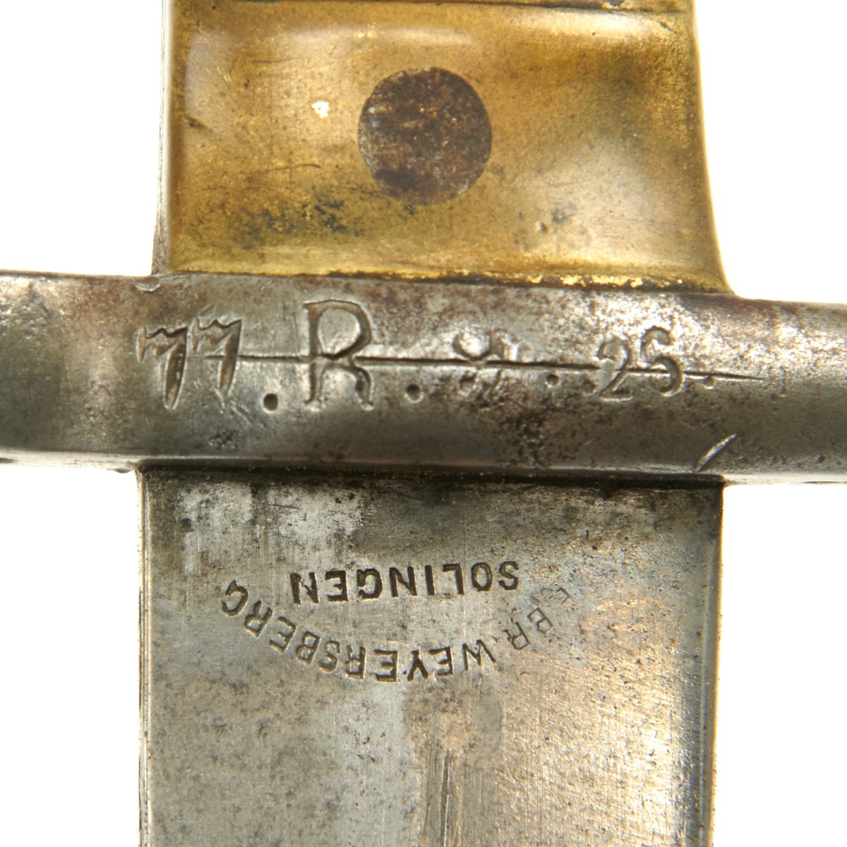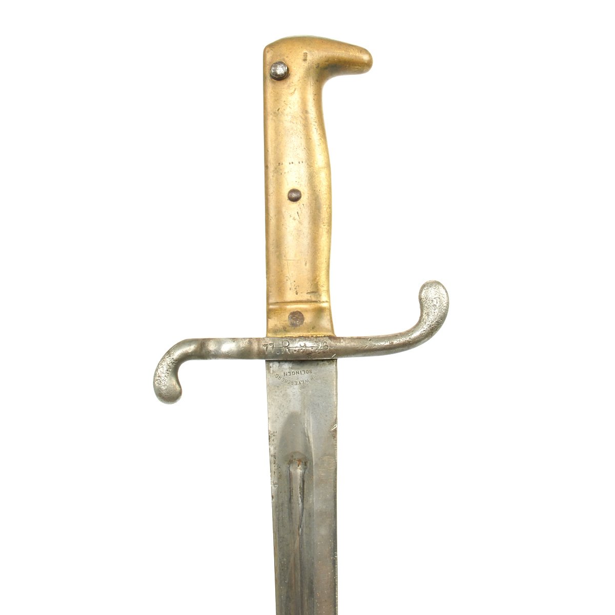Original Item: Only One Available. A very nice bayonet dated on the rear of the blade 1879 this is a Mauser M-71 rifle bayonet with brass hilt. It has a steel cross guard bearing regimental markings: 77.R.R.29.26.