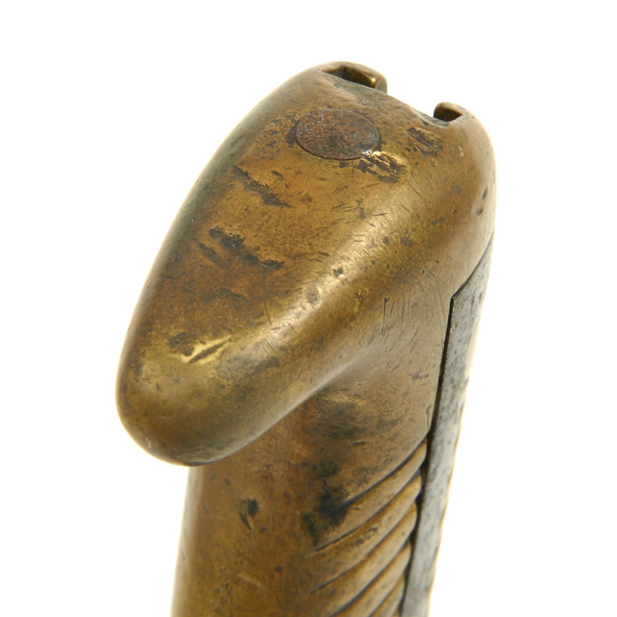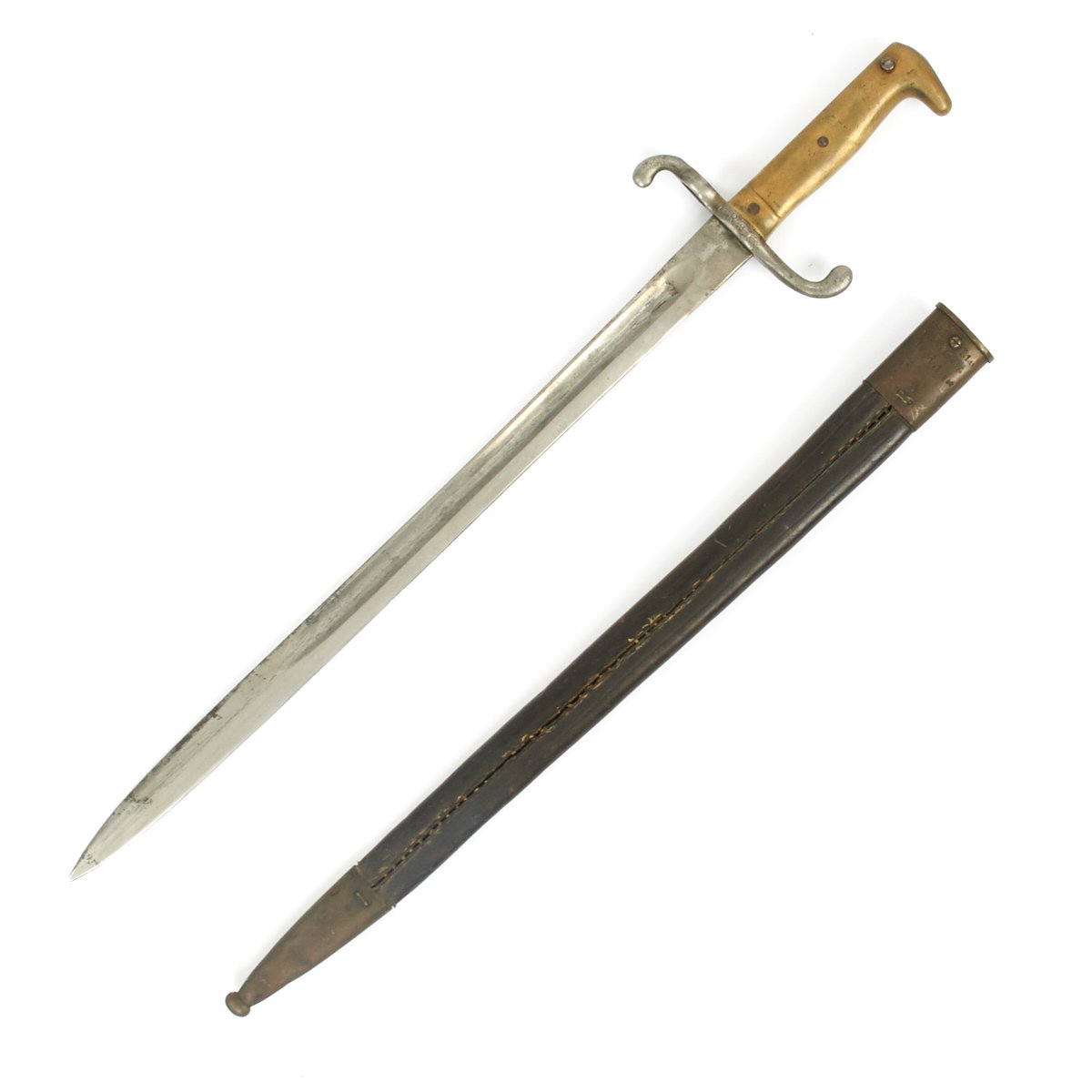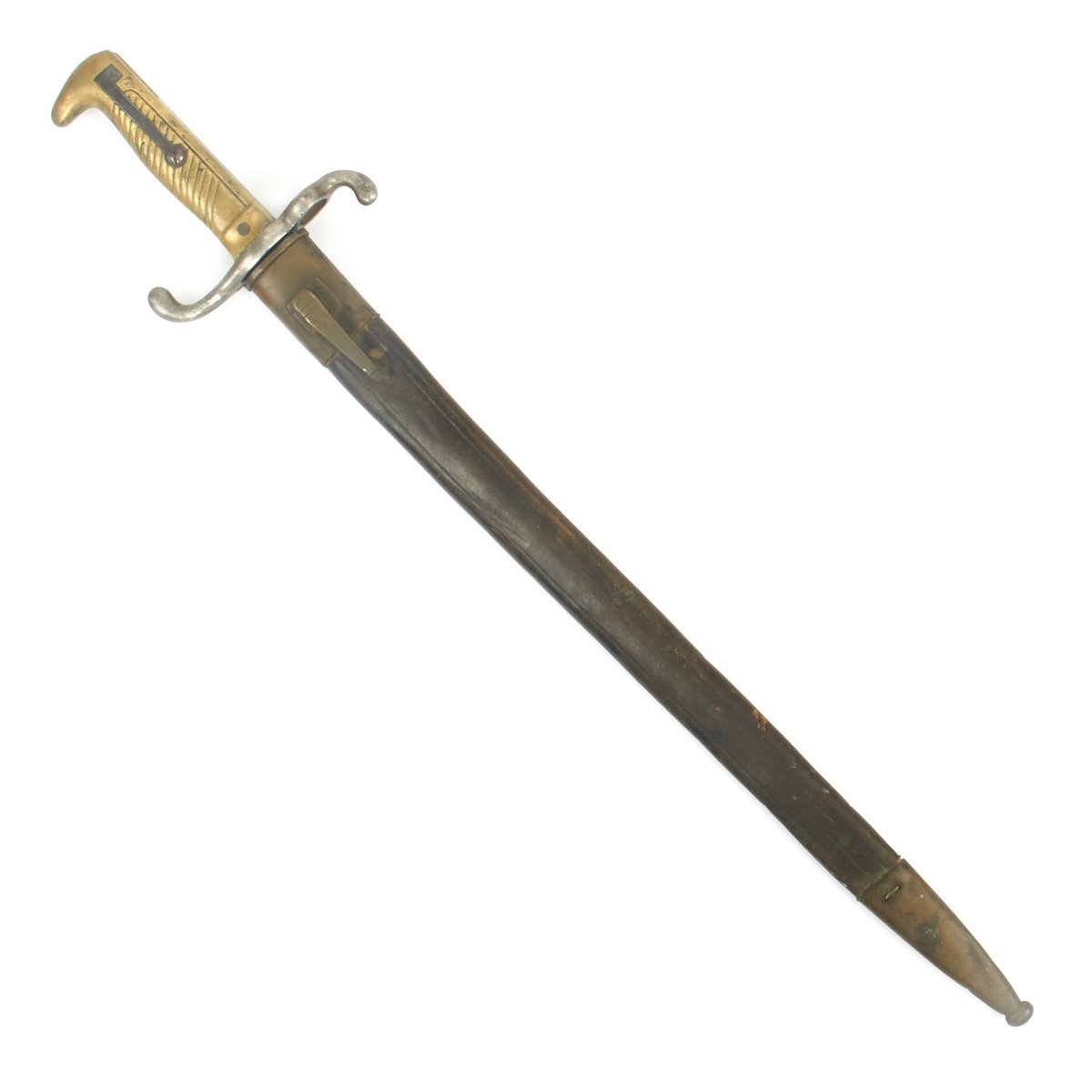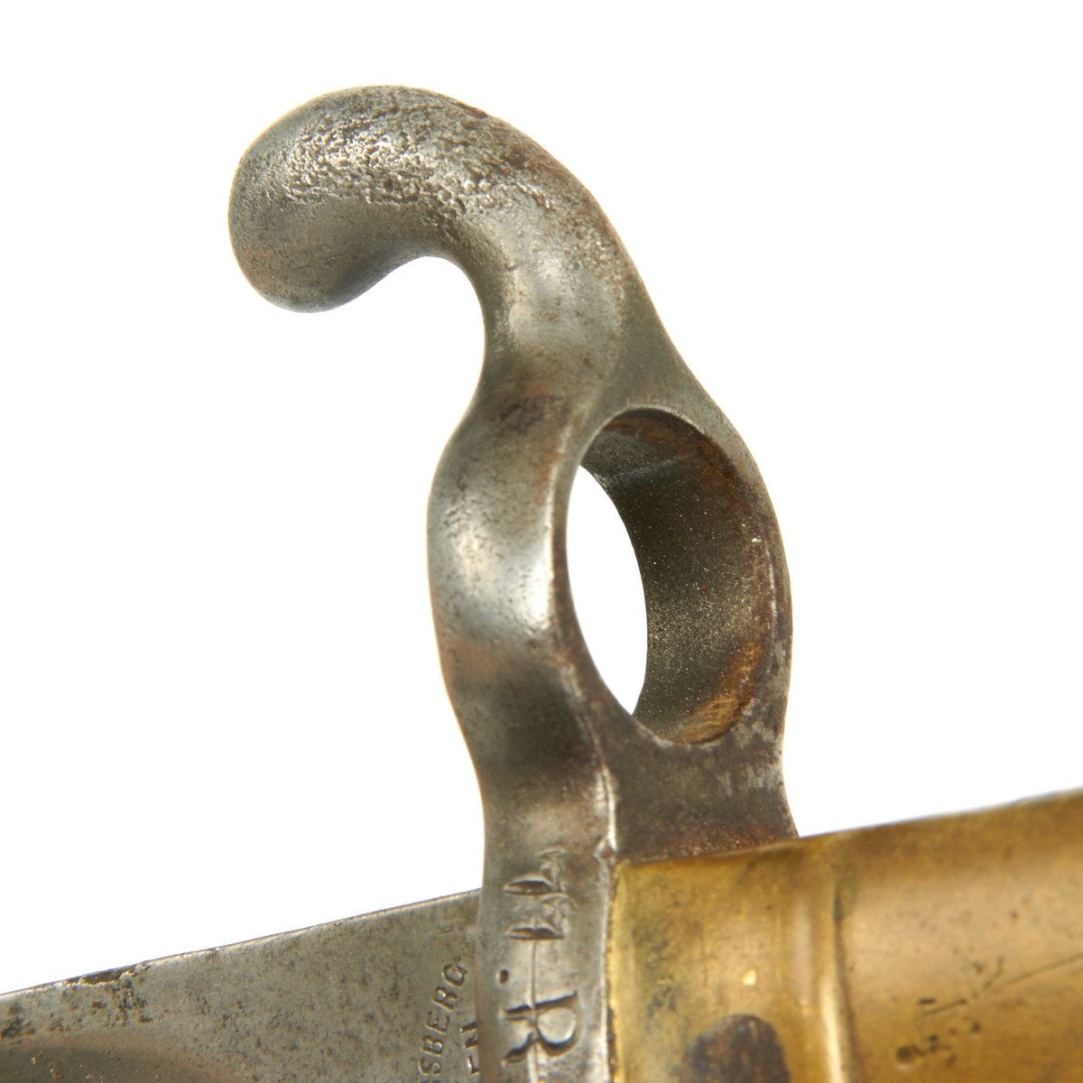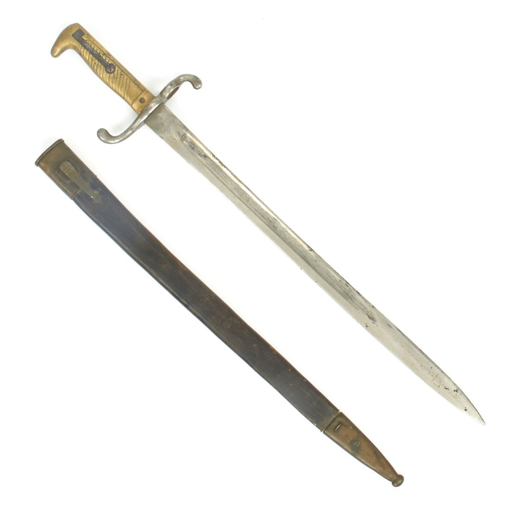 Original Item: Only One Available. A very nice bayonet dated on the rear of the blade 1879 this is a Mauser M-71 rifle bayonet with brass hilt. It has a steel cross guard bearing regimental markings: 77.R.R.29.26.
