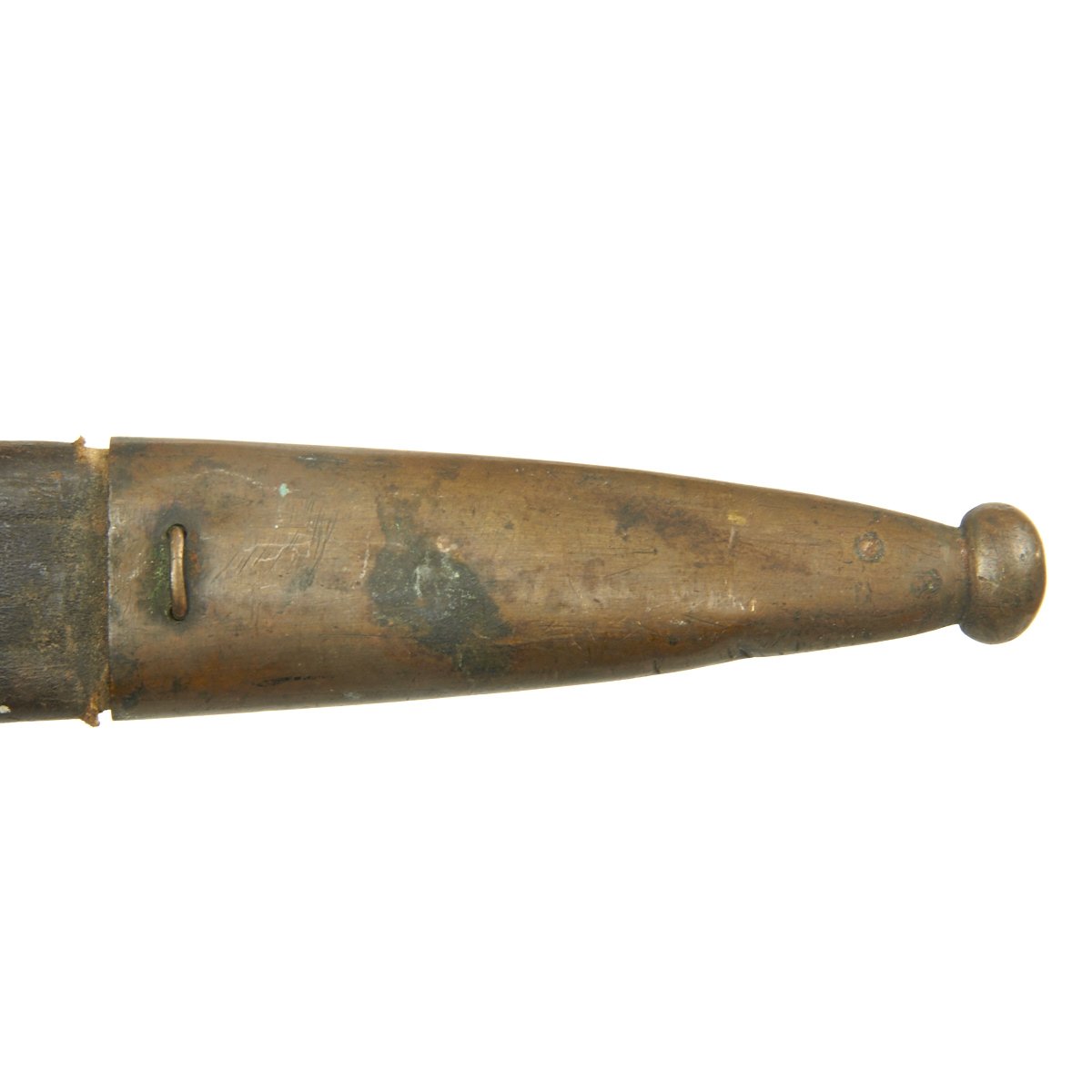 The bayonet comes complete with its original brass mounted black leather scabbard bearing multiple regimental markings. Overall offered in very good condition.