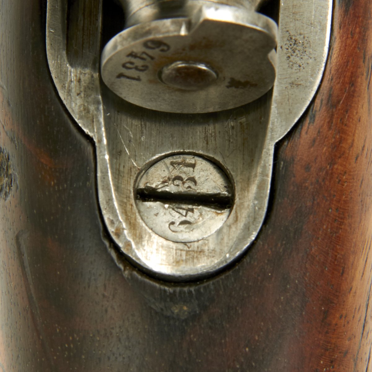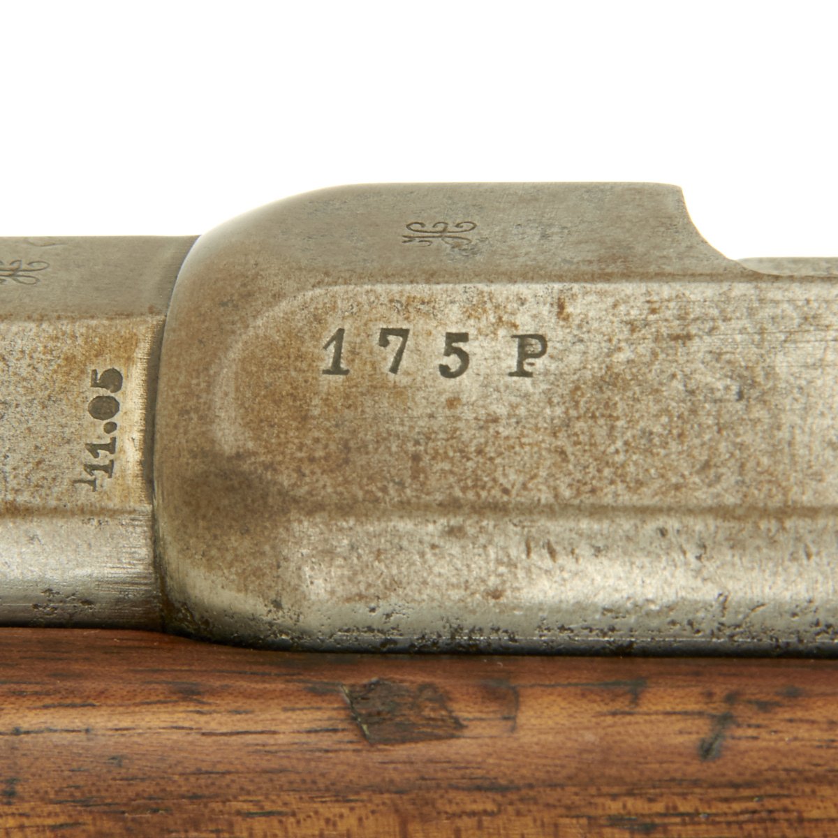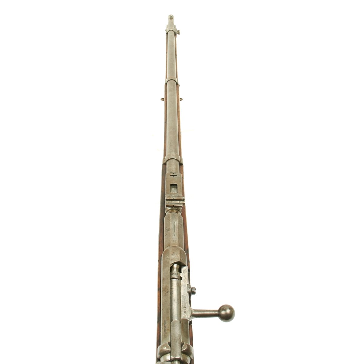 This rifle is dated 1874 on the receiver, and bears serial number 175P on the receiver and barrel breech. All the components of the bolt, barrel bands, nose cap, receiver tang screw, and other screws are marked with serial number 6431. The Barrel knoxform is marked ŒSTERR. WAFFFB. GES., an abbreviation of "Österreichische Waffenfabriksgesellschaft", or the Austrian Arms-Manufacturing Company. It is possible that the barrel and receiver were made under contract, and then sent to Mauser or Spandau for completion, which explains the two different serial numbers. Part of ŒWG was Steyr-Mannlicher, who still make firearms today.