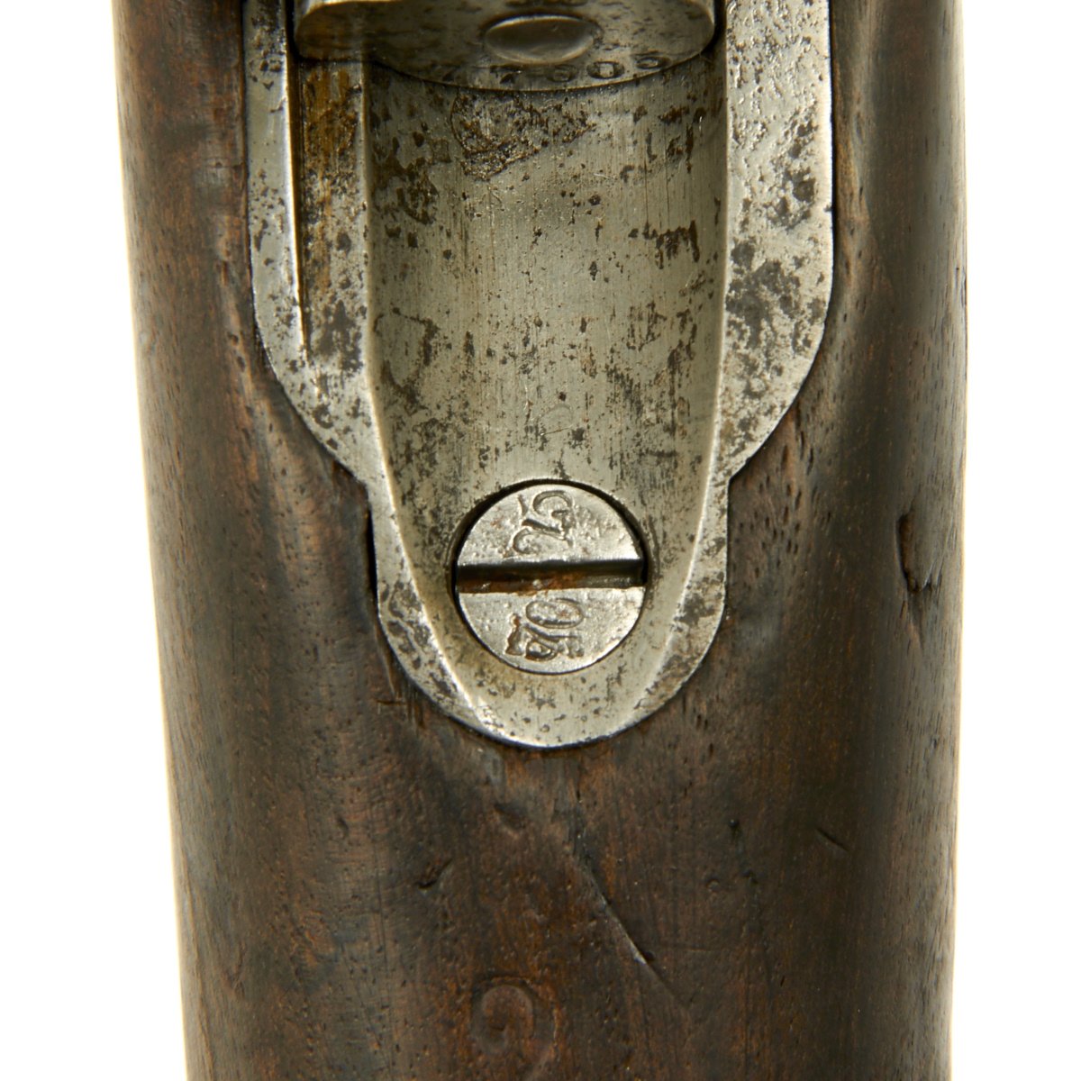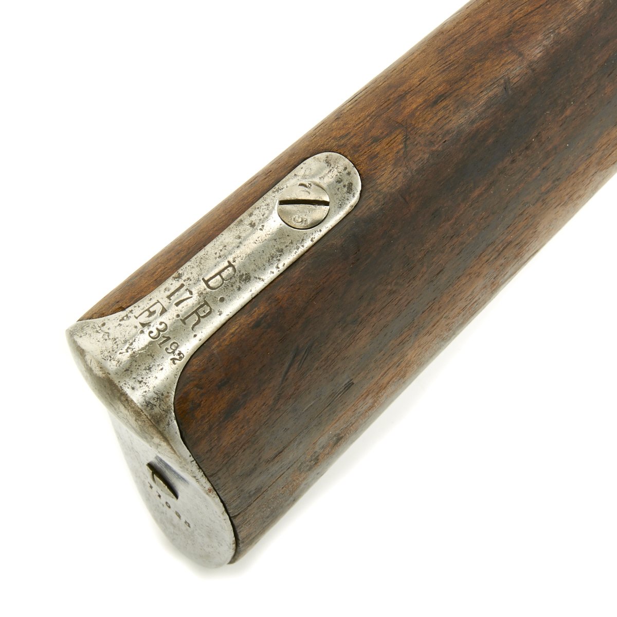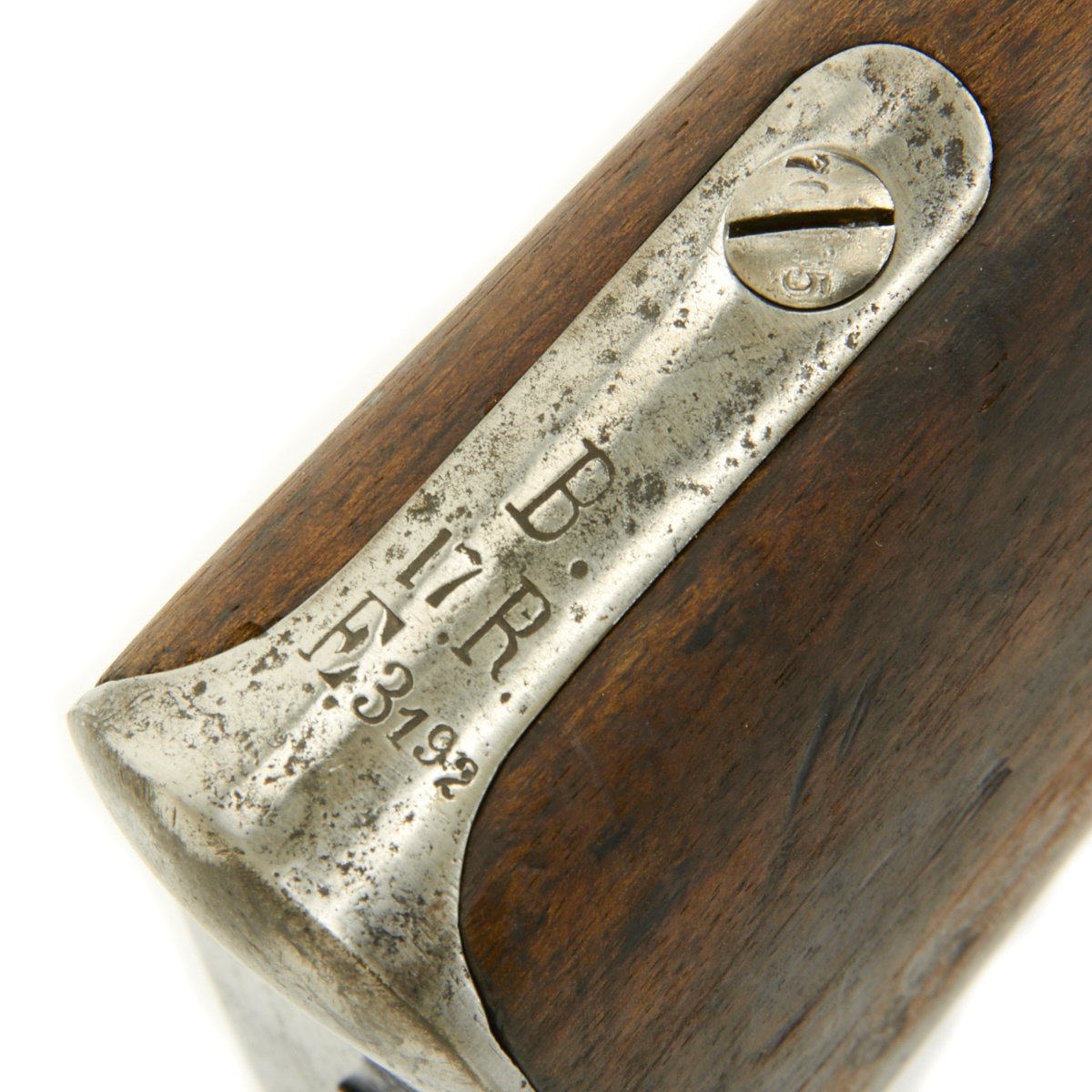Complete with cleaning rod the rifle is in good condition overall. The exterior metal finish does show evidence of past pitting, and wood stock does have noticeable wear on it. The bore however is in excellent condition, bright with clear land and grooves. No corrosion is evident in the bore. The Rifle bears its original REGIMENTAL MARKINGS on the butt plate tang:- " B.17.R.E3.192 "