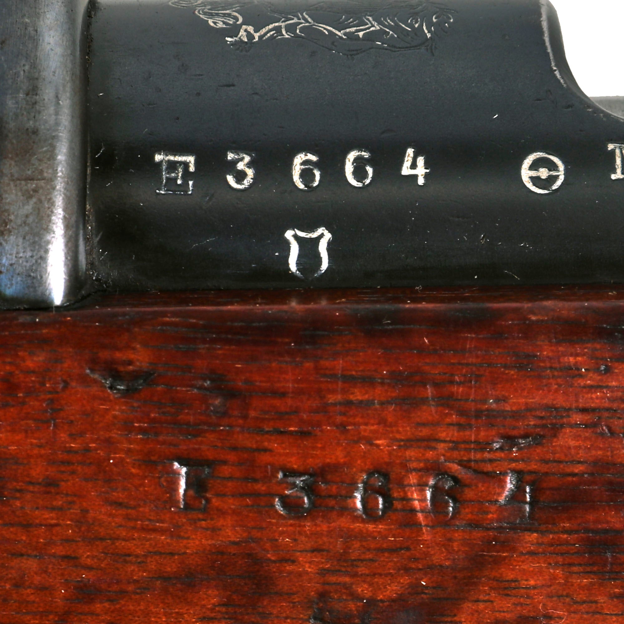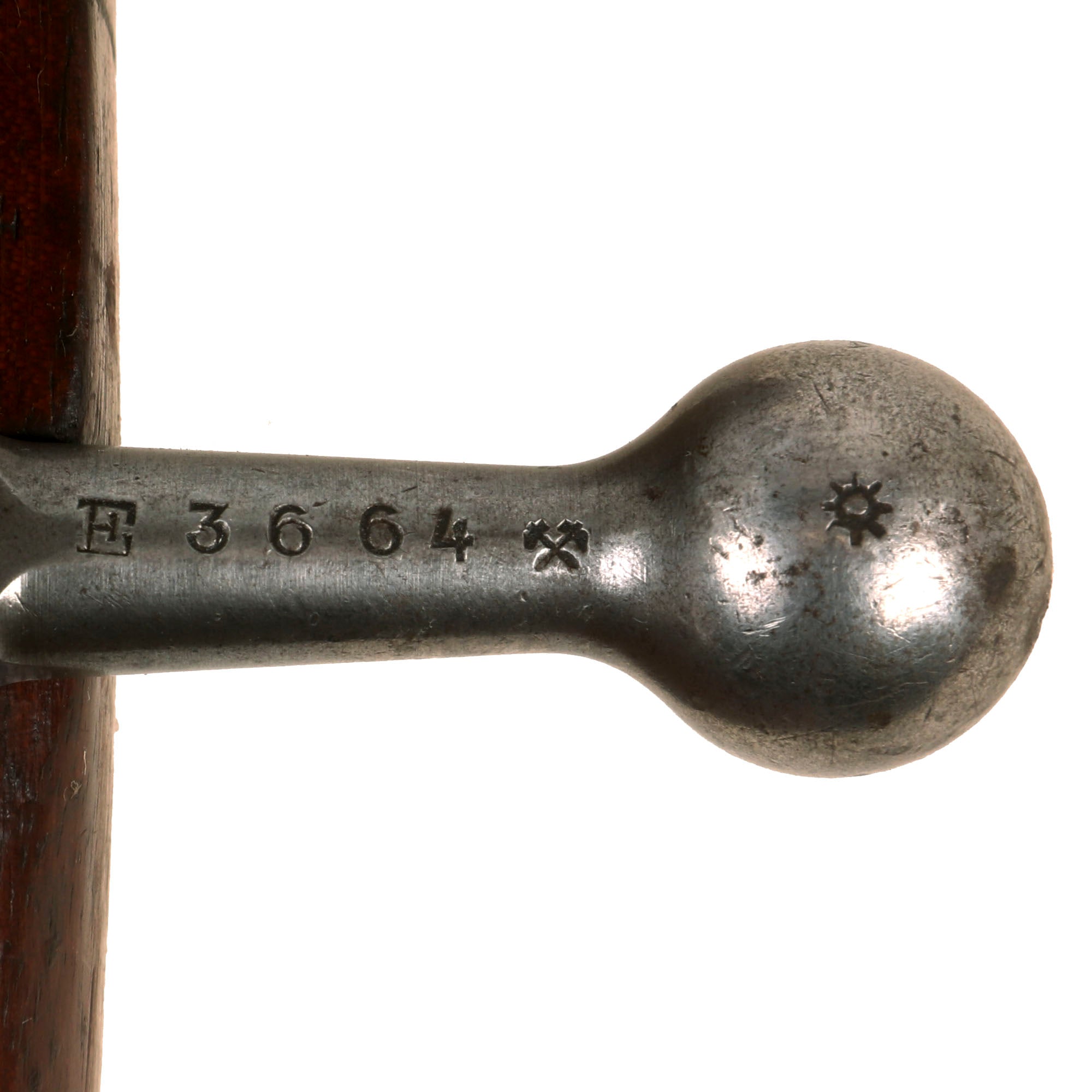 To the left of this is serial number E 3664, which is also stamped on the bolt, magazine housing, and the stock, as is correct. The shortened serial number 64 is present on many of the smaller components as well. The only non-matching component is the cleaning rod (marked E 1755), probably swapped out during cleaning when in service. This is an excellent "MOSTLY MATCHING" example, with no functional parts swapped out over the years.