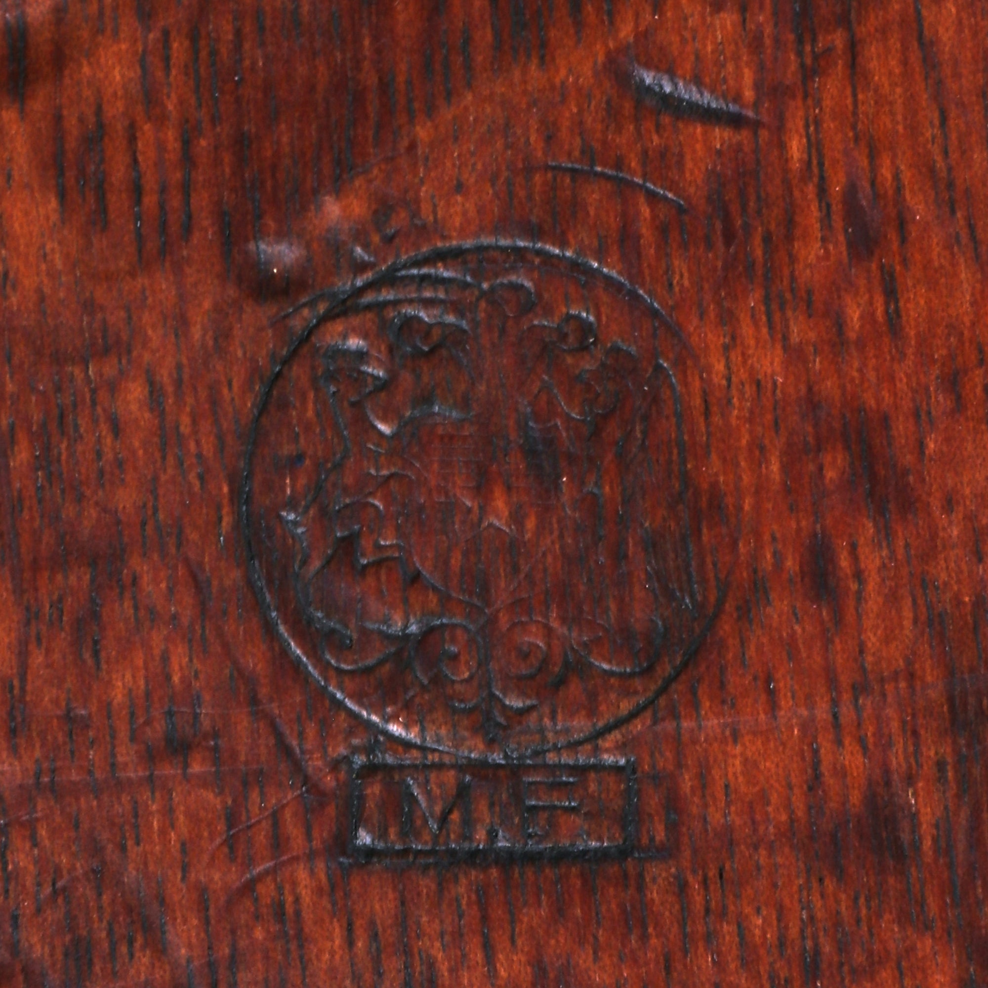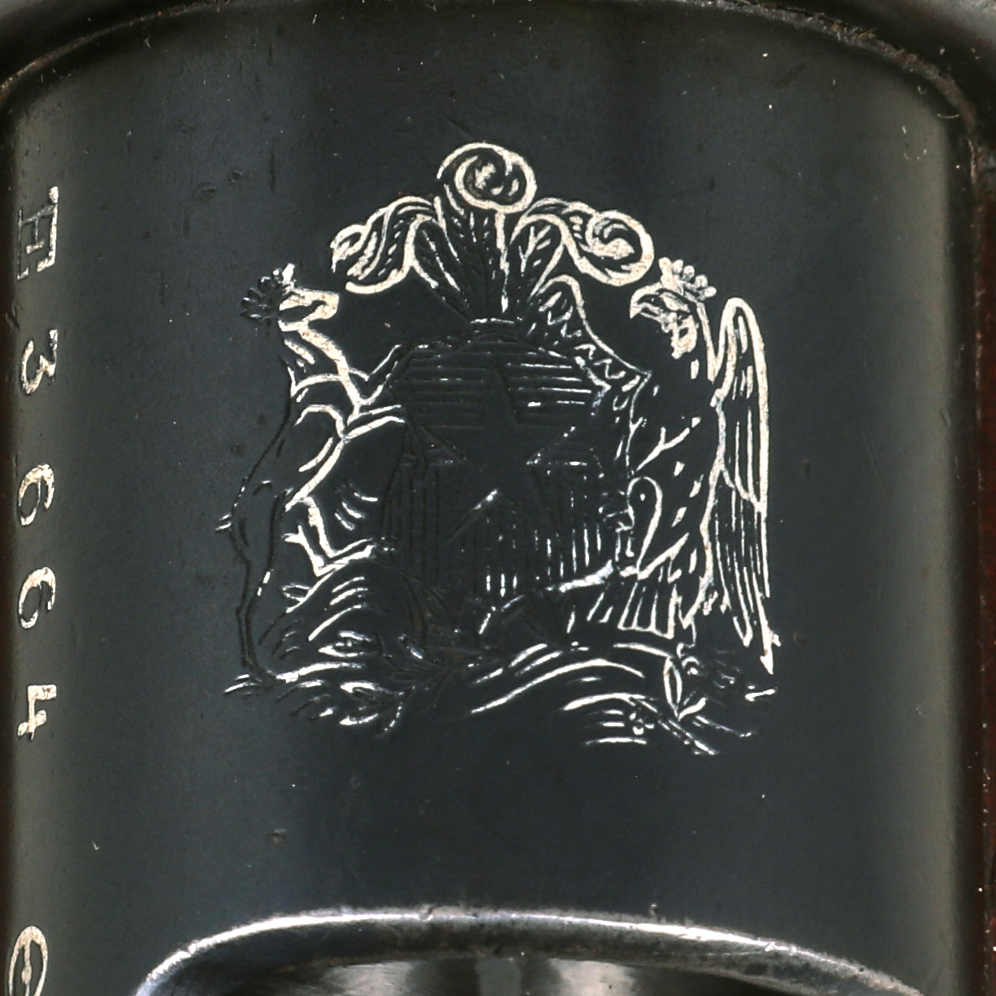The chamber ring has a Chilean coat of arms marked on it, and there is even a crisp Chilean coat of arms Cartouche over M.F. on the left side of the butt stock, a marking that may indicate that the stock was replaced at some point. There is unfortunately no consensus on what the marking means. The stock has a lovely red brown color due, and shows light wear from storage and service, but no major structural damage. There are the expected dents, scratches, and dings, especially on the left side of the butt stock, which looks like it was banging against something long term. There is also scattered light staining as well, which we have left in place to preserve the patina.