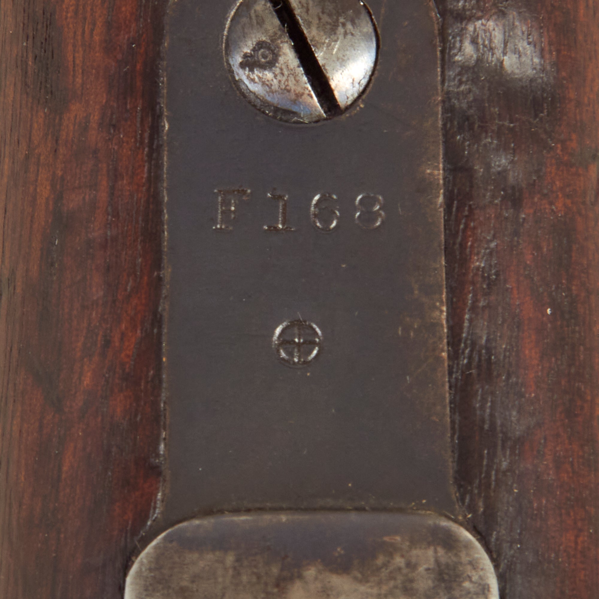 To the left of this is serial number F 168, which is also stamped on the bolt, magazine housing, and the stock, as is correct. The shortened serial number 68 is present on many of the smaller components as well. The only non-matching component is the cleaning rod, which was probably replaced some time ago,