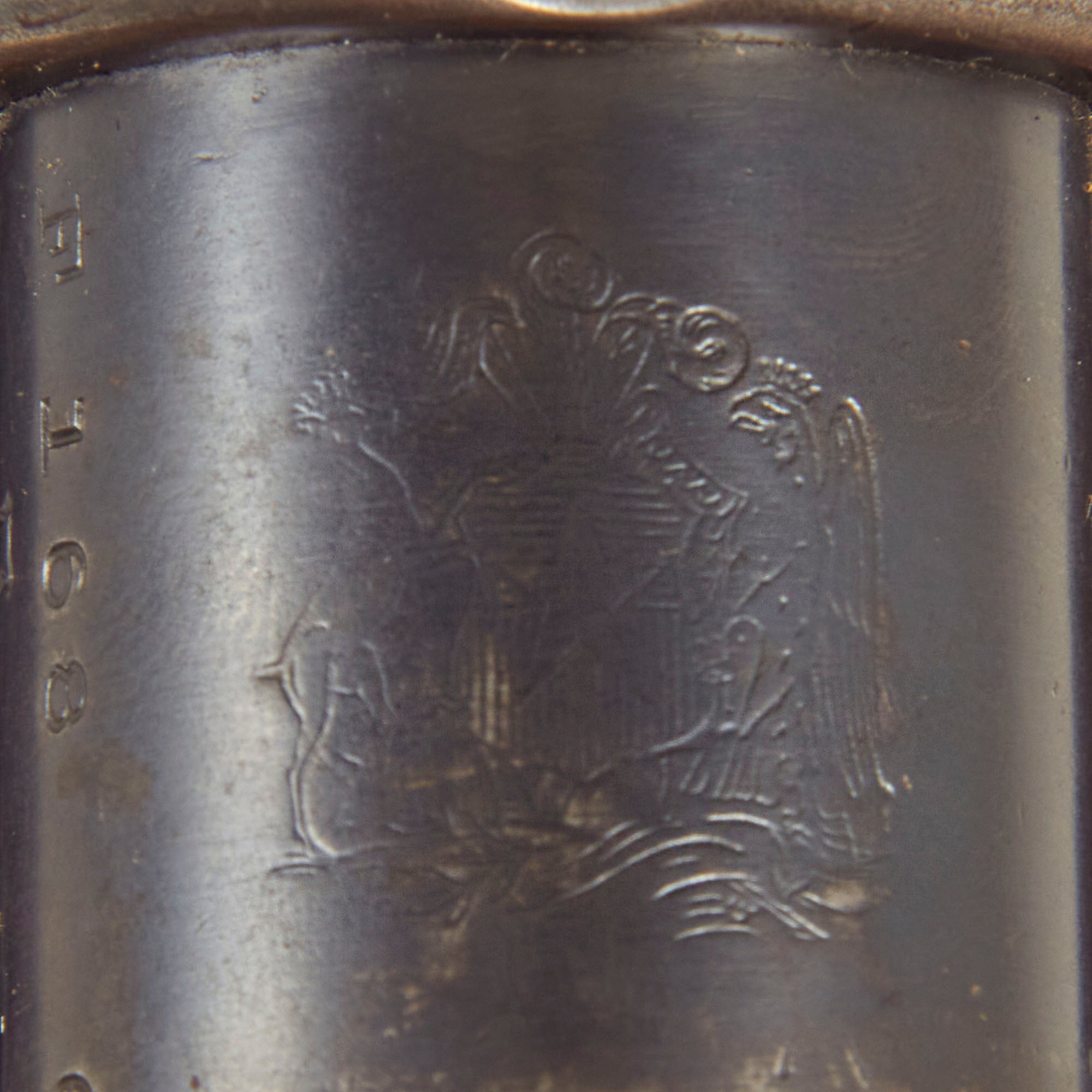 The chamber still has the Chilean coat of arms marked on it, and there is a clear Chilean coat of arms Cartouche over M. E. on the left side of the butt stock. The metalwork still shows a lot of the original dark blued finish, especially on the receiver, while the barrel and other components show more wear, with some staining and minor peppering. The bright steel bolt shows a bit of staining and oxidation, however the "niter blue" on the magazine follower is still over 80% intact. The stock shows numerous dings, dents, and small gouges from service, but no signs of having been reconditioned at arsenal, giving it a fantastic service worn look.