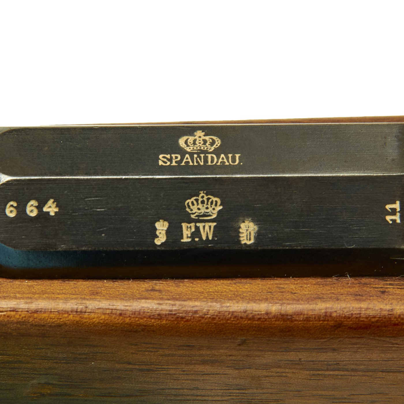 The top of the chamber is marked Crown over SPANDAU, for the Prussian (and later Imperial) Spandau arsenal in Berlin, a storied production plant that would produce weapons up until 1919, including the famous MG08 Maxim. Below this is the Crown over FW proof for Kaiser Wilhelm I, who used this cypher during his reign 1861-1888